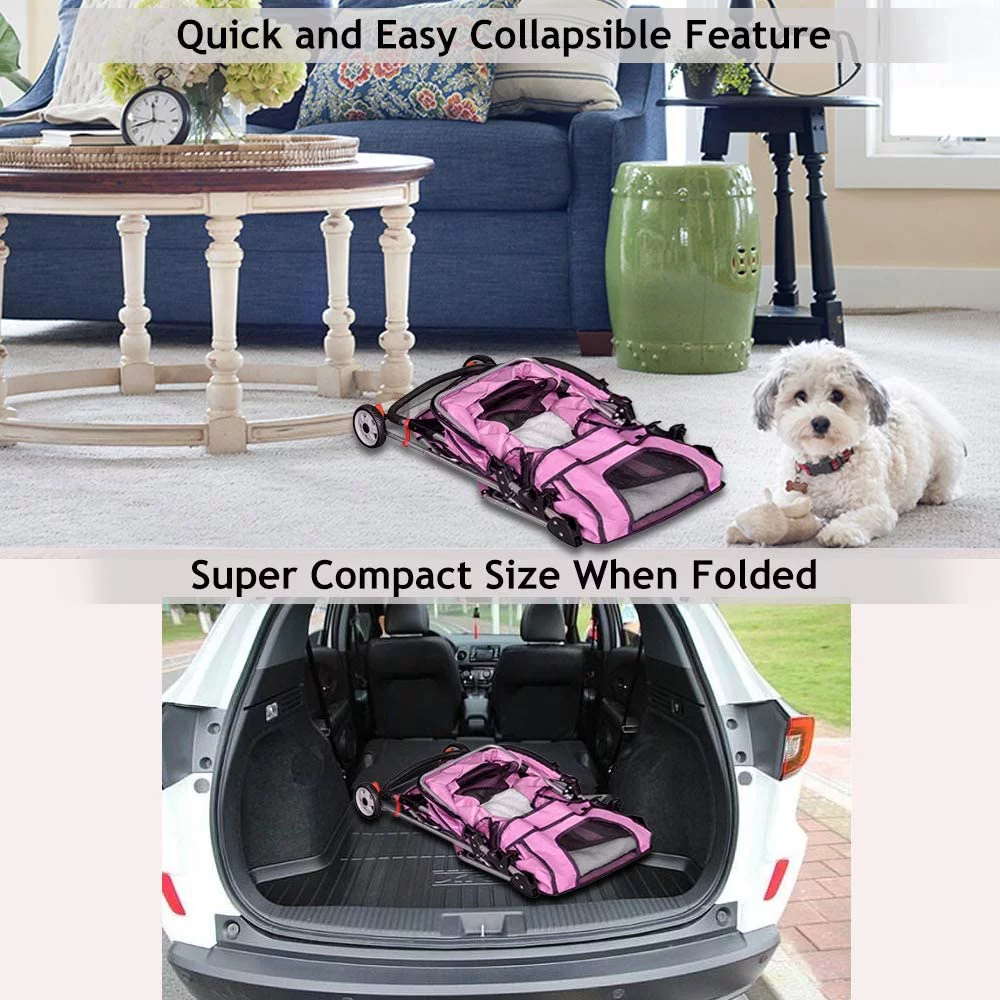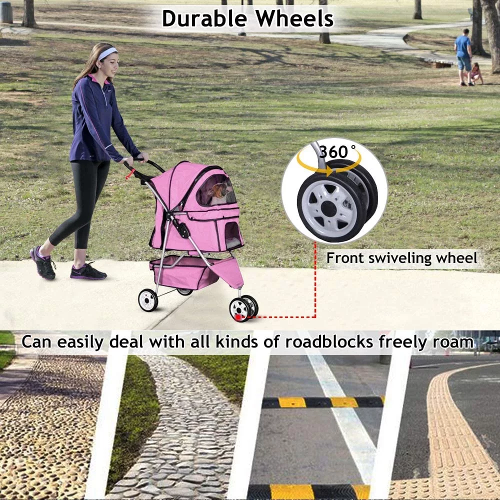 3 Wheel Dog Stroller Folding Pet Stroller Travel Dog Carriers for Small Dogs with Free Pad & Cup Holder, Pink