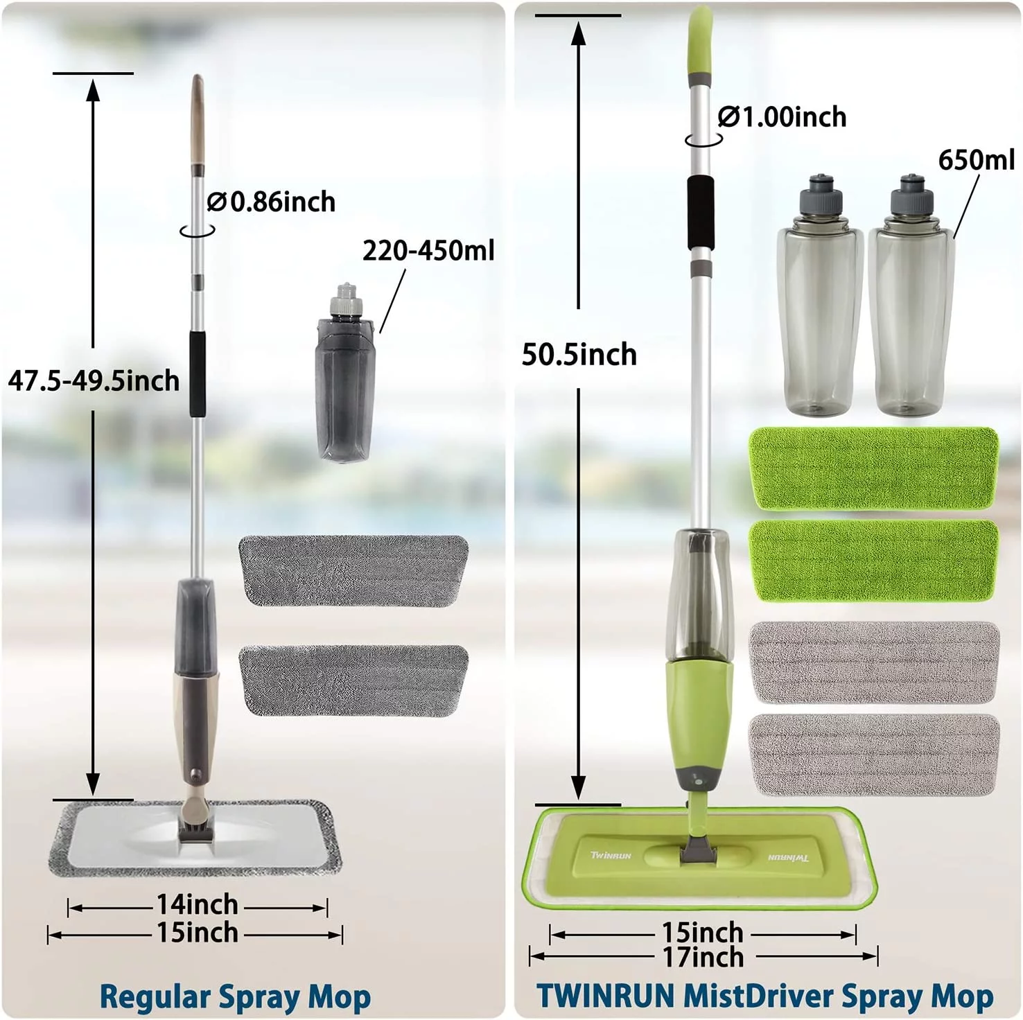 TWINRUN Microfiber Spray Mop for Floor Cleaning with 2 Refillable Water Bottles 4 Washable Mop Pads, 650 ml