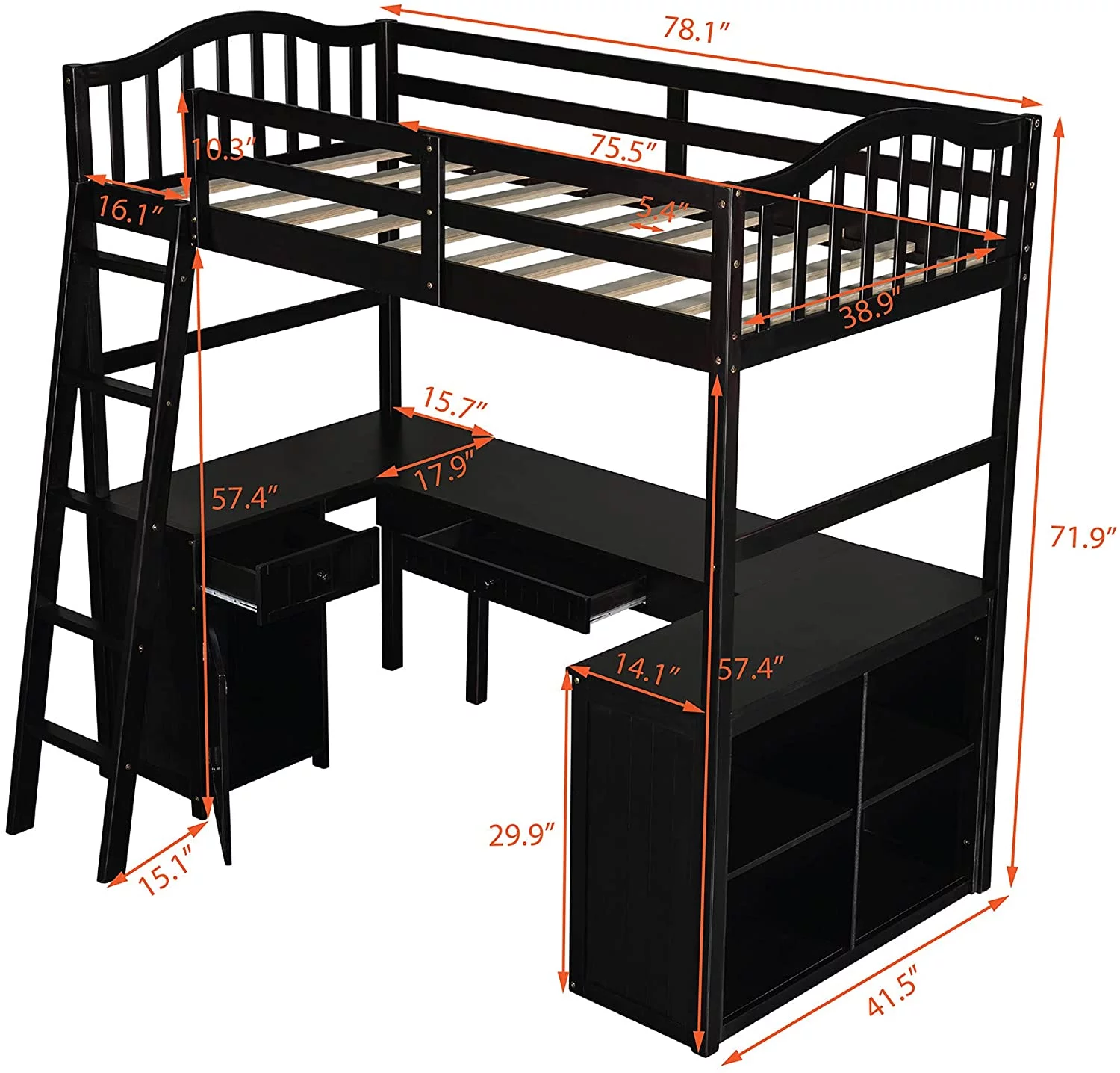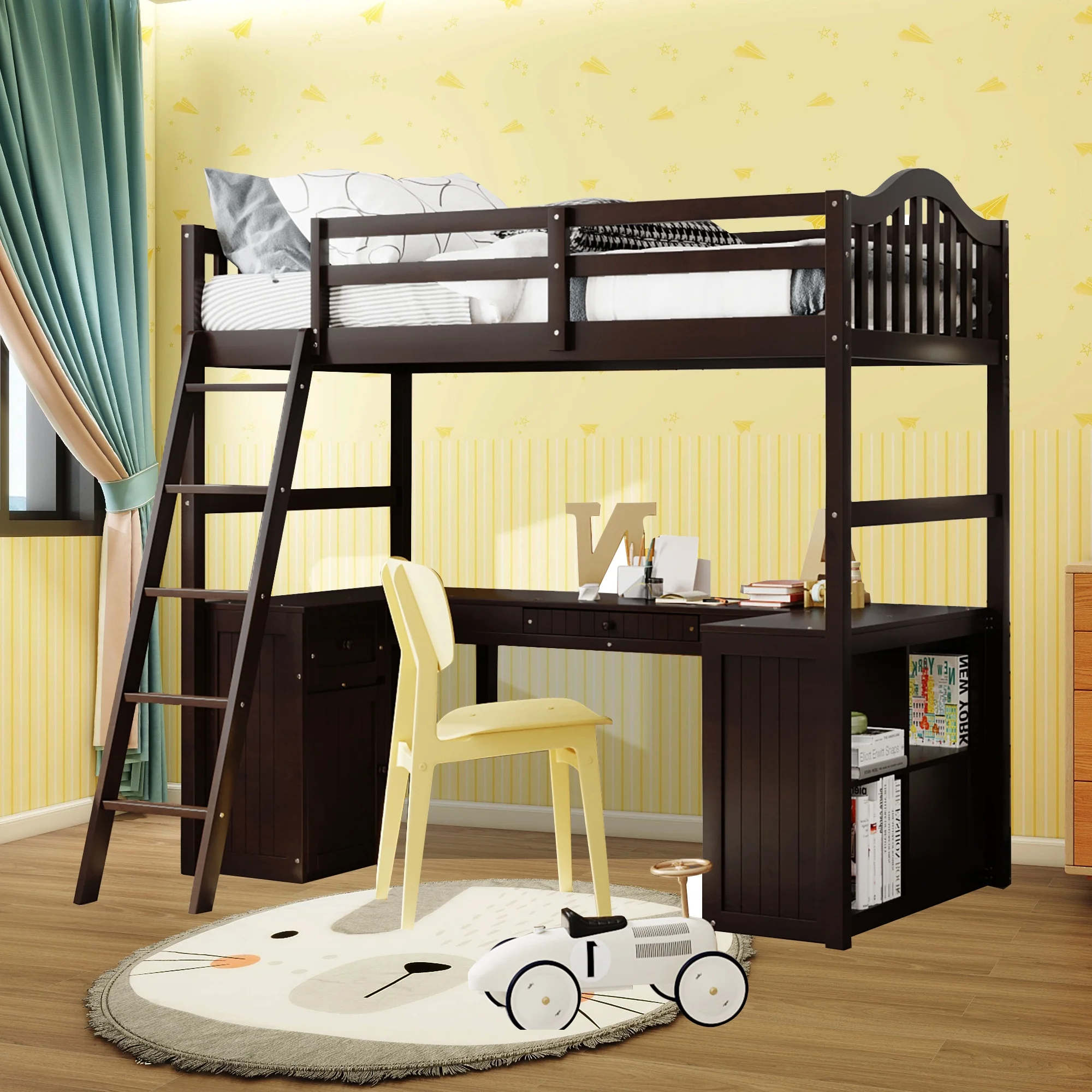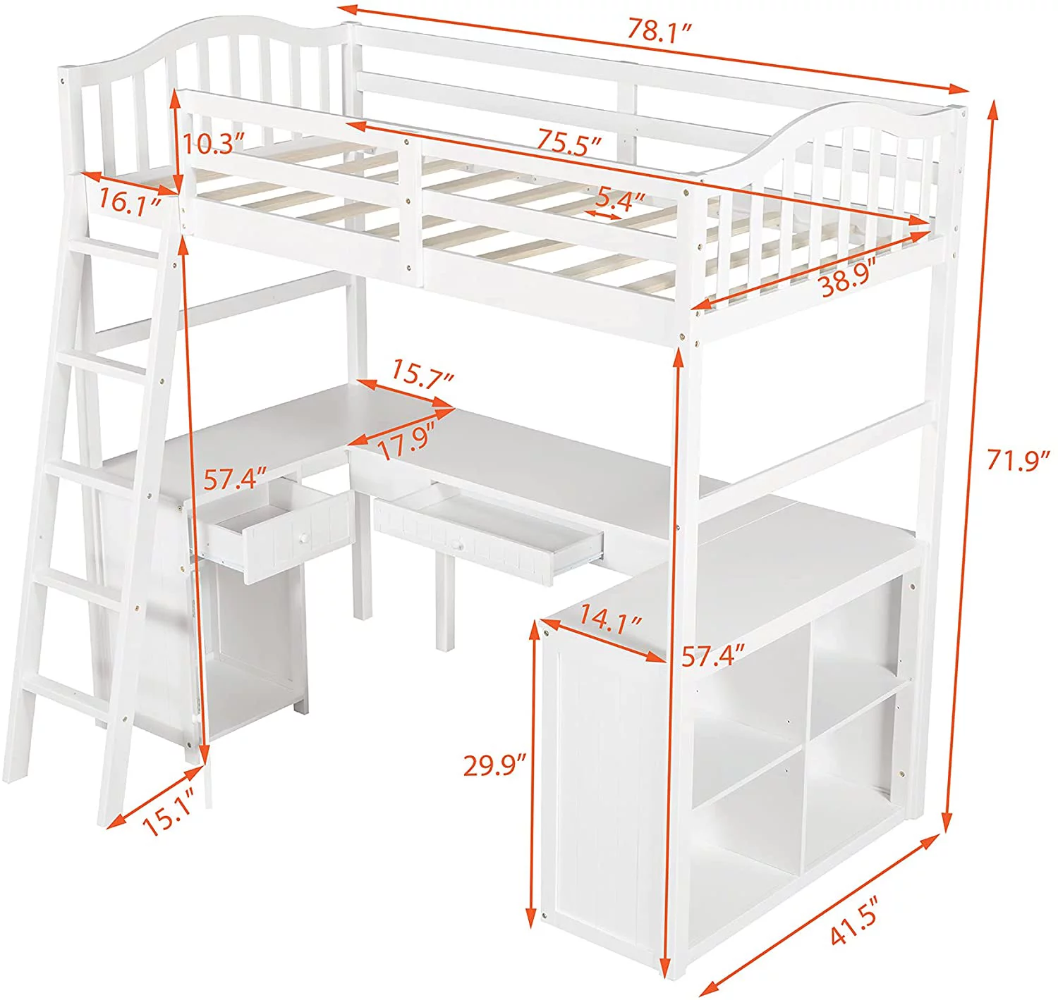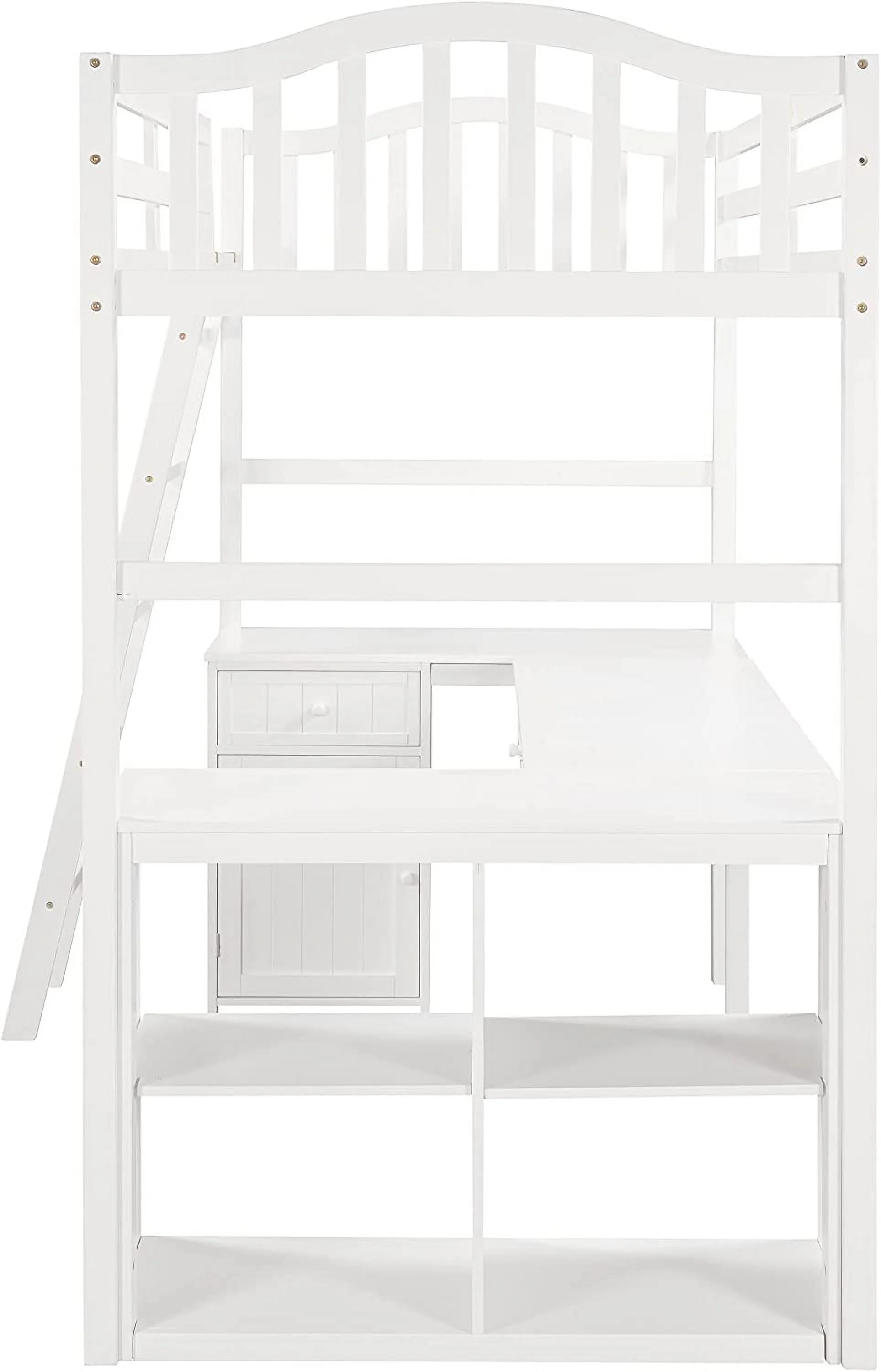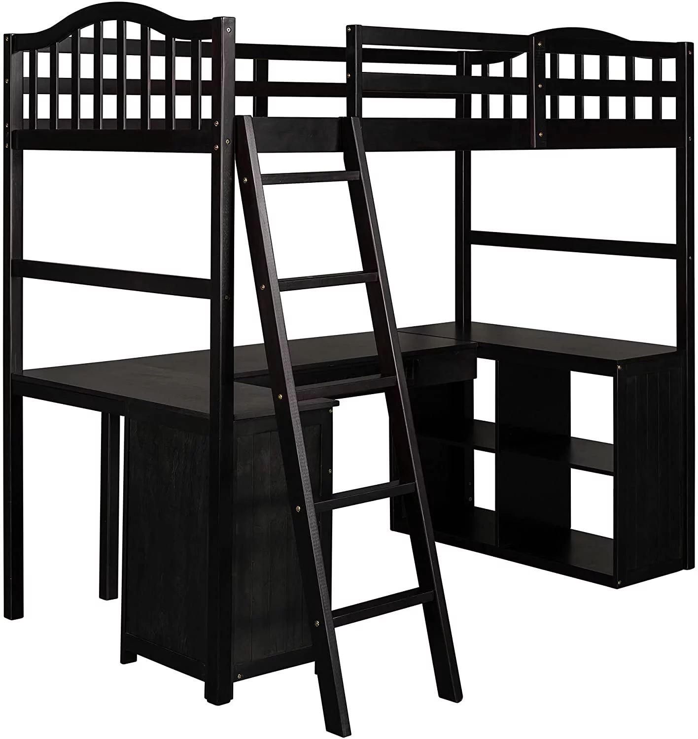 Twin Loft Bed with Desk Bookcase Storage Cabinet, Solid Wood Slat Bed Frame with Writing Board Ladder for Child Kids Teens
