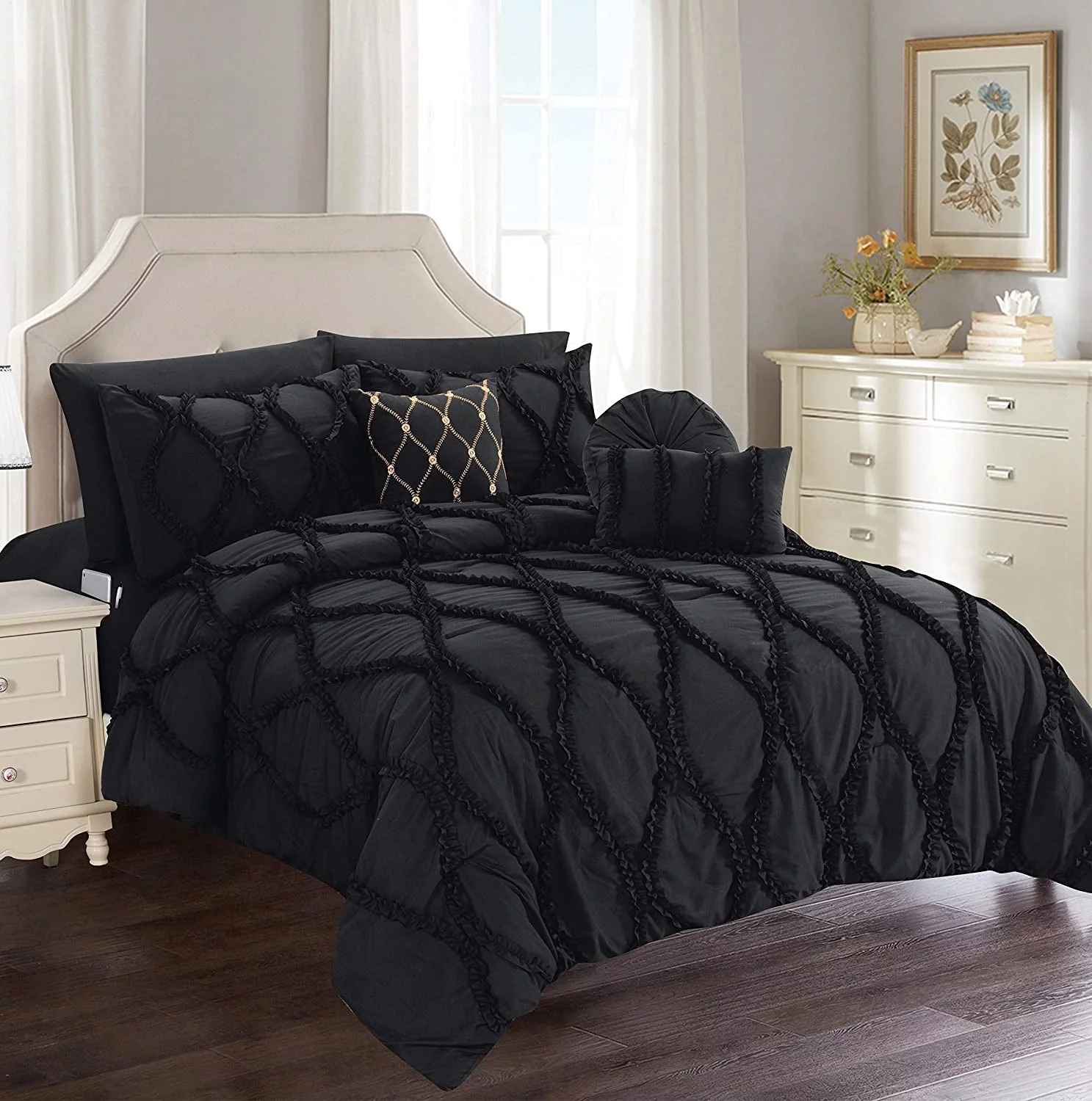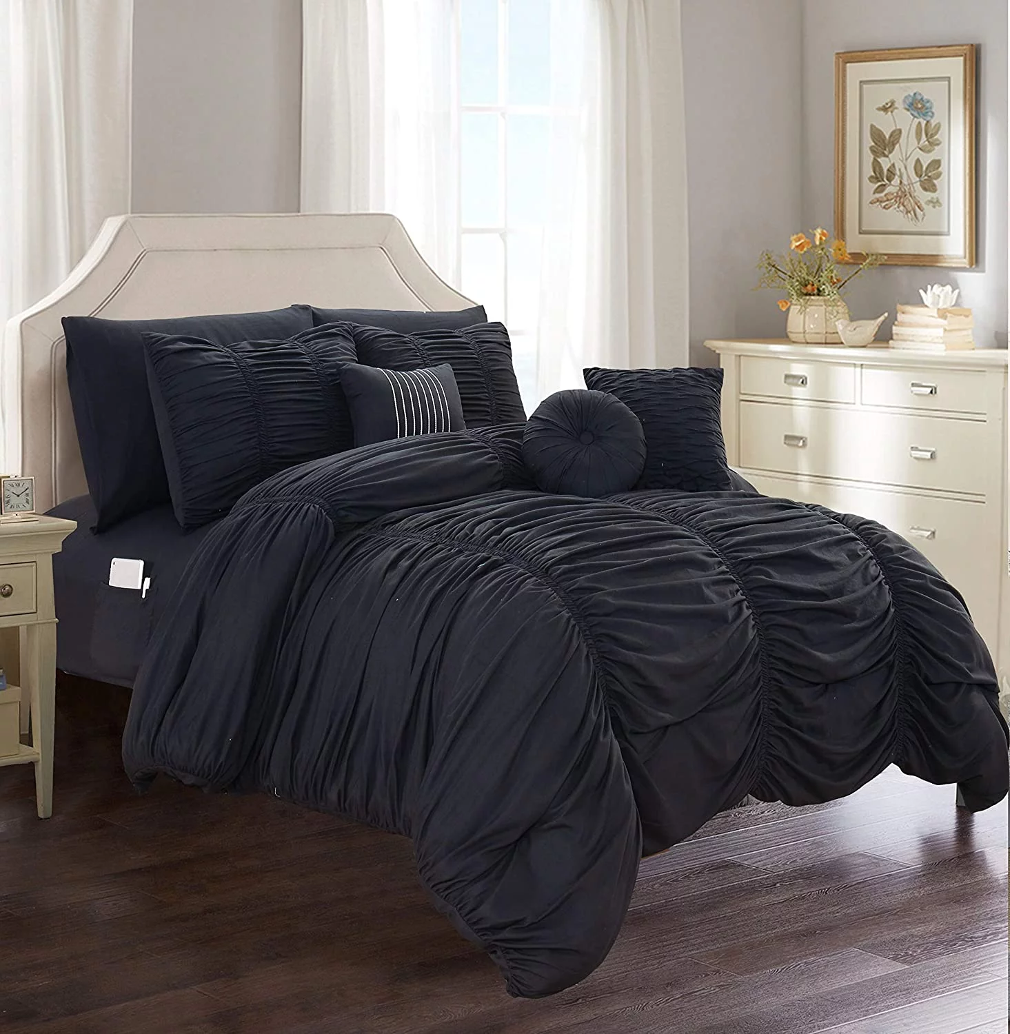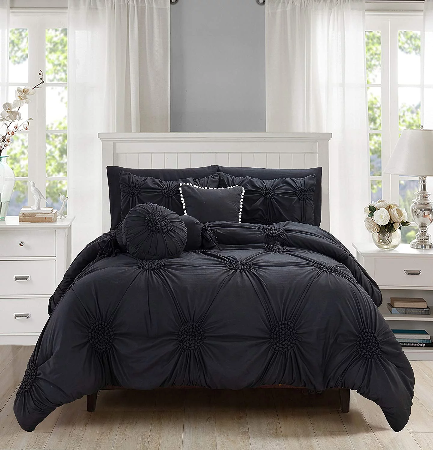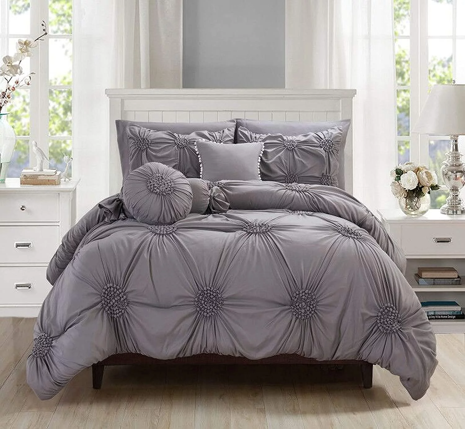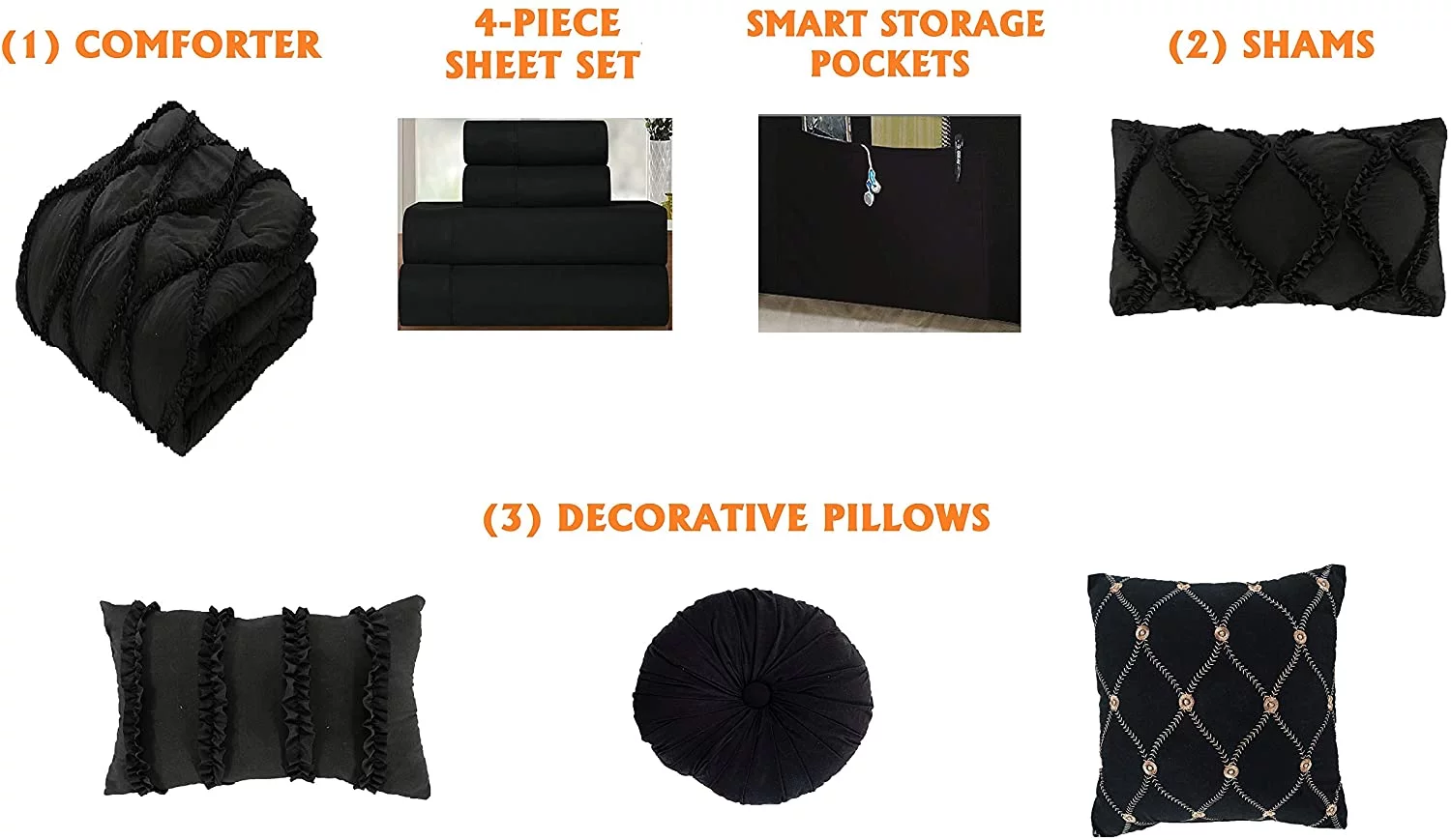 8-Pieces Pintuck Comforter set Includes Bed Sheet Set with Double Sided Storage Pockets, King/Cal King, White