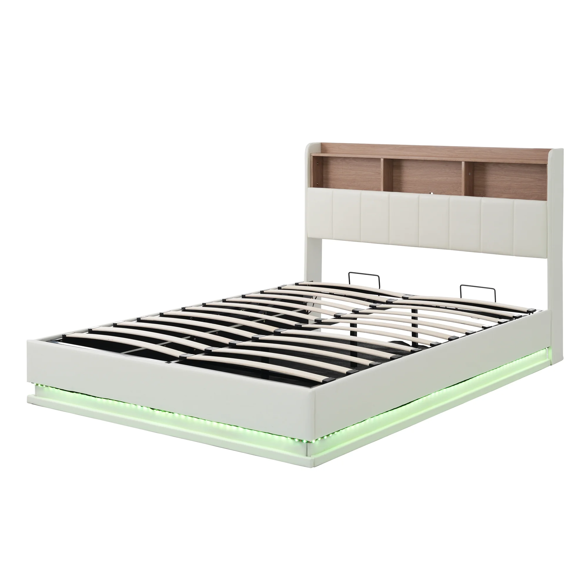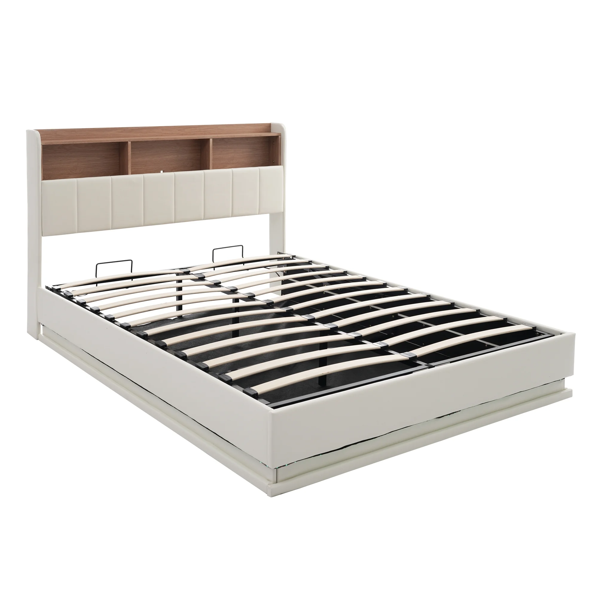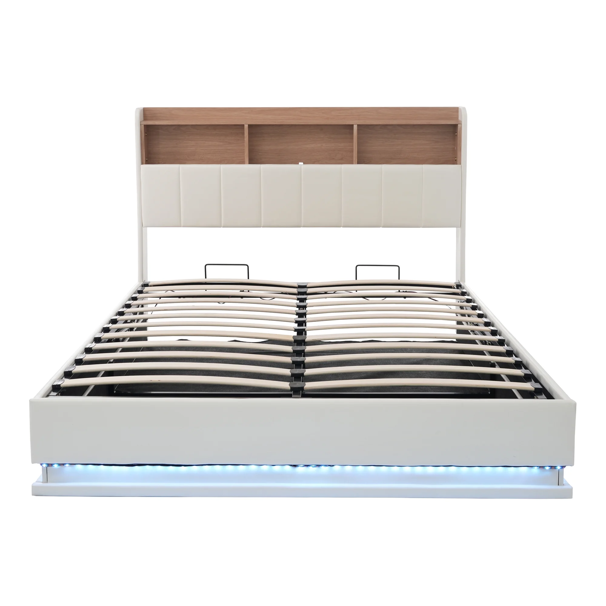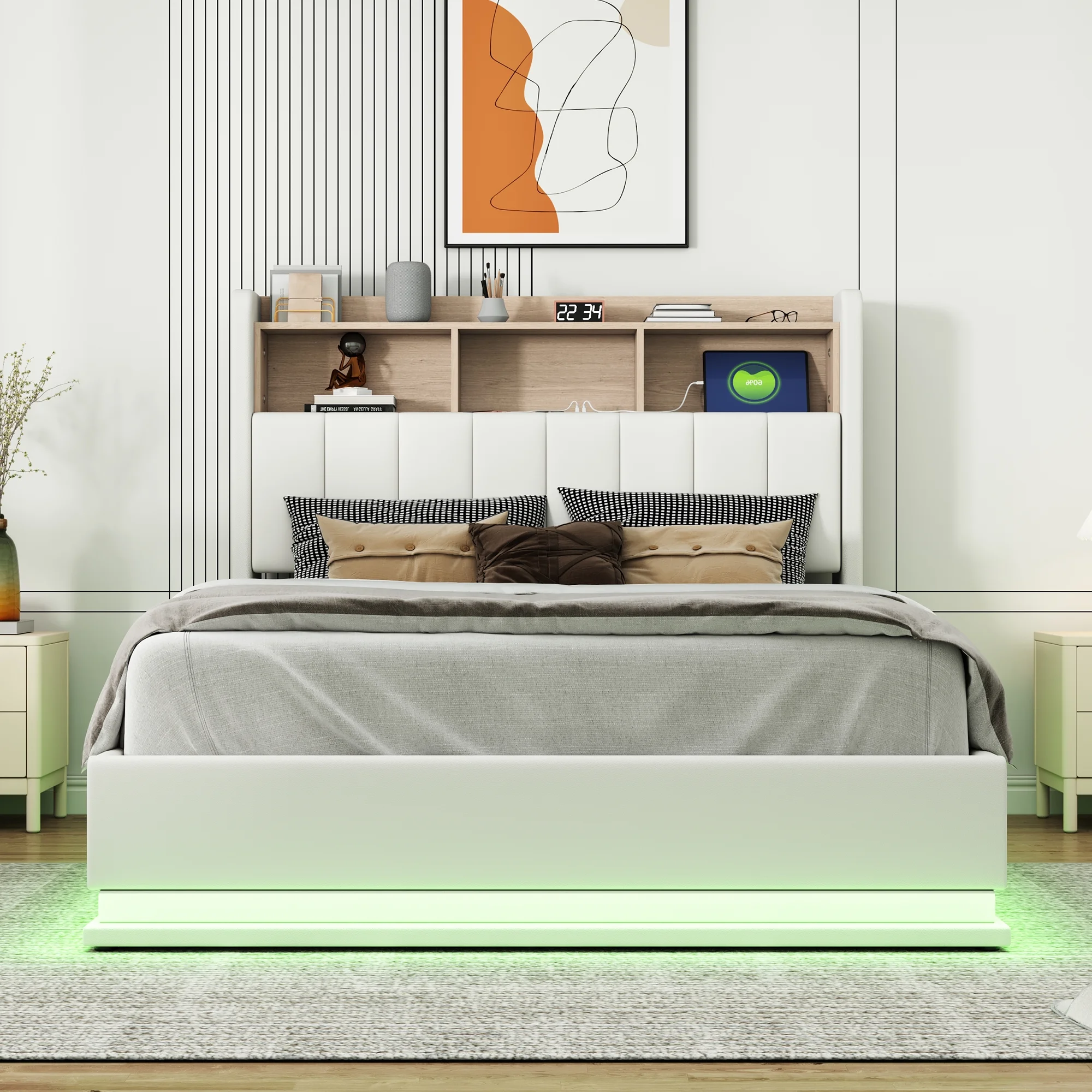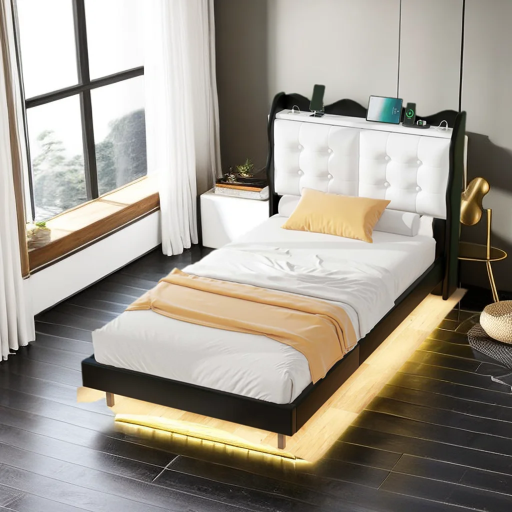 Twin Size Upholstery Platform Bed Frame with LED Light Strips,Headboard Storage Space and Two USB Charging Deisgn