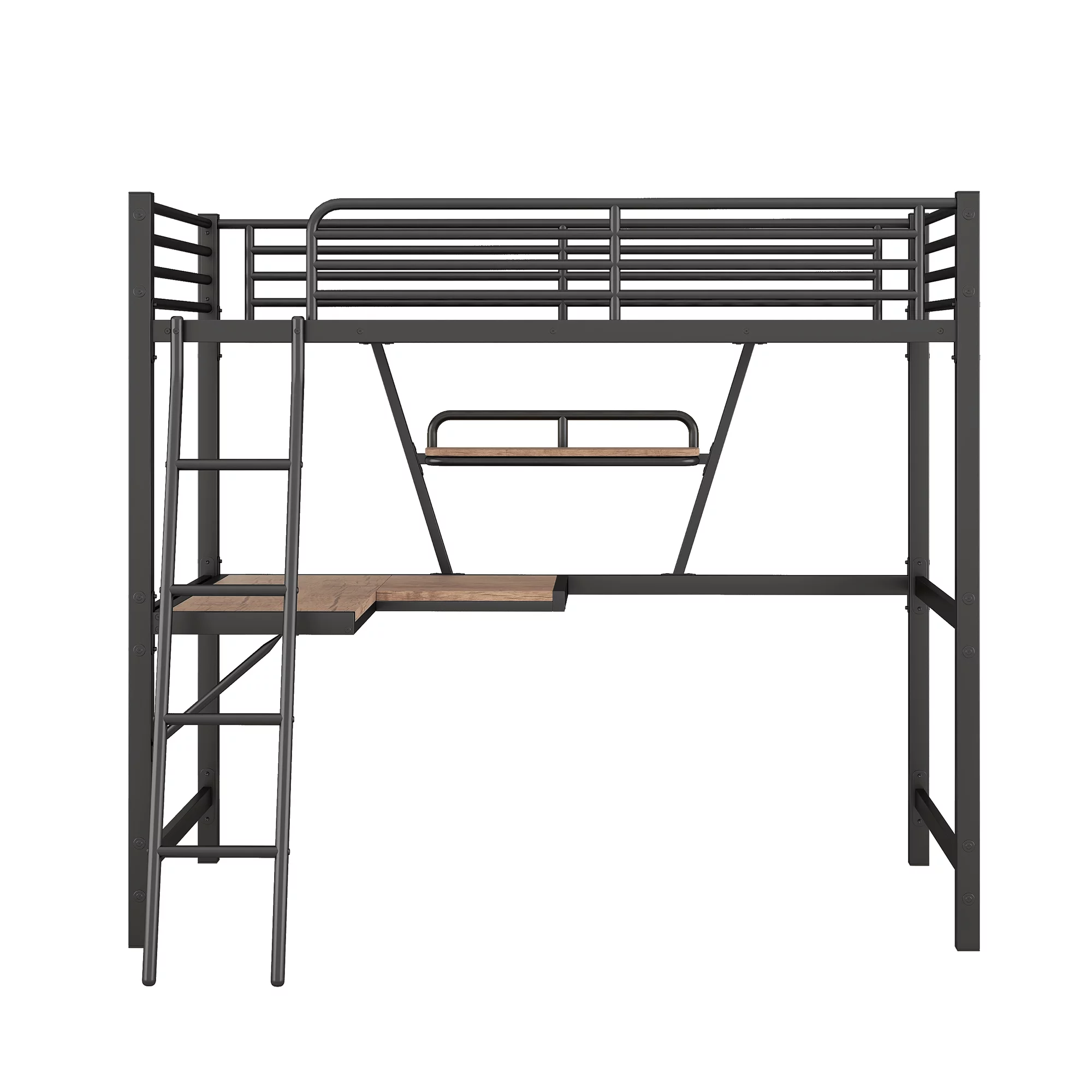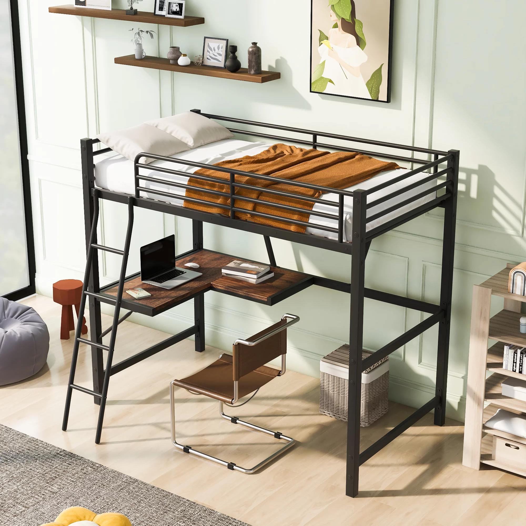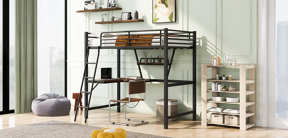 Euroco Metal Twin Size Loft Bed for Kids, Solid Metal Bed with Desk and Shelf for Living Room, Black