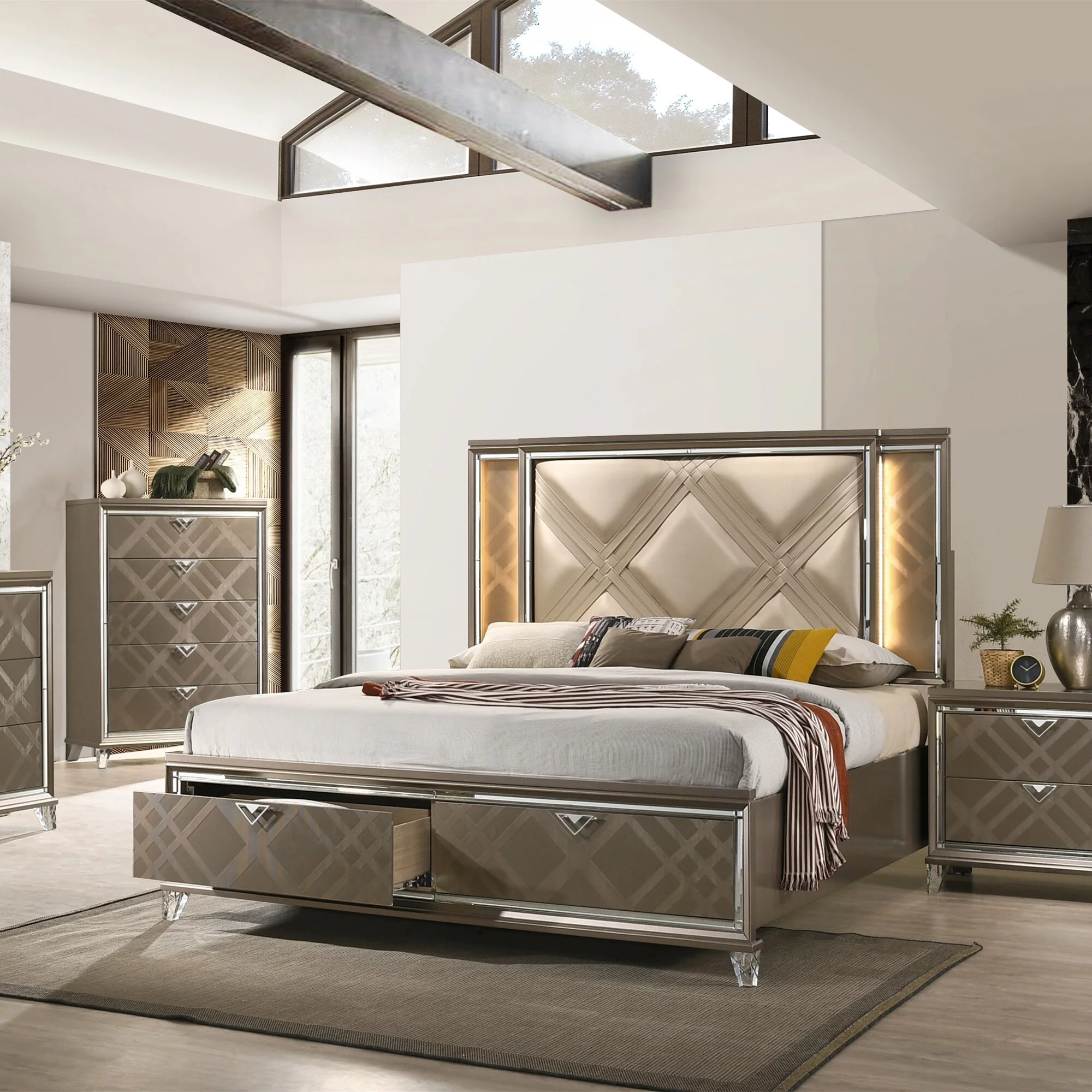87 x 45 x 62 in. Skylar Bed with Storage - LED, PU & Dark Champagne - Twin Size