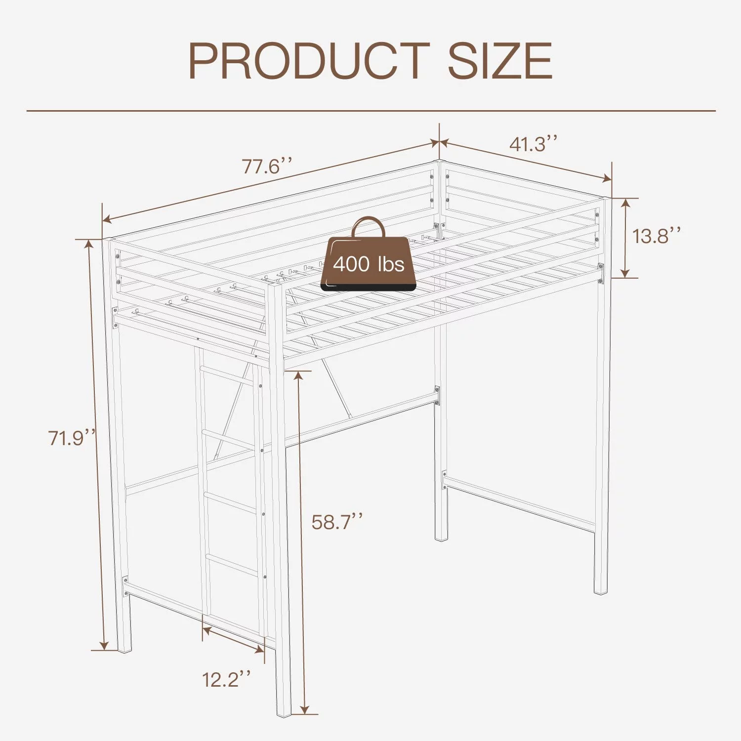 Einfach Metal Loft Bed Twin Size, Safety Guard & Removable Ladder, Black