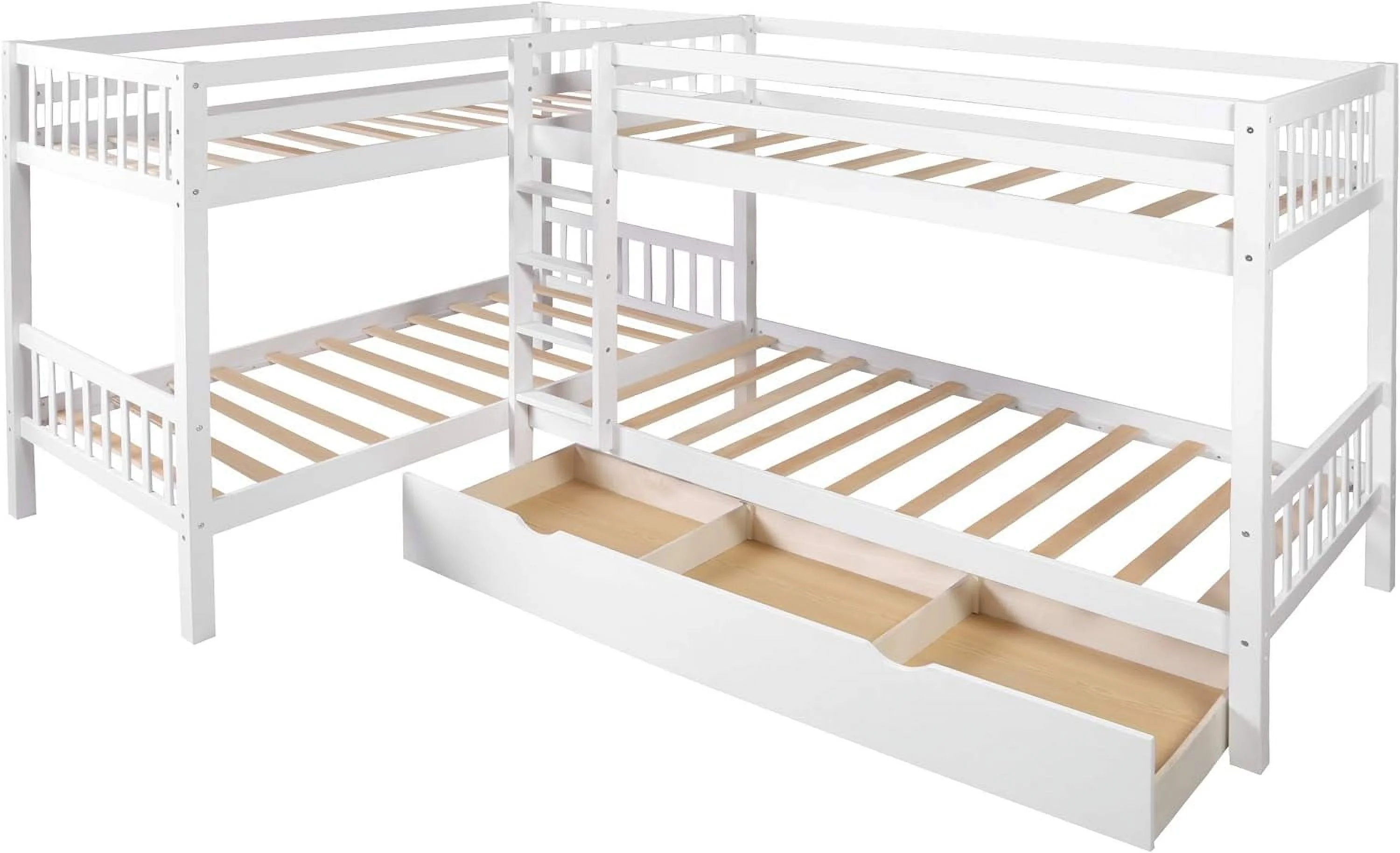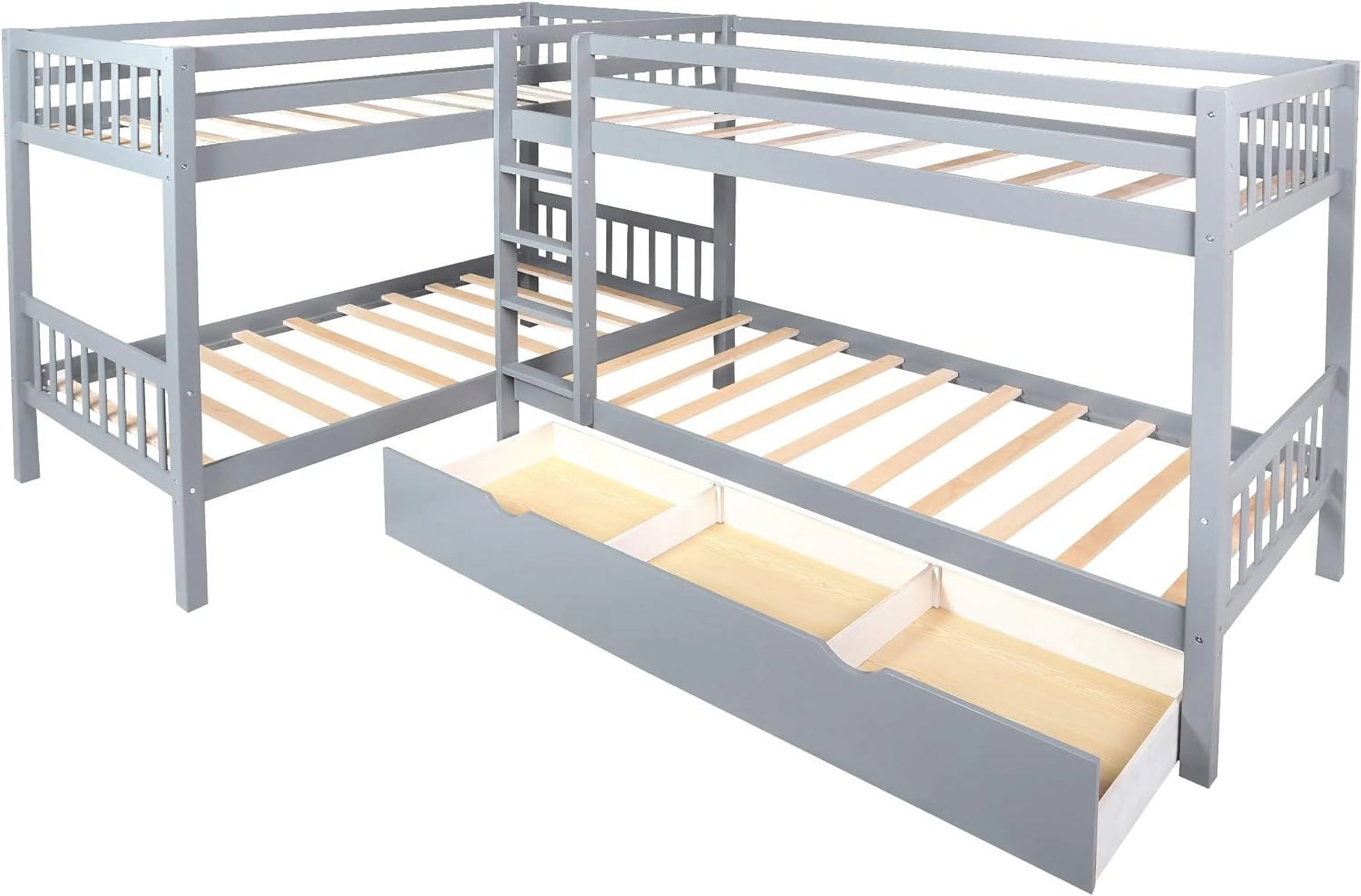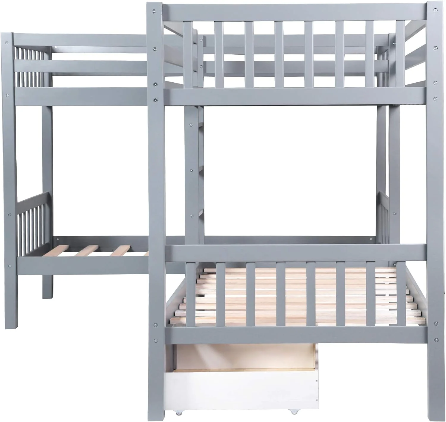 Wooden Bunk Beds For 4 Kids, Over L-Shaped Bunk Bed Frame With Storage Drawers(Gray)
