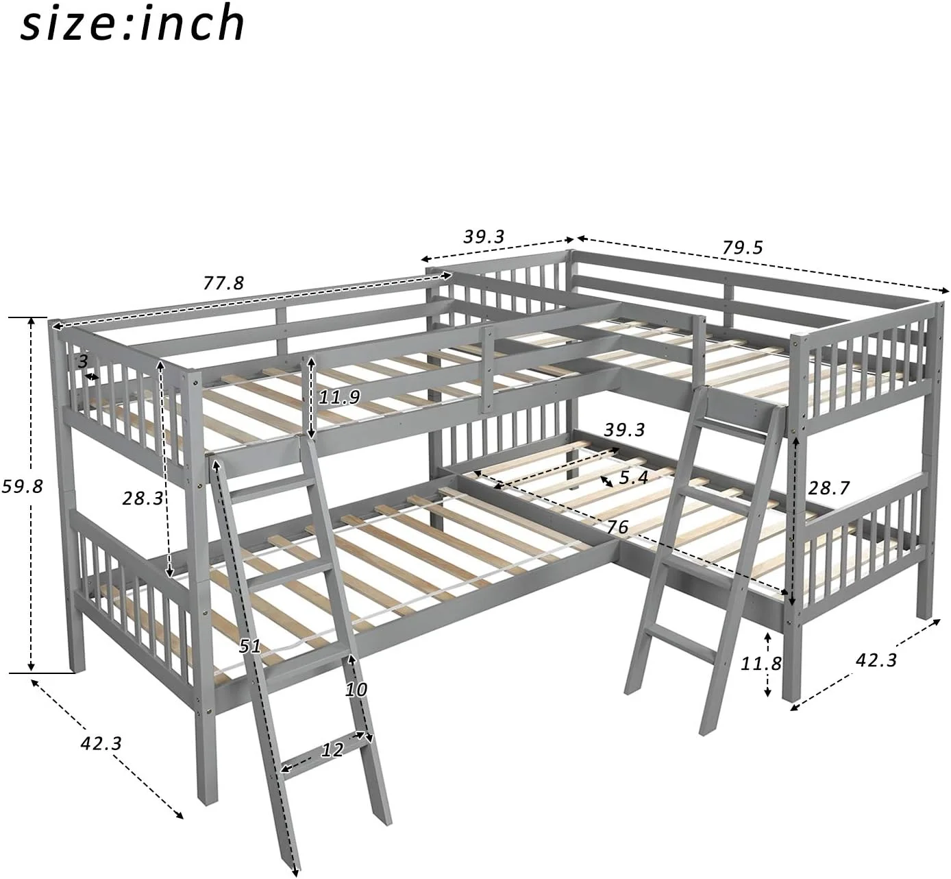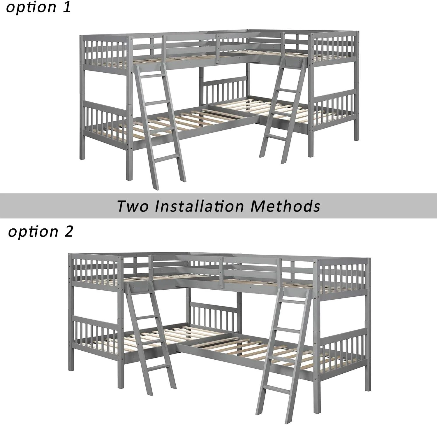 Corner L-Shaped Bunk Bed For 4 Kids, Over Over Bunk Bed Frame Wih Ladder, No Box Spring Needed (Grey)