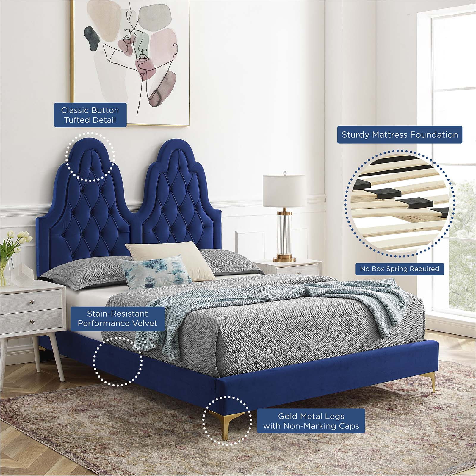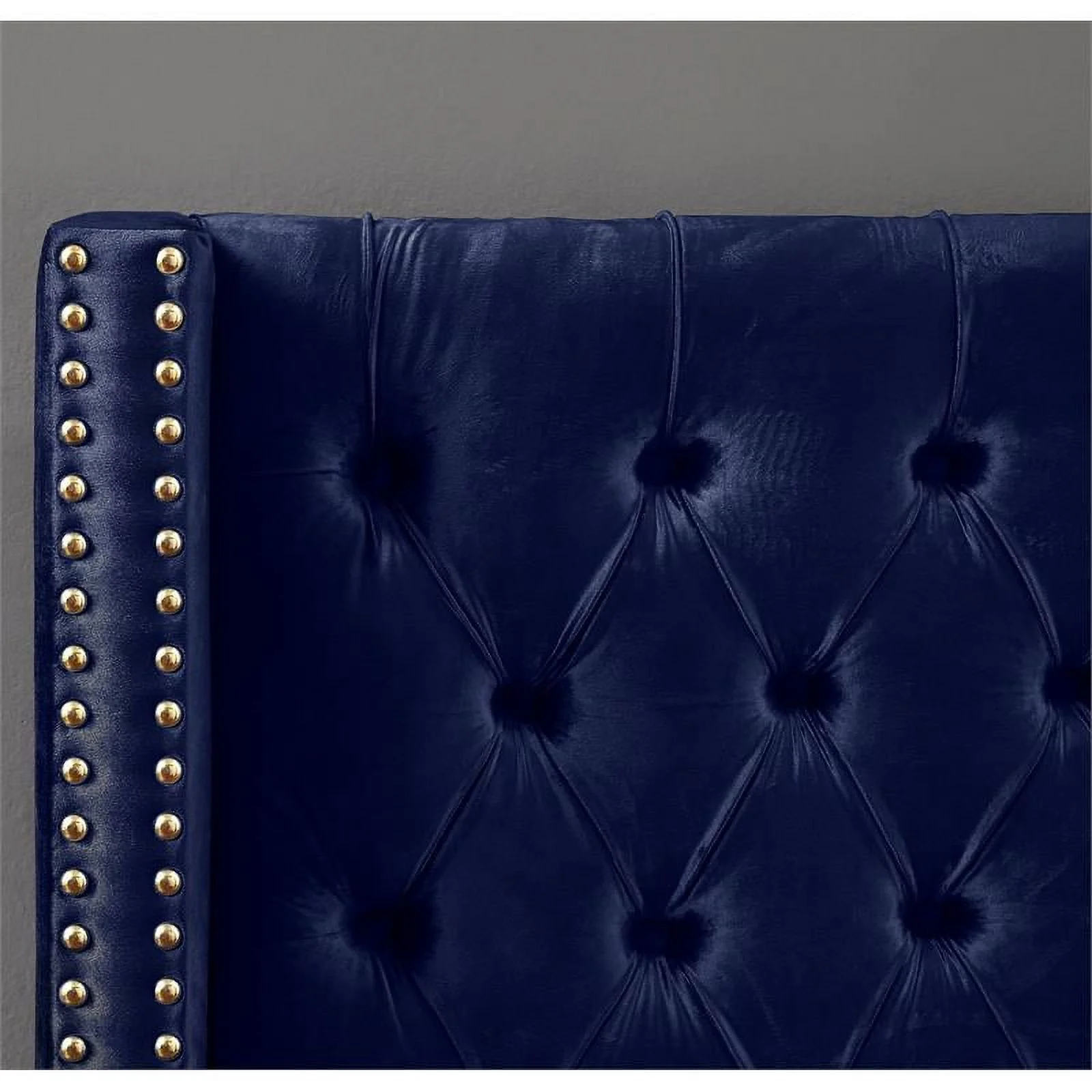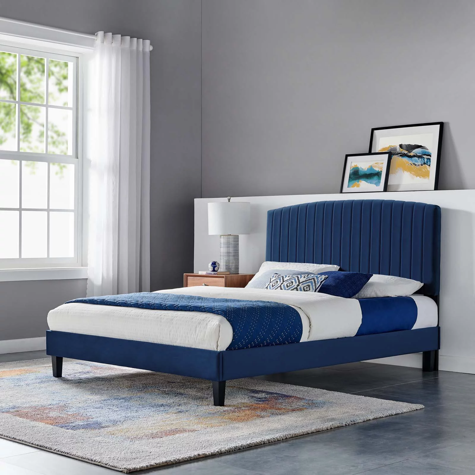 57.75 x 66.25 x 87 in. Avril Platform Bed Frame with Velvet Upholstered Vertical Channel Quilted Headboard, Navy - Queen Size