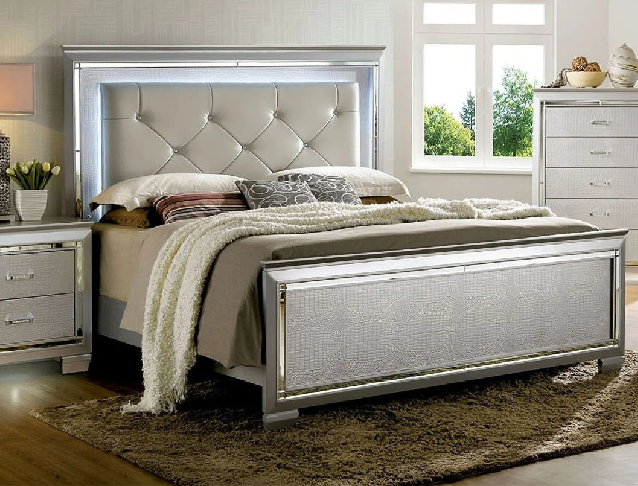 5pc Queen Size Bed Set W LED Luxurious Bedroom Furniture Dresser Mirror 2x Nightstands Silver Color Solid wood Veneer