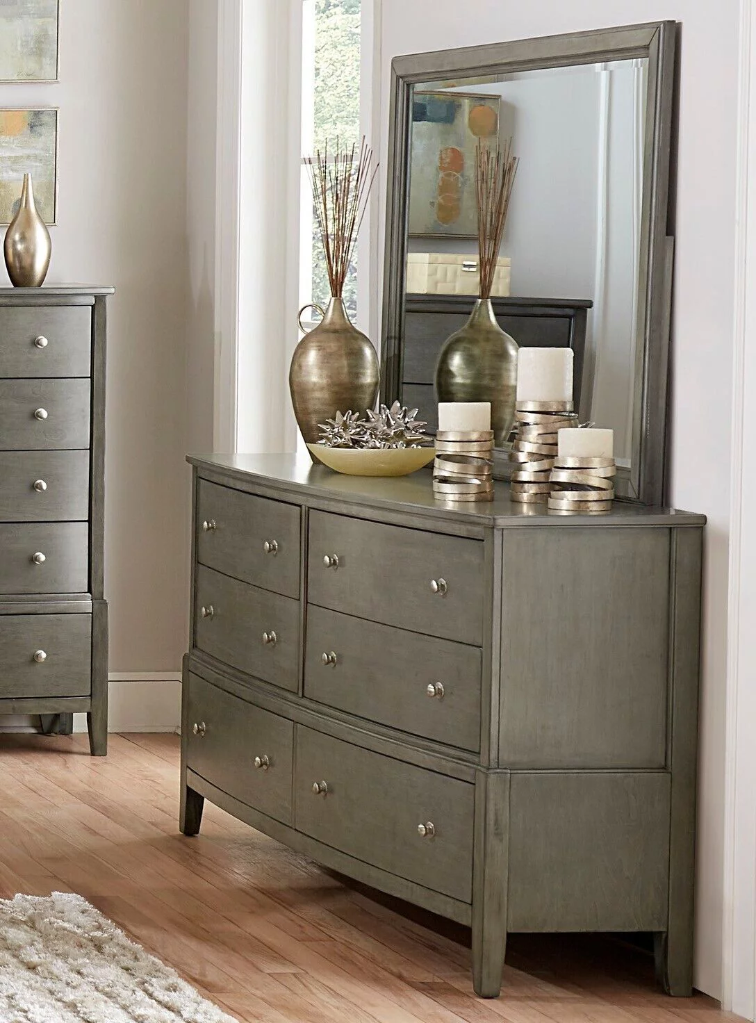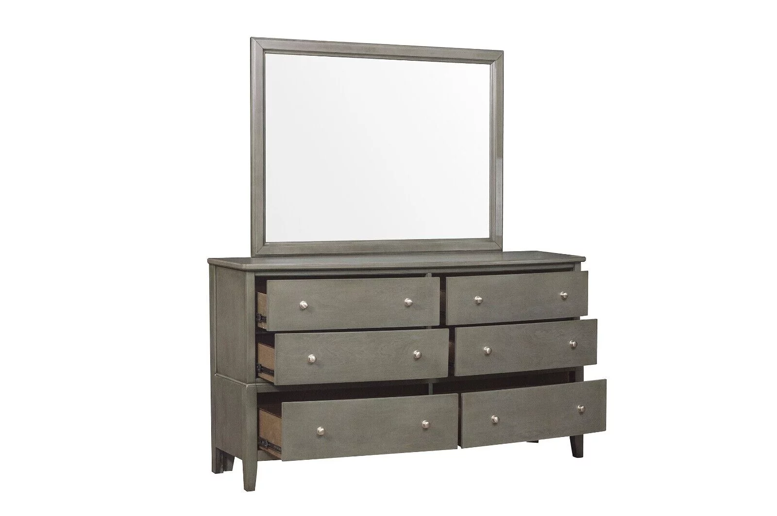 Classic Transitional Gray 6pc Bedroom Queen Size Bed Set Dresser Mirror 2x Nightstands Chest Wooden Furniture Upholstered HB