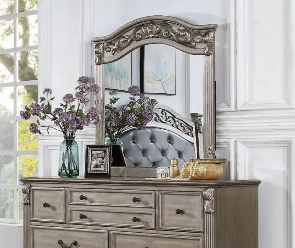 Glamour Traditional 4pc Bedroom Silver Color Queen Size Bed Set Dresser Mirror Nightstand Mirror Panel Tufted HB Bedframe