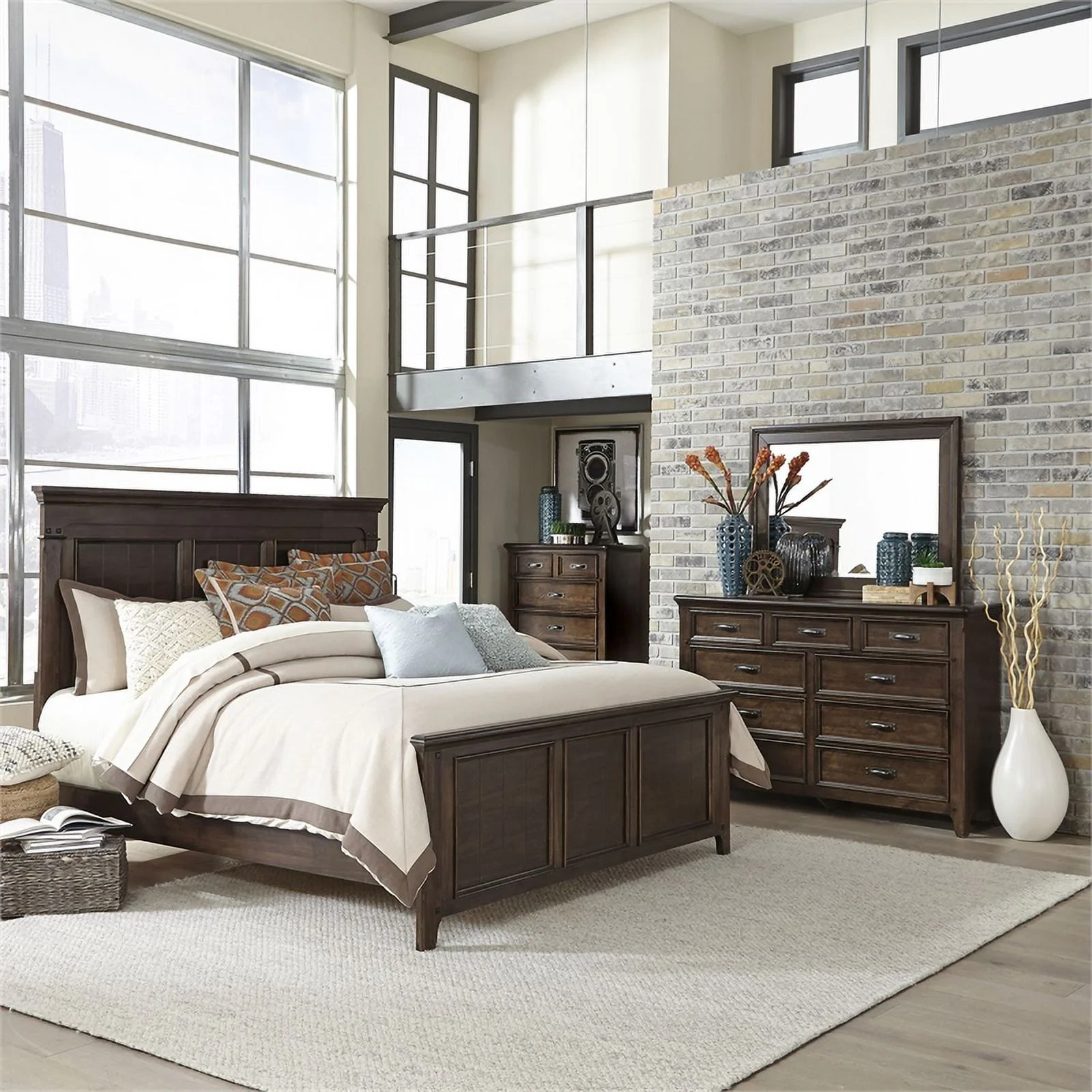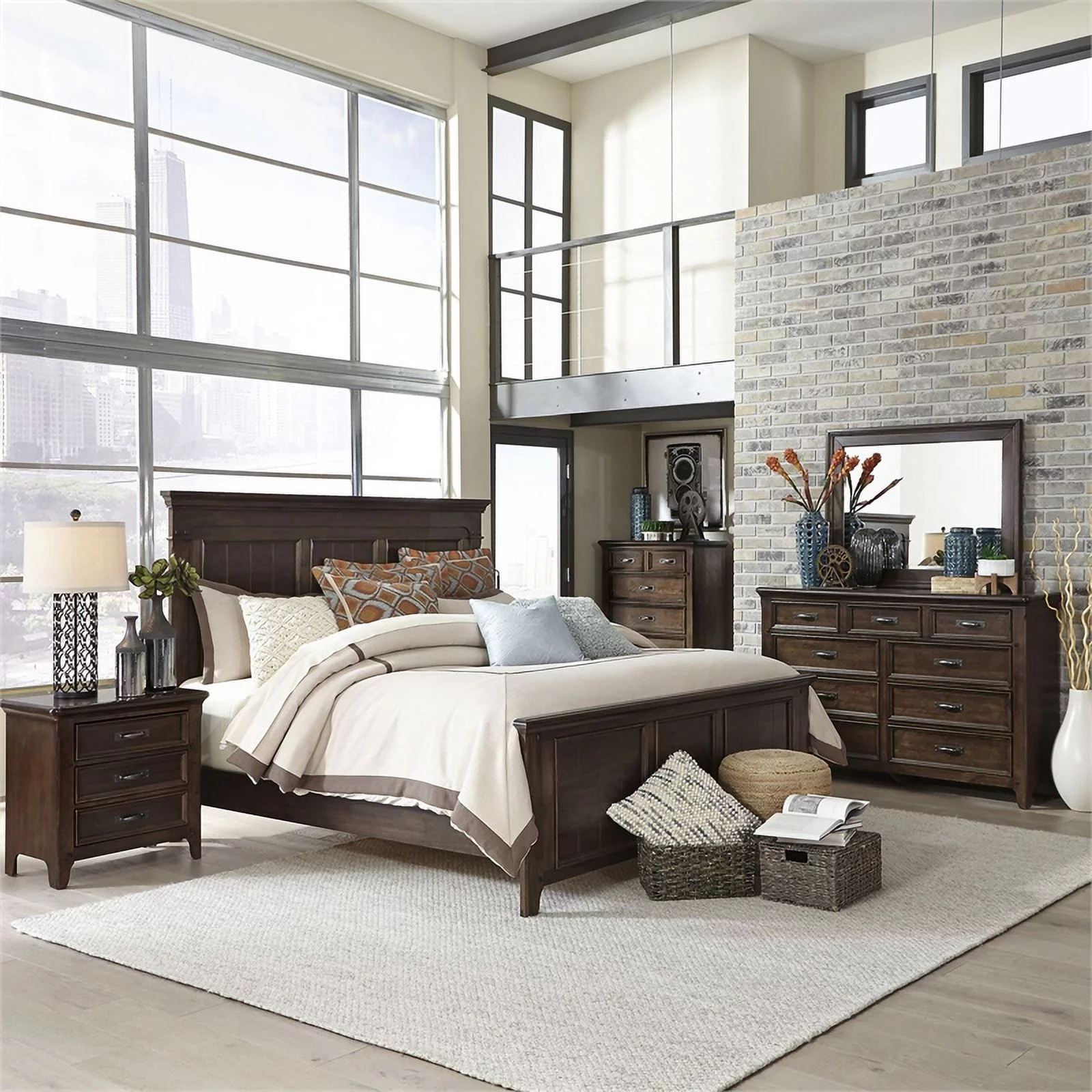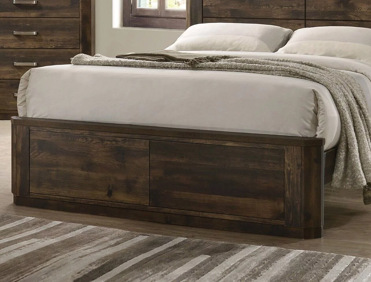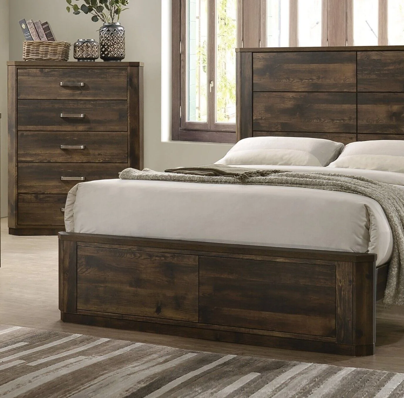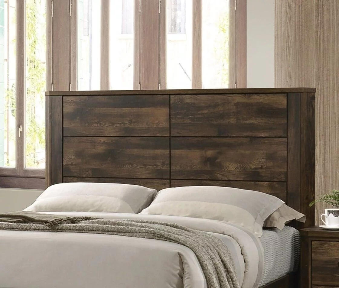 Contemporary Rustic Brown Finish 5 Piece Bedroom Set Queen Bed Nightstand Dresser Mirror Chest Simple Design