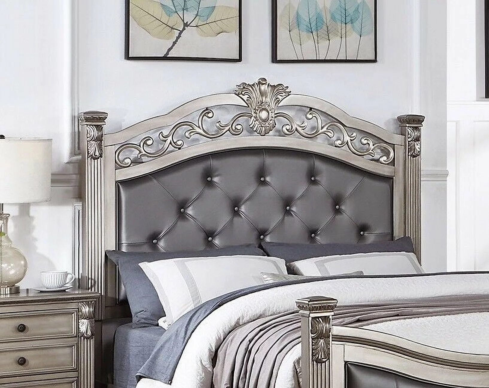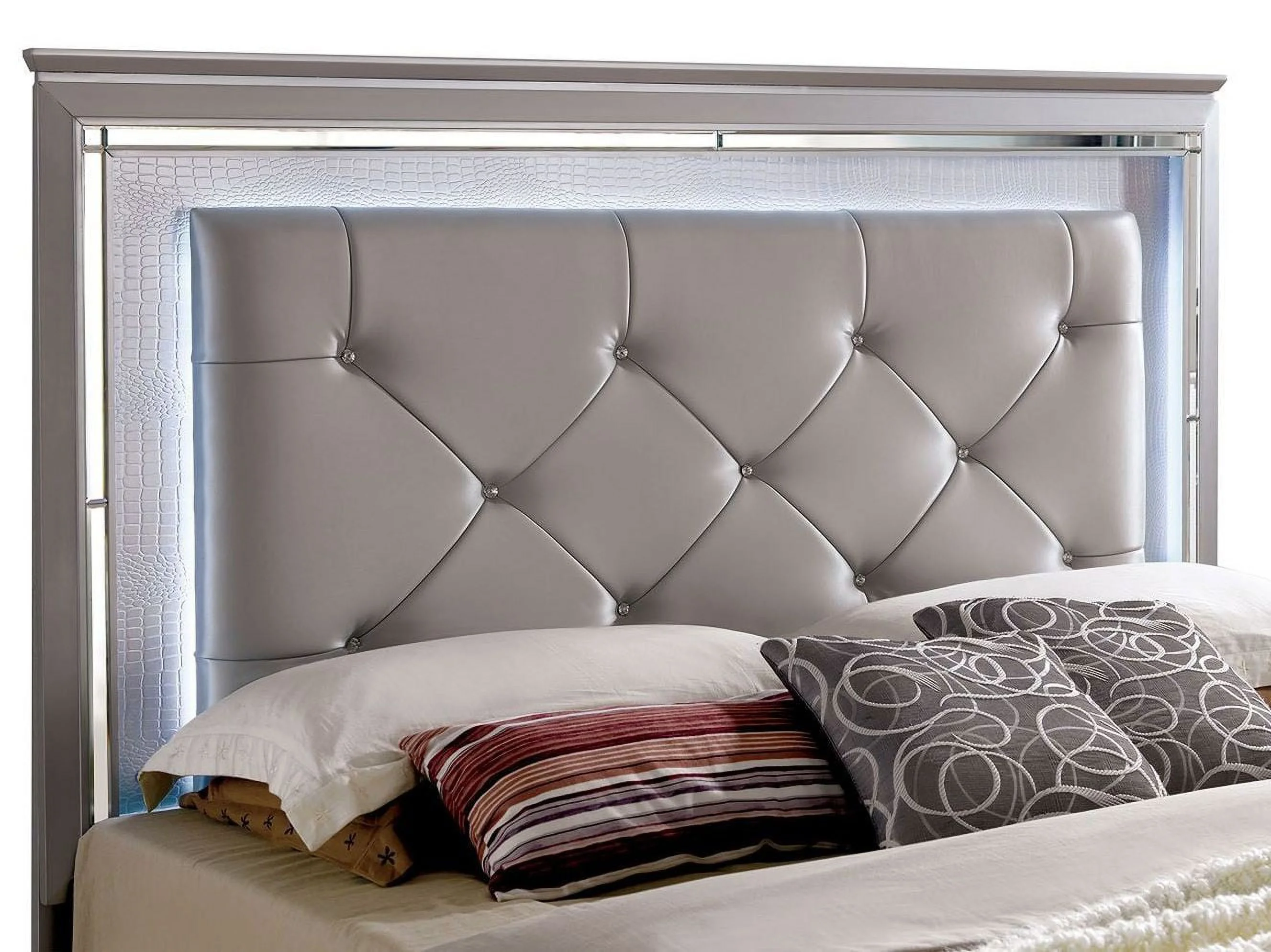 Silver Mirror Panel 6pc Bedroom Set Gorgeous Traditional Queen Size Bed Dresser 2xNightstand Chest Button Tufted Leatherette HB