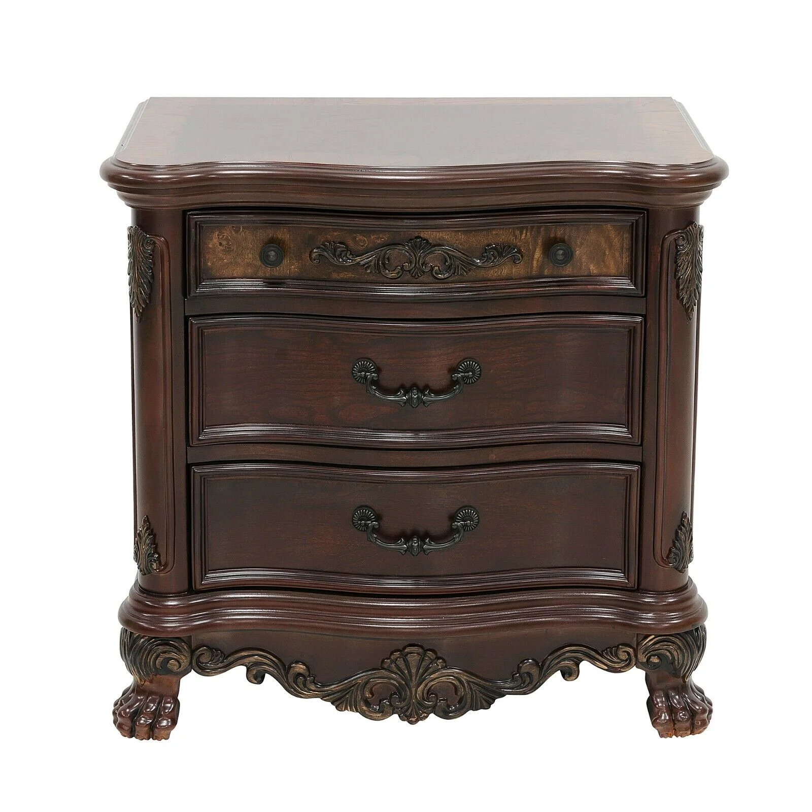 Transitional 4pc Set Brown Cherry Bedroom Furniture Queen Size Bed Dresser Mirror Nightstand Storage Bed Wood Inlay Design