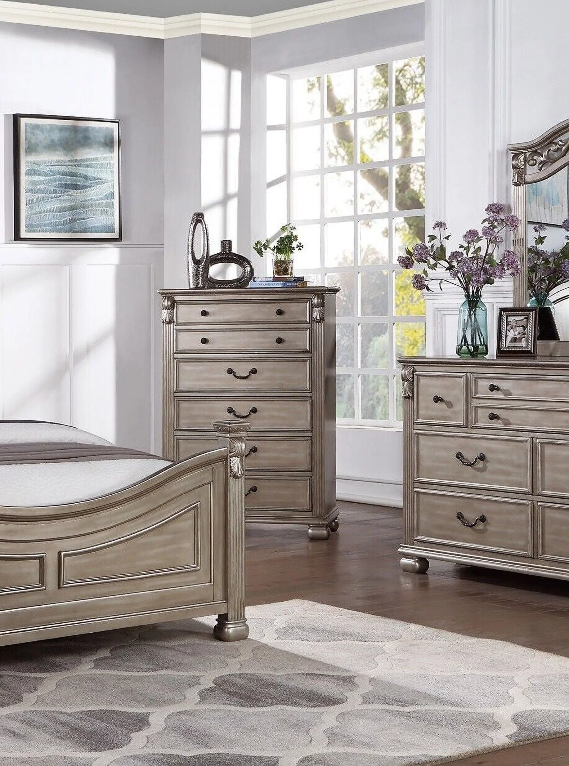 Bedroom 6pc Queen Size Bed Set Silver Finish Dresser Mirror Nightstands Chest Furniture Classic Elegant