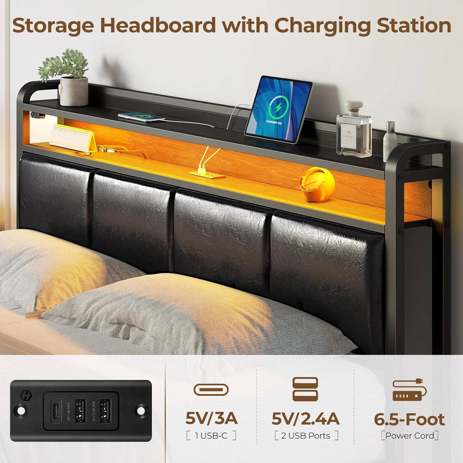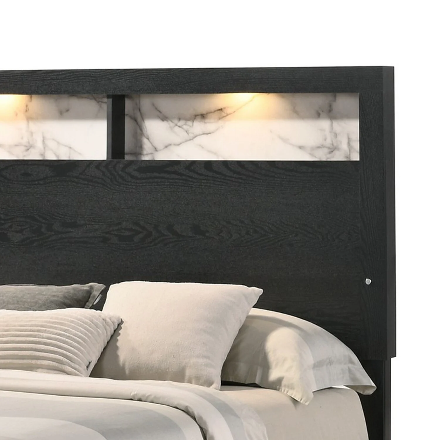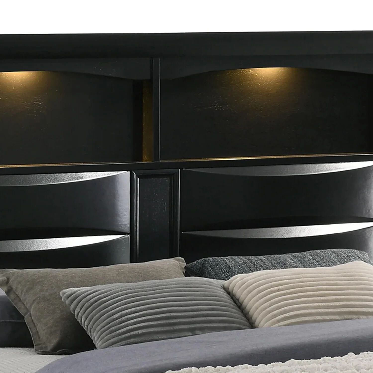 Benjara Yoh King Size Bed, Wood, Headboard with Lights and Shelves, Black