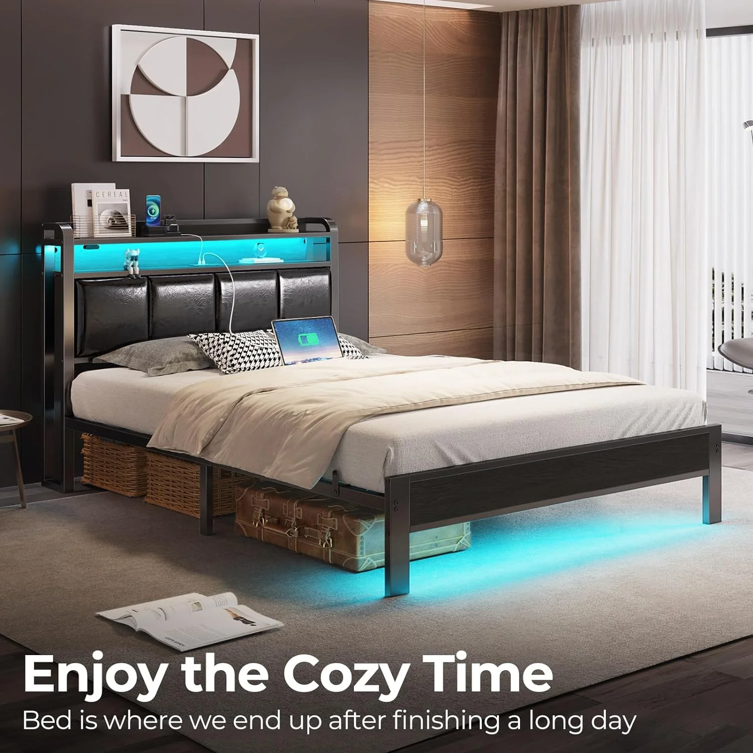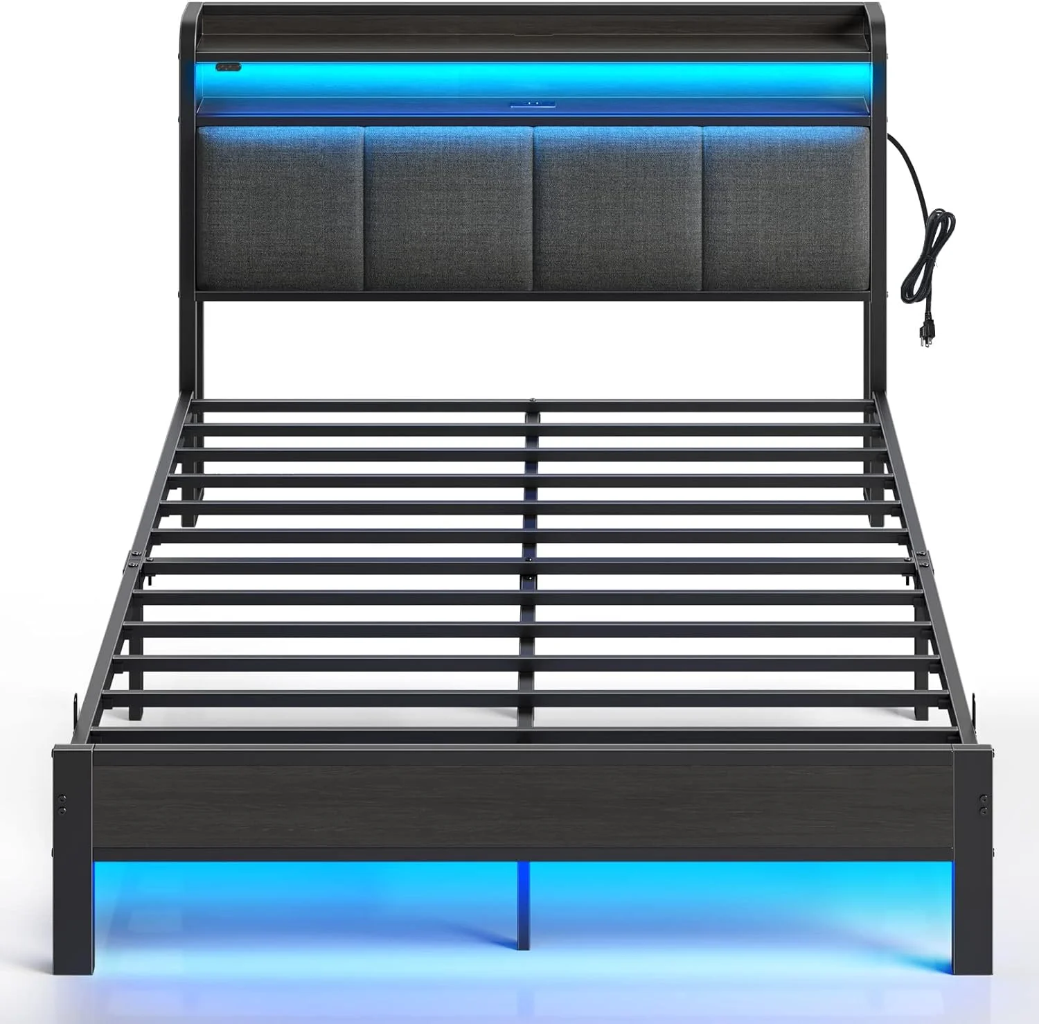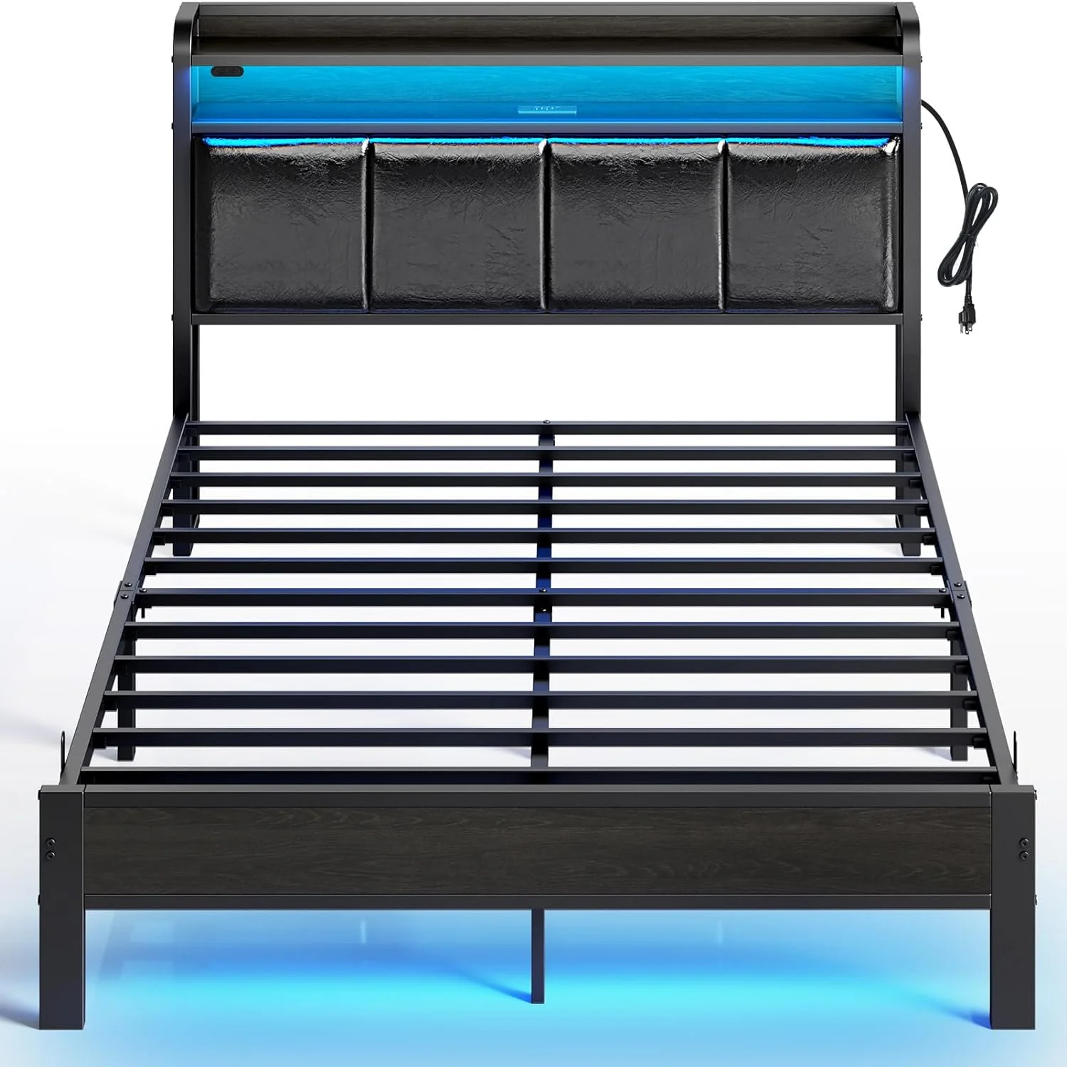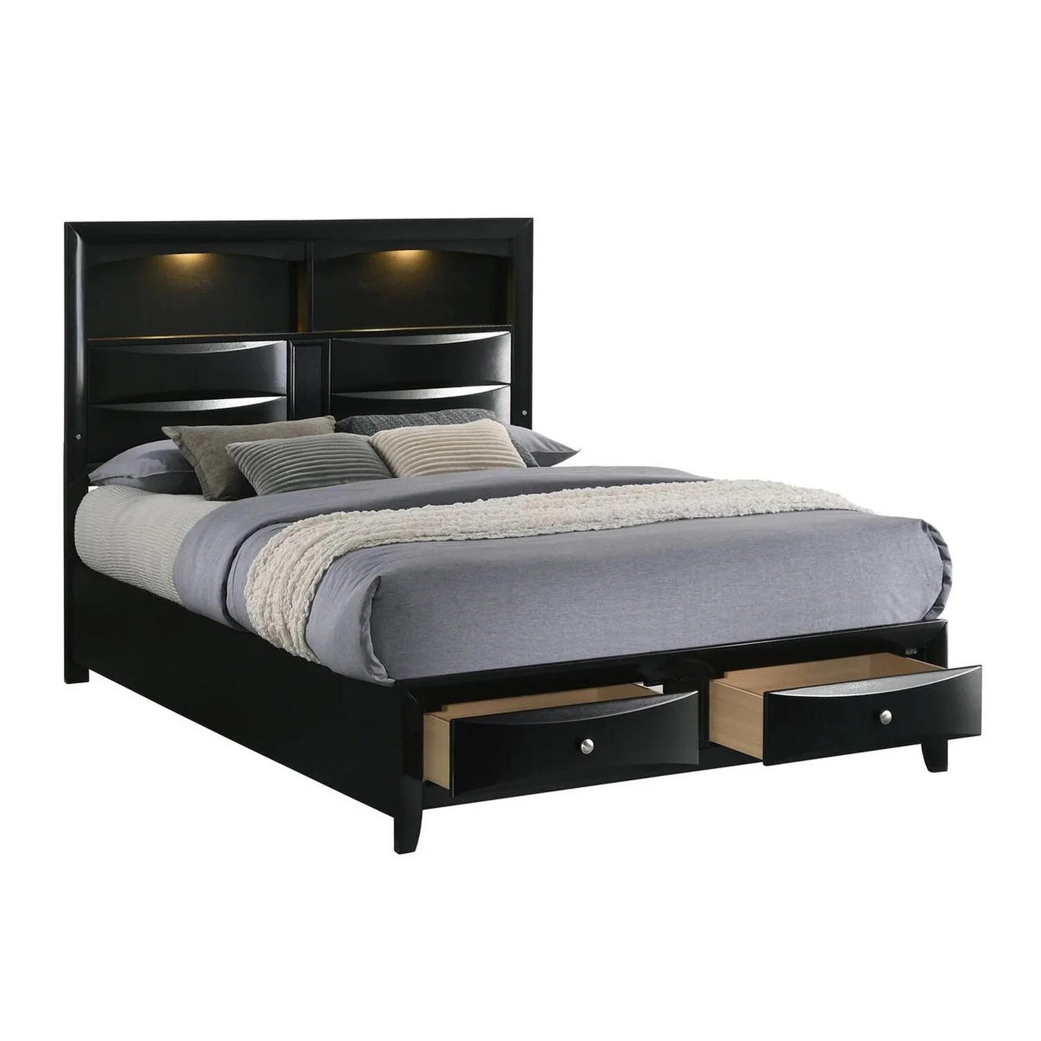 Benjara Flash Queen Size Bed, 2 Storage Drawers, Shelves, Black Wood, LED Headboard