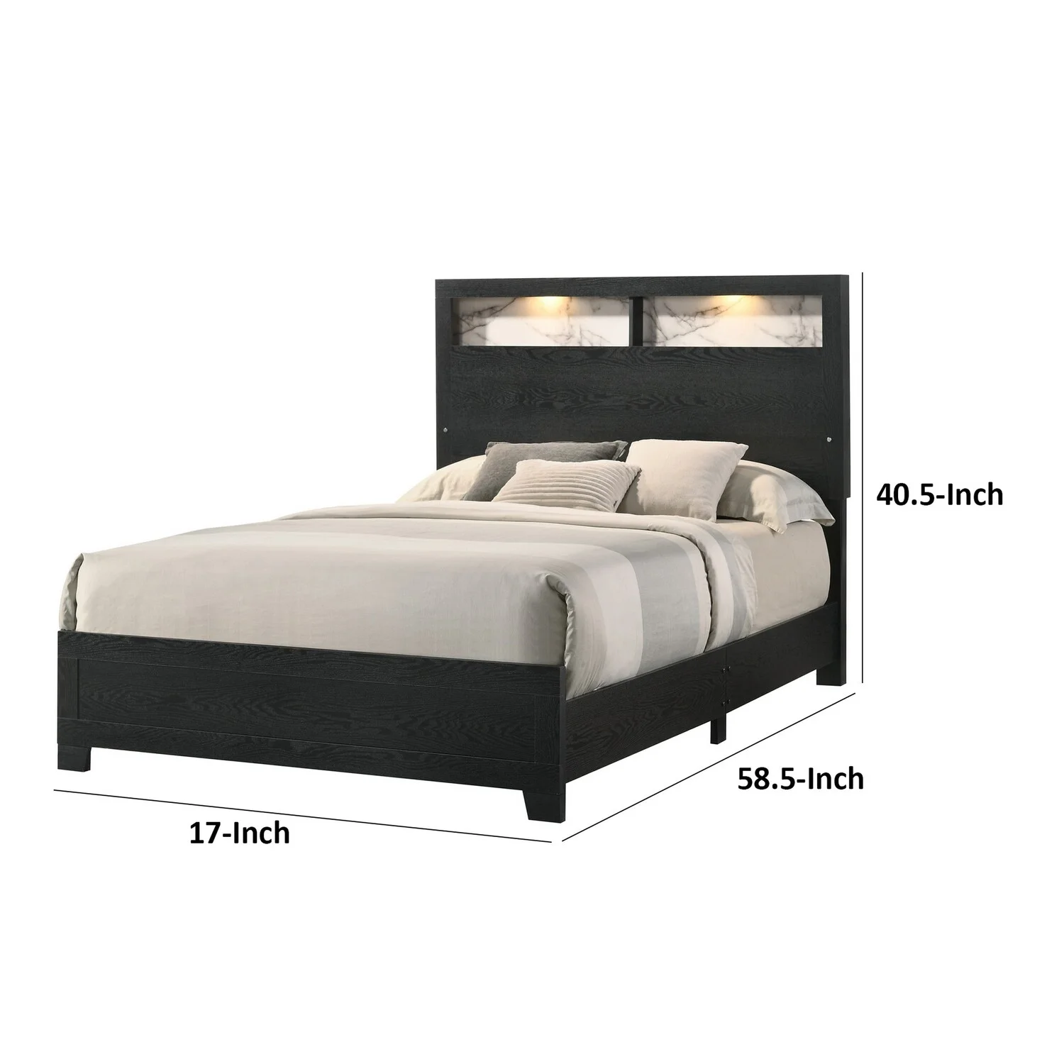 Benjara Yoh Queen Size Bed, Wood, Headboard with Lights and Shelves, Black