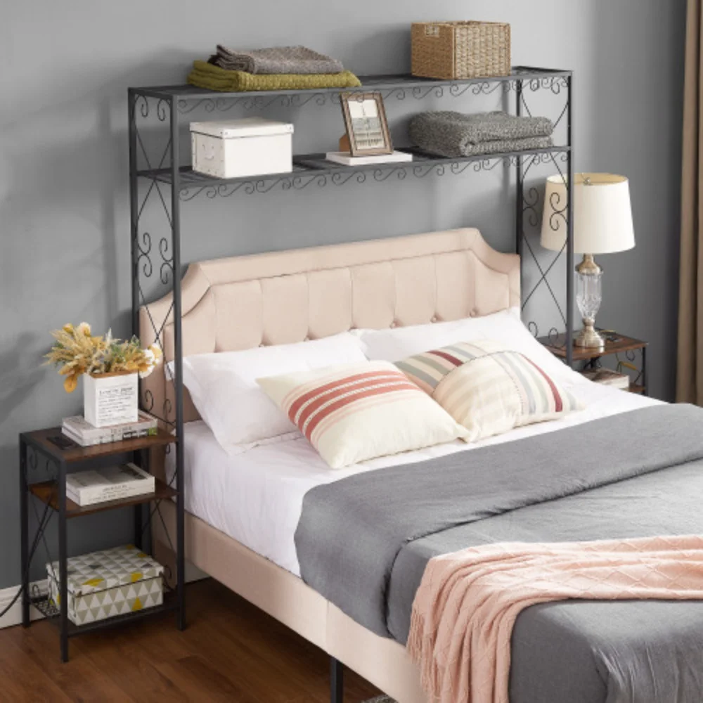 Double Size Platform Bed With House-Shaped Headboard Ad A Built-I ightstad, Grey