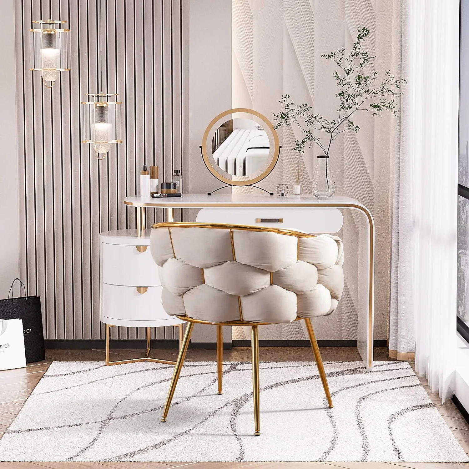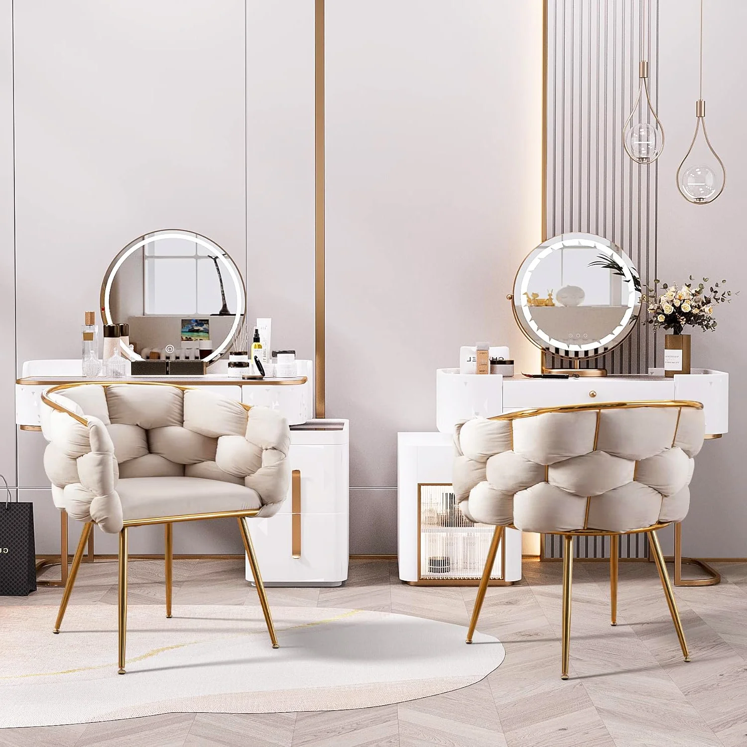 Glavbiku Luxury Modern Upholstered Velvet 1 Seat Dining Chair,Lazy Dresser Stool,Beige,Adult