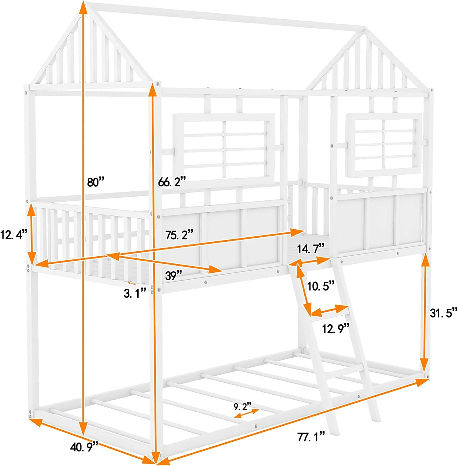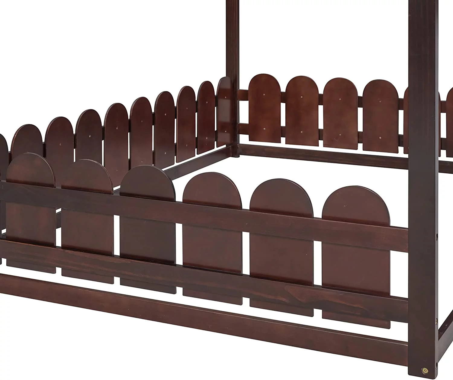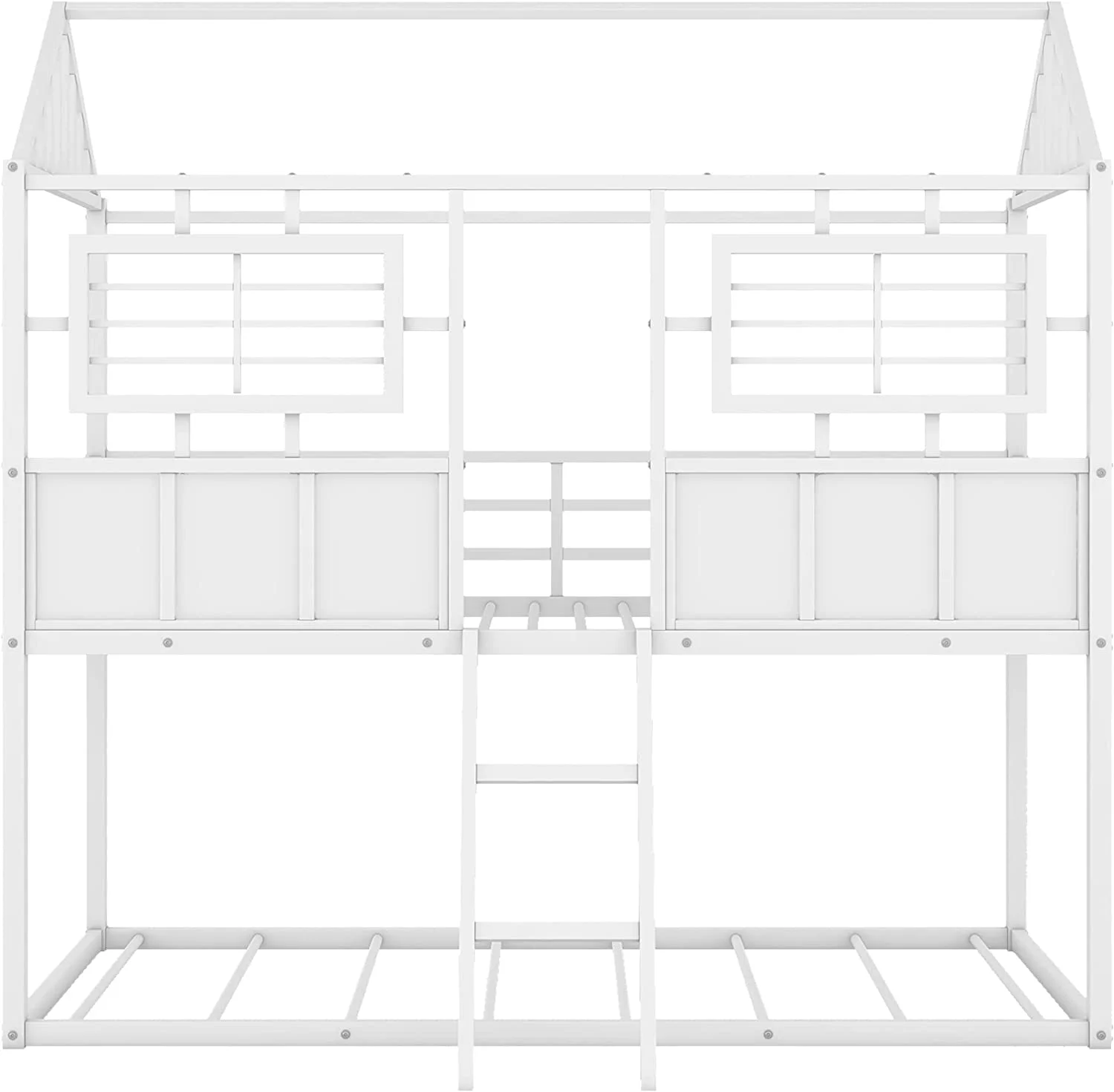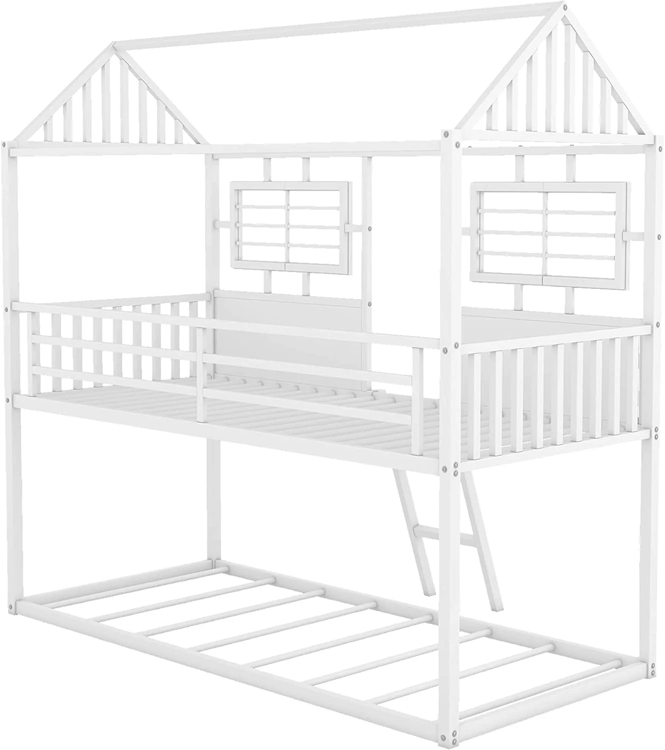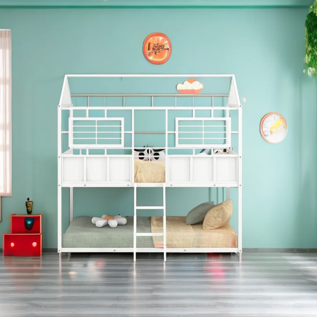 Twin Over Twin Size Metal Low Bunk Beds with Roof and Fence-Shaped Guardrail