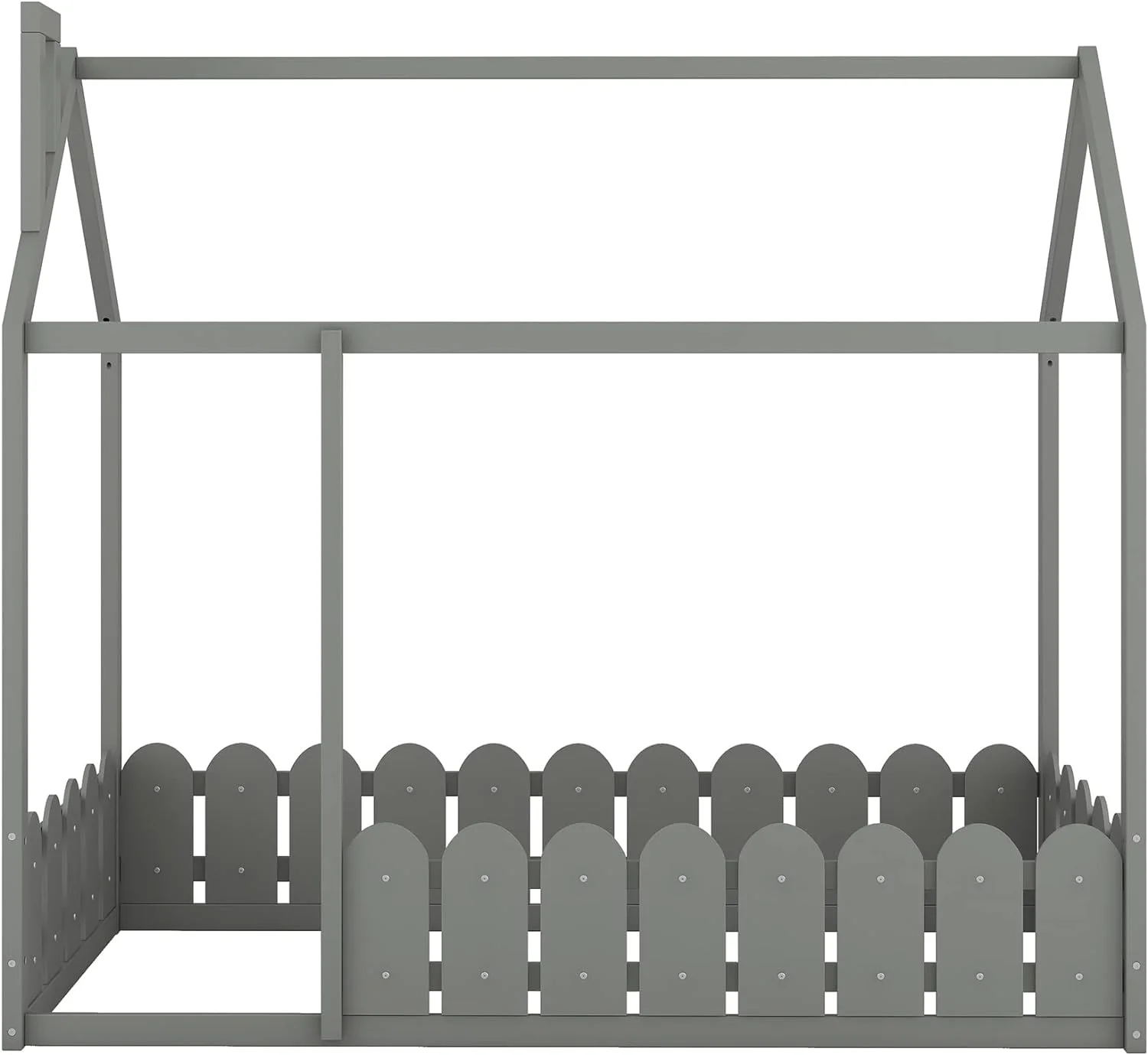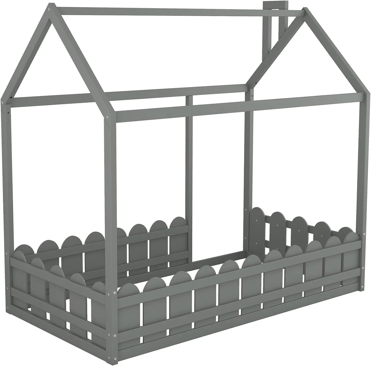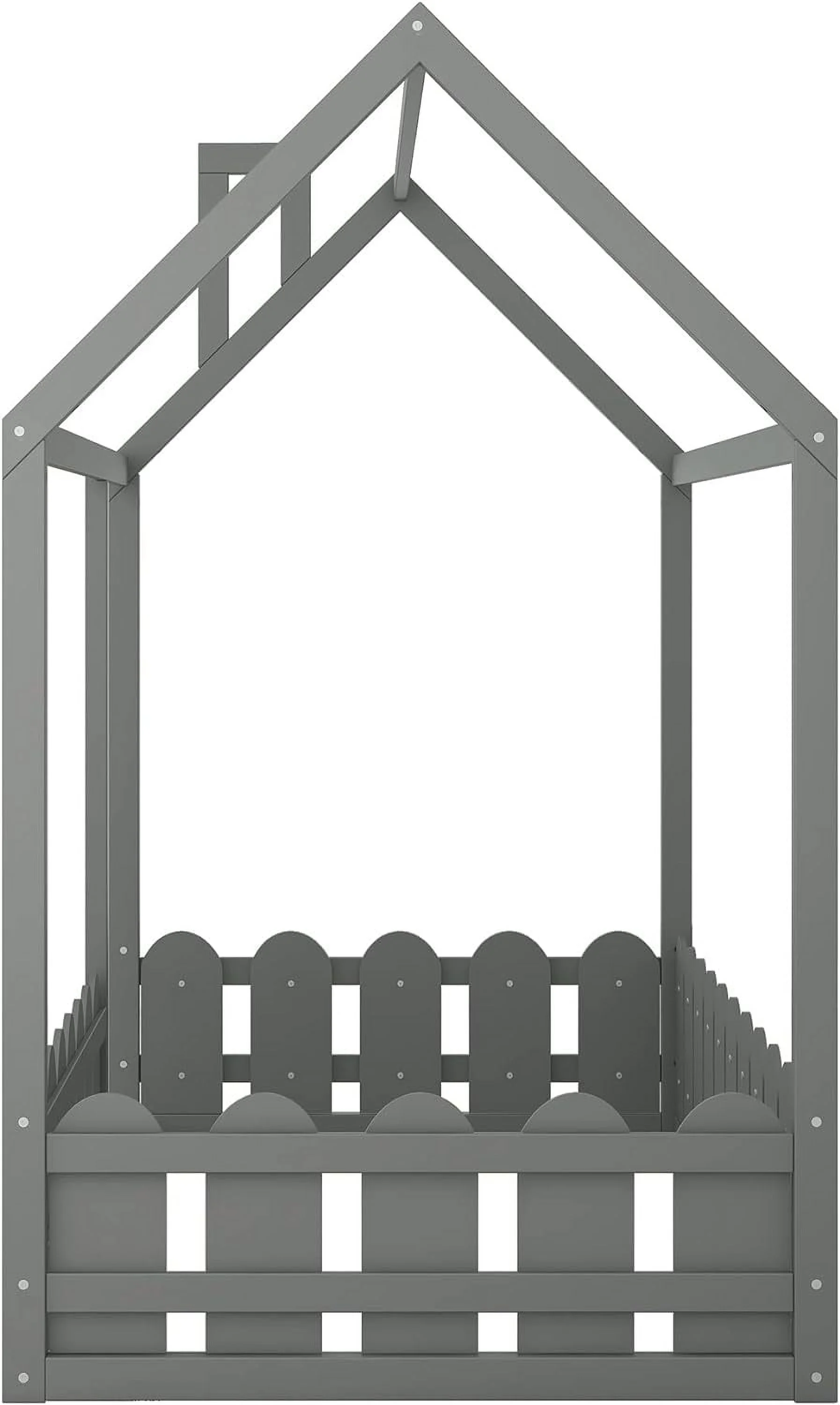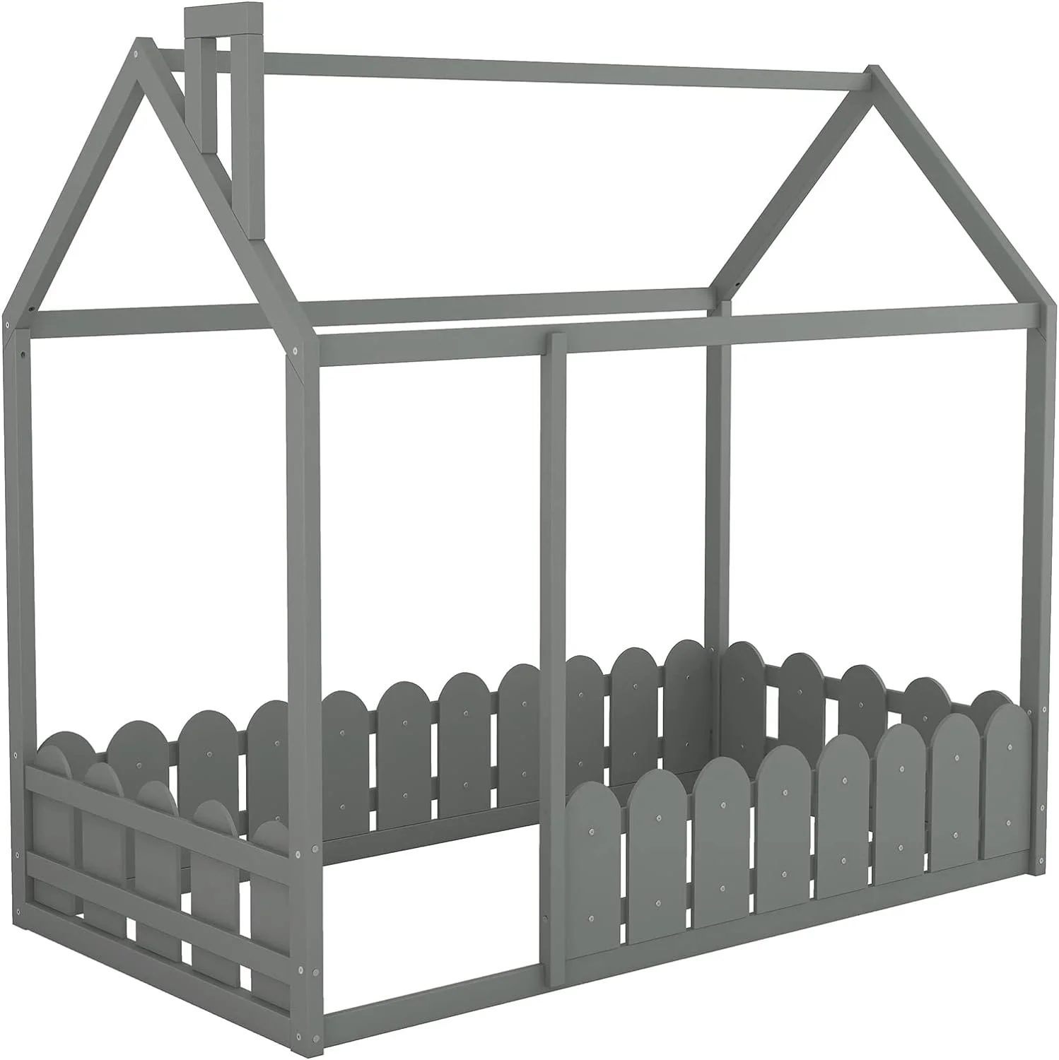 Size House Bed With Fence, House Floor Bed Frame With Roof And Chimney, Wooden Cabin Bed For Kids And Teens (Gray)