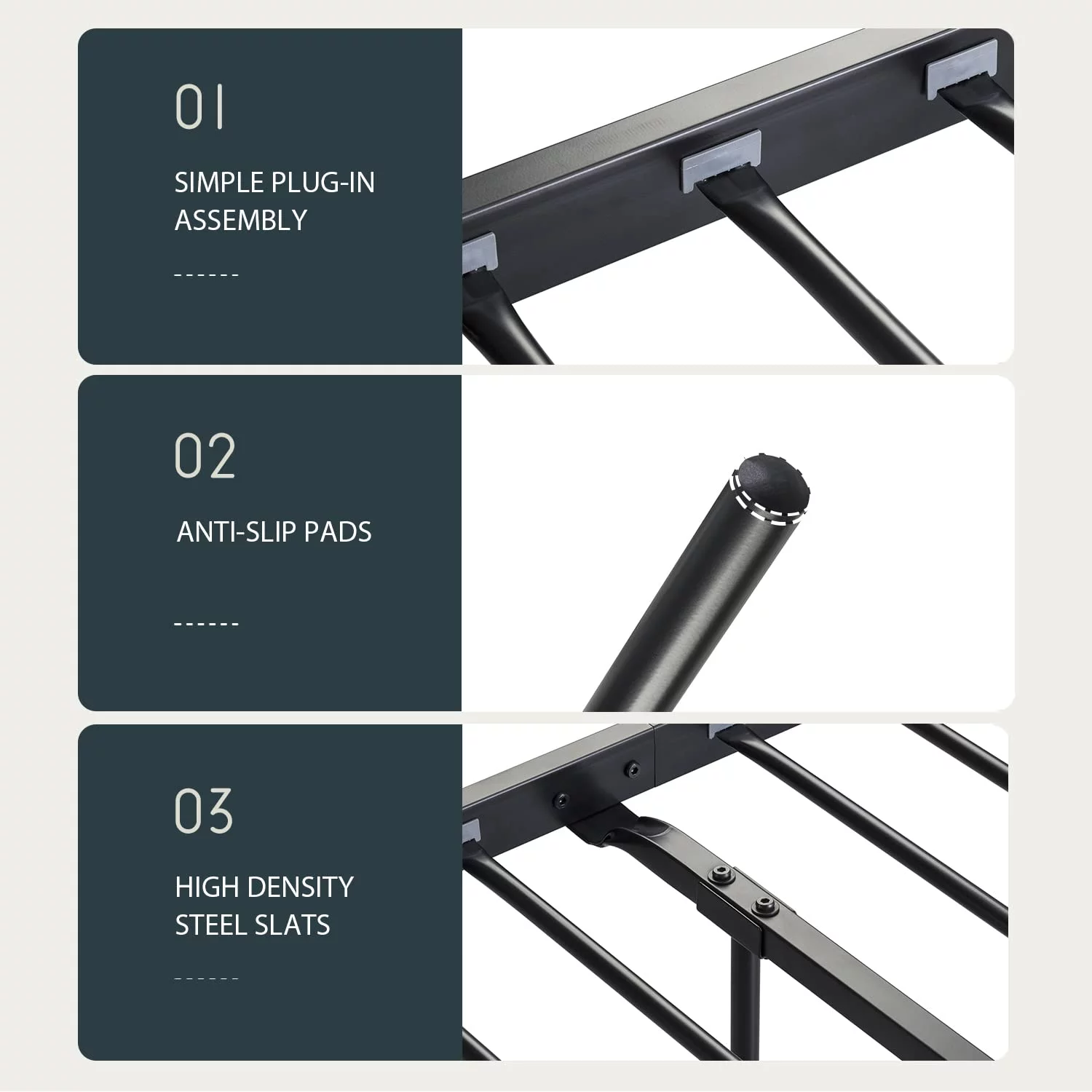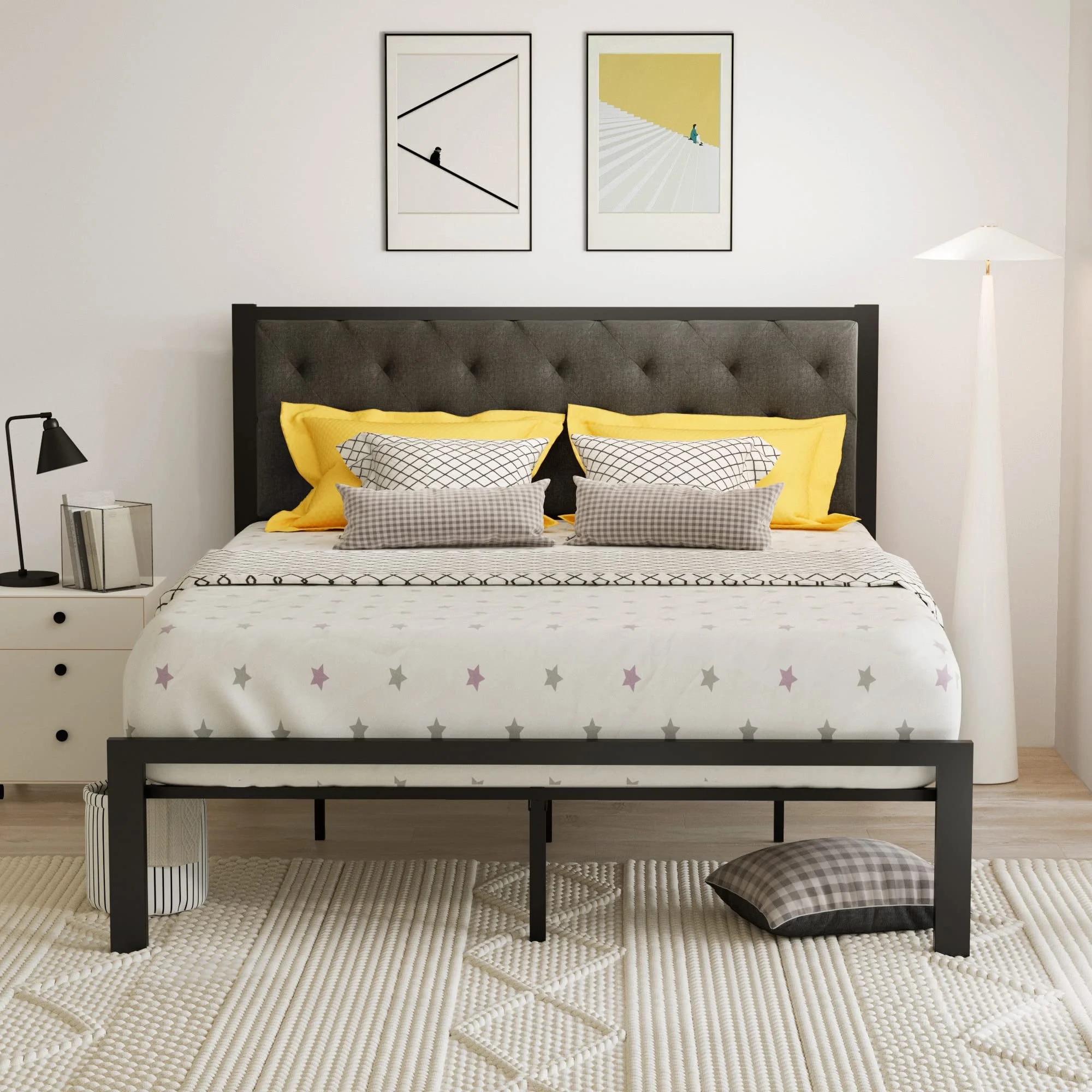 Einfach Full Size Platform Bed Frame with Button Tufted Headboard, Grey