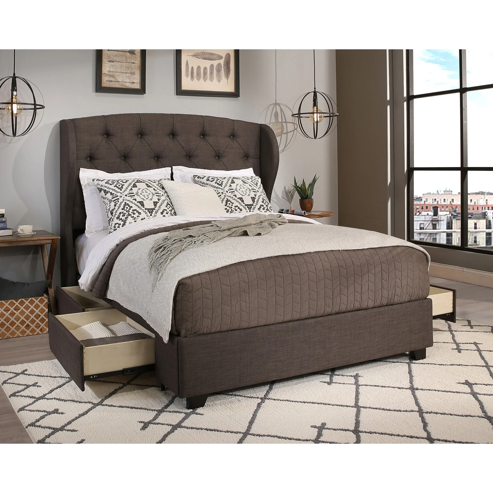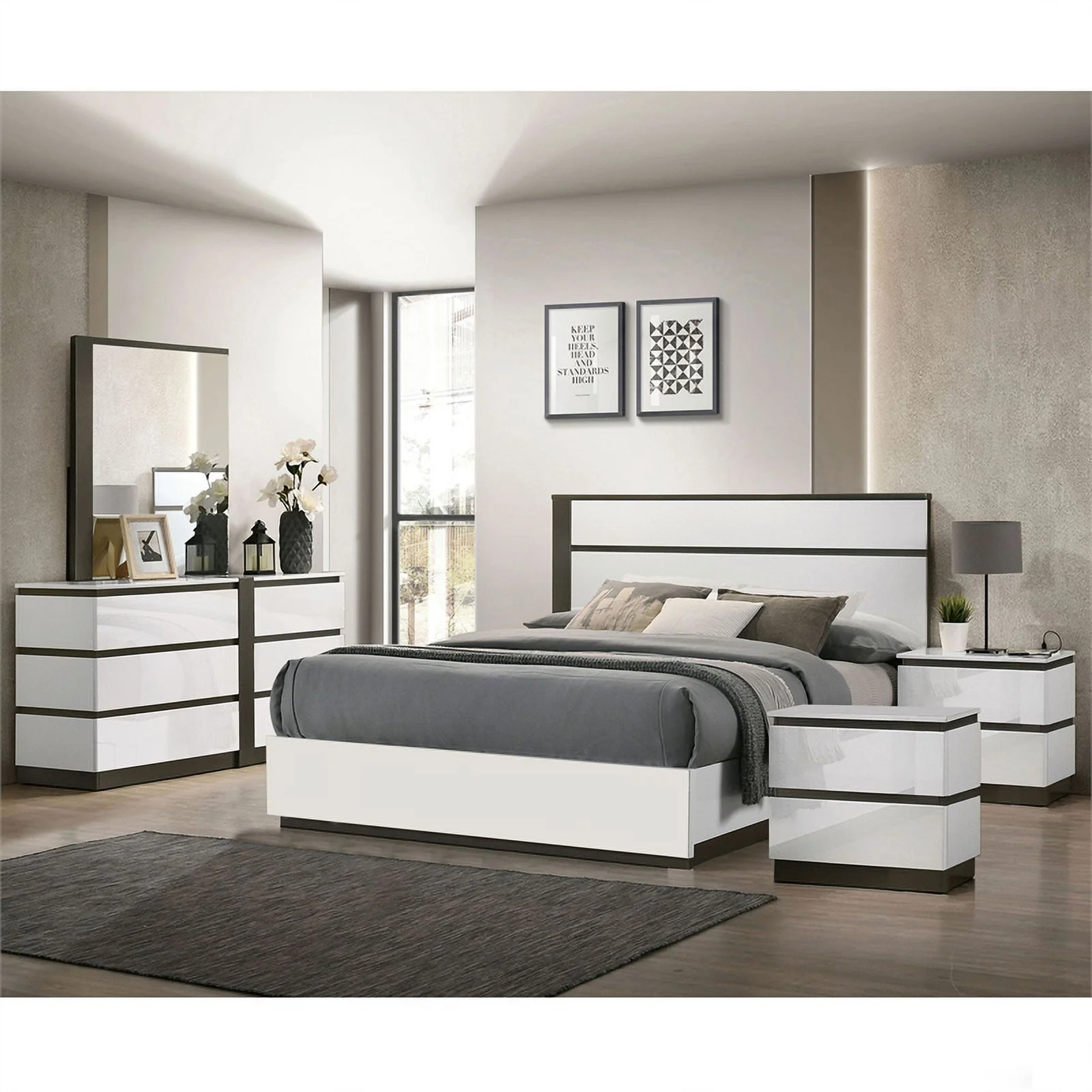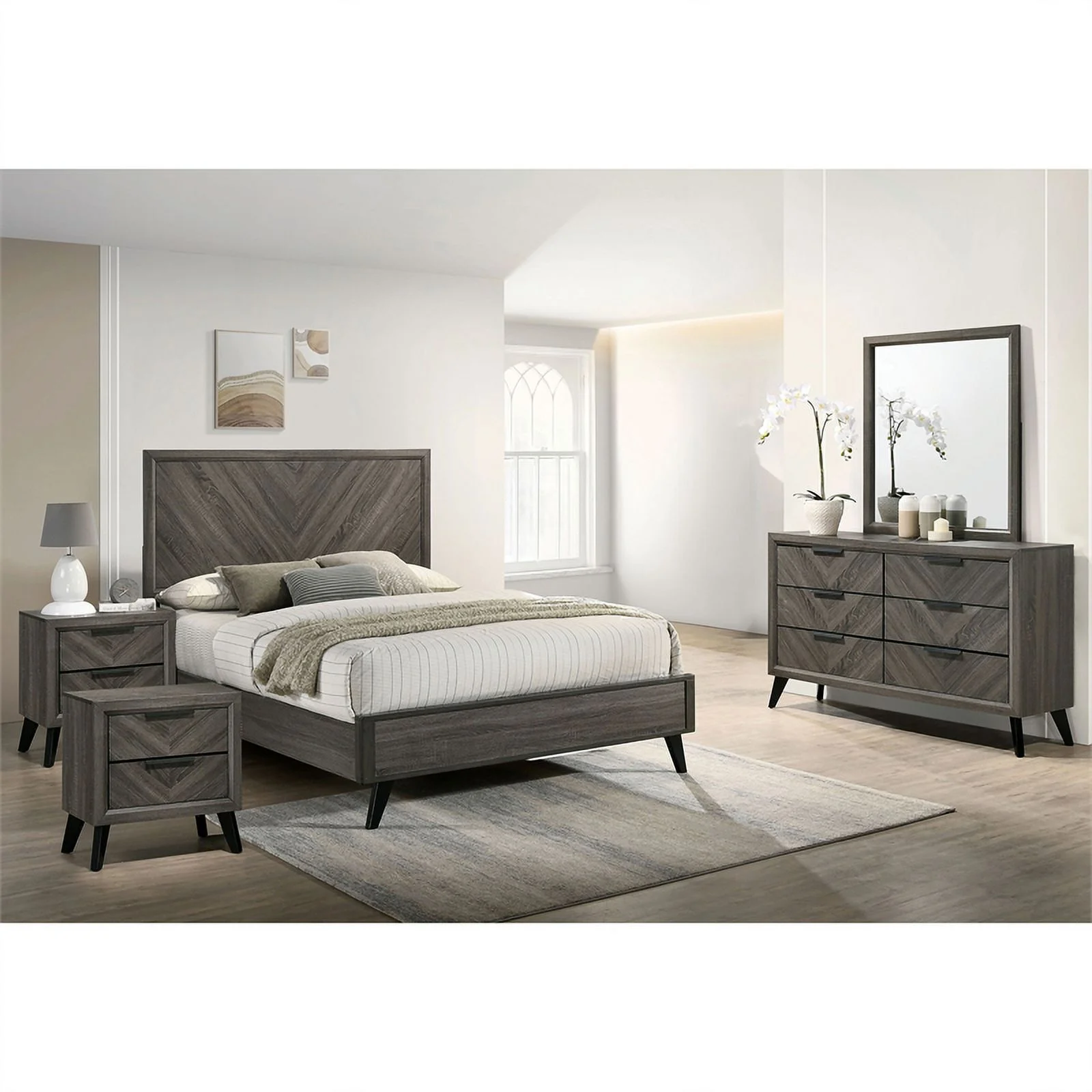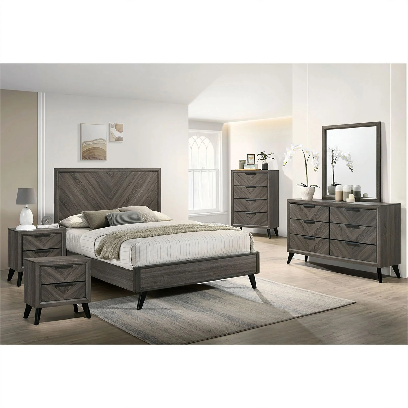 FOA Hean 5pc Gray Wood Bedroom Set - King + 2 Nightstands + Dresser + Mirror