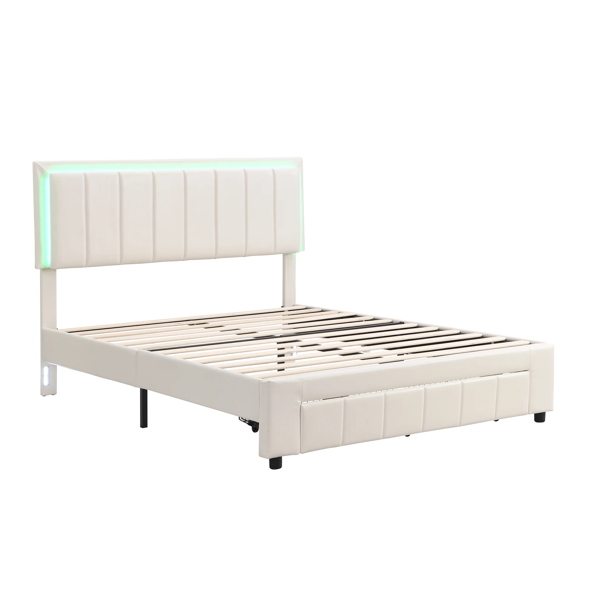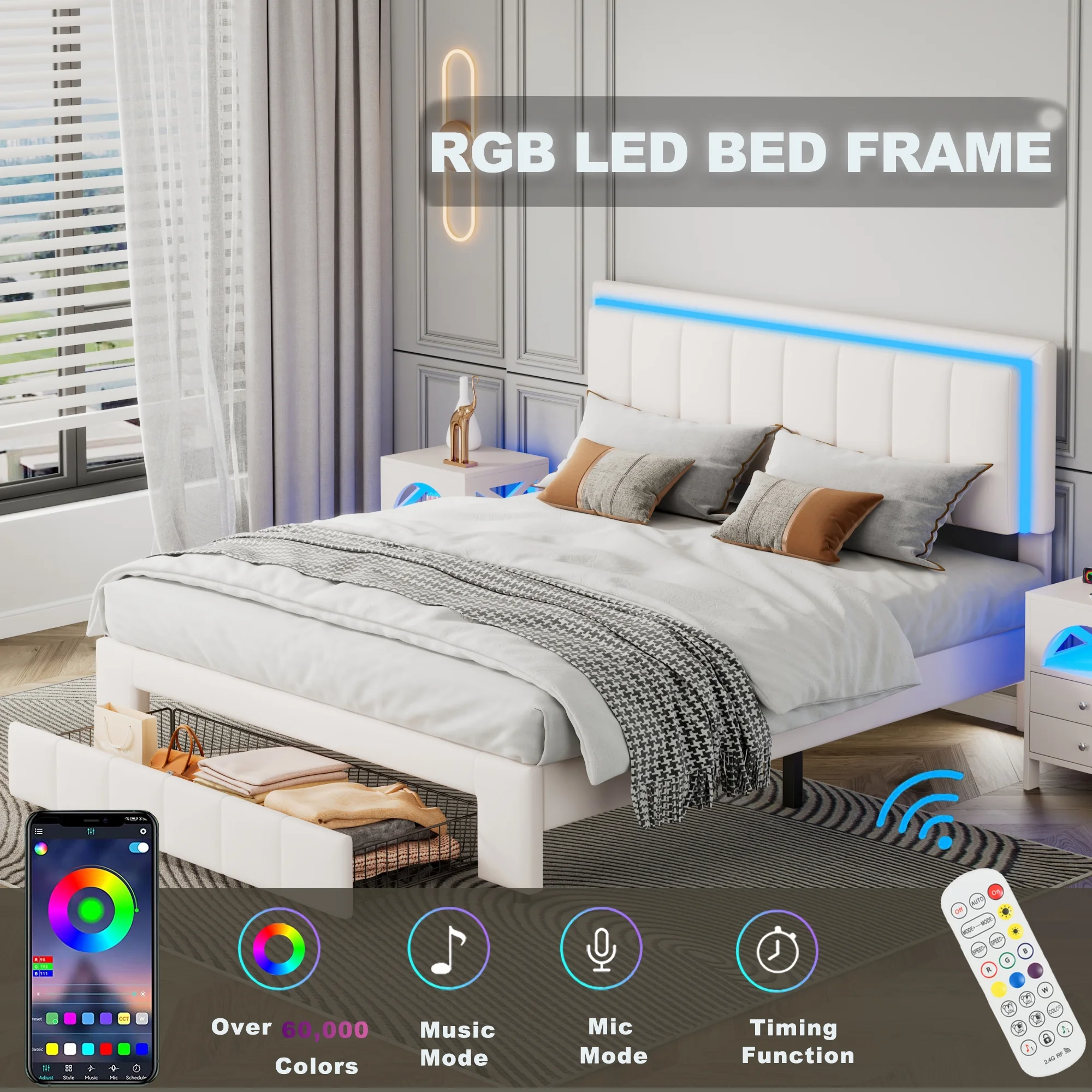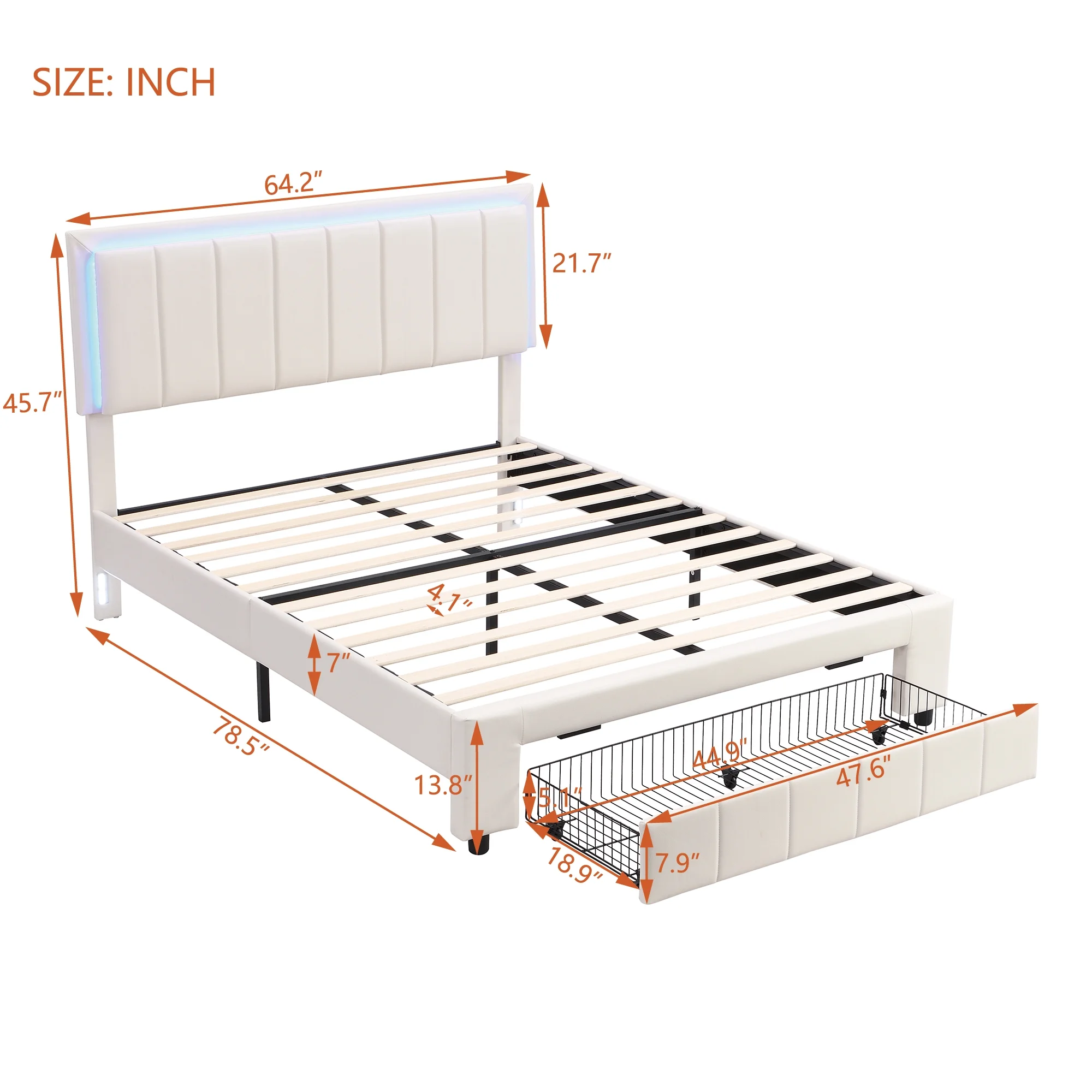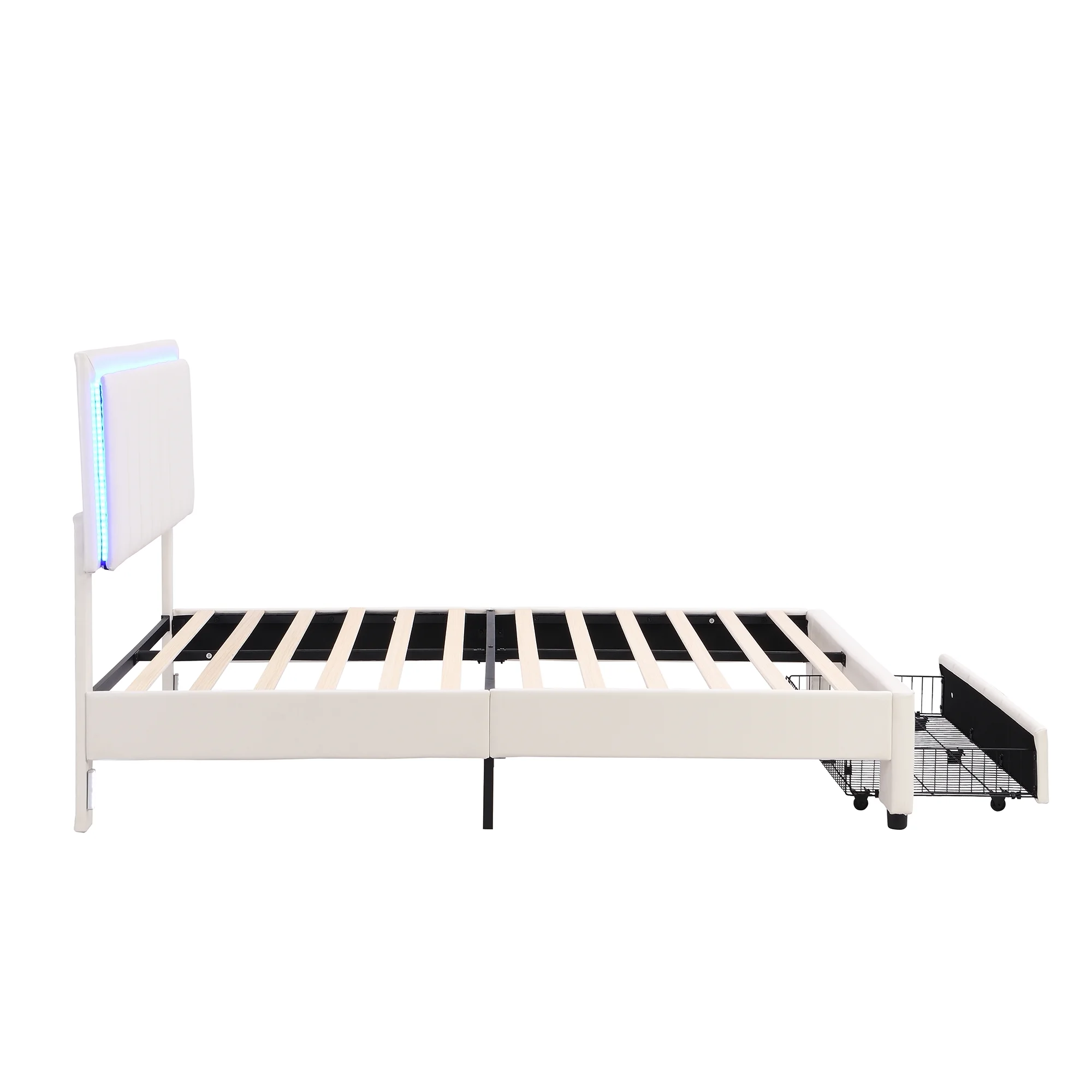 Upholstered Platform Bed with LED Lights and Two Motion Activated Night Lights,Queen Size Storage Bed with Drawer,White