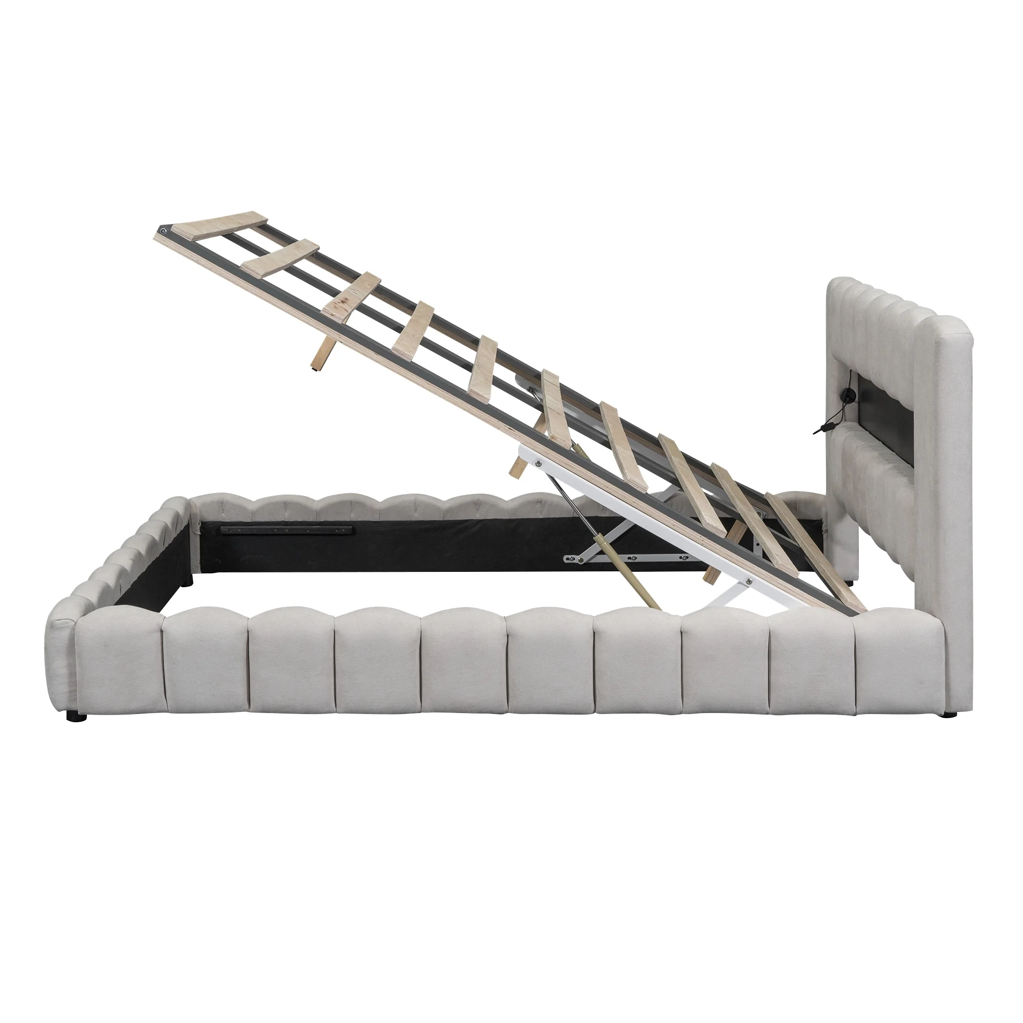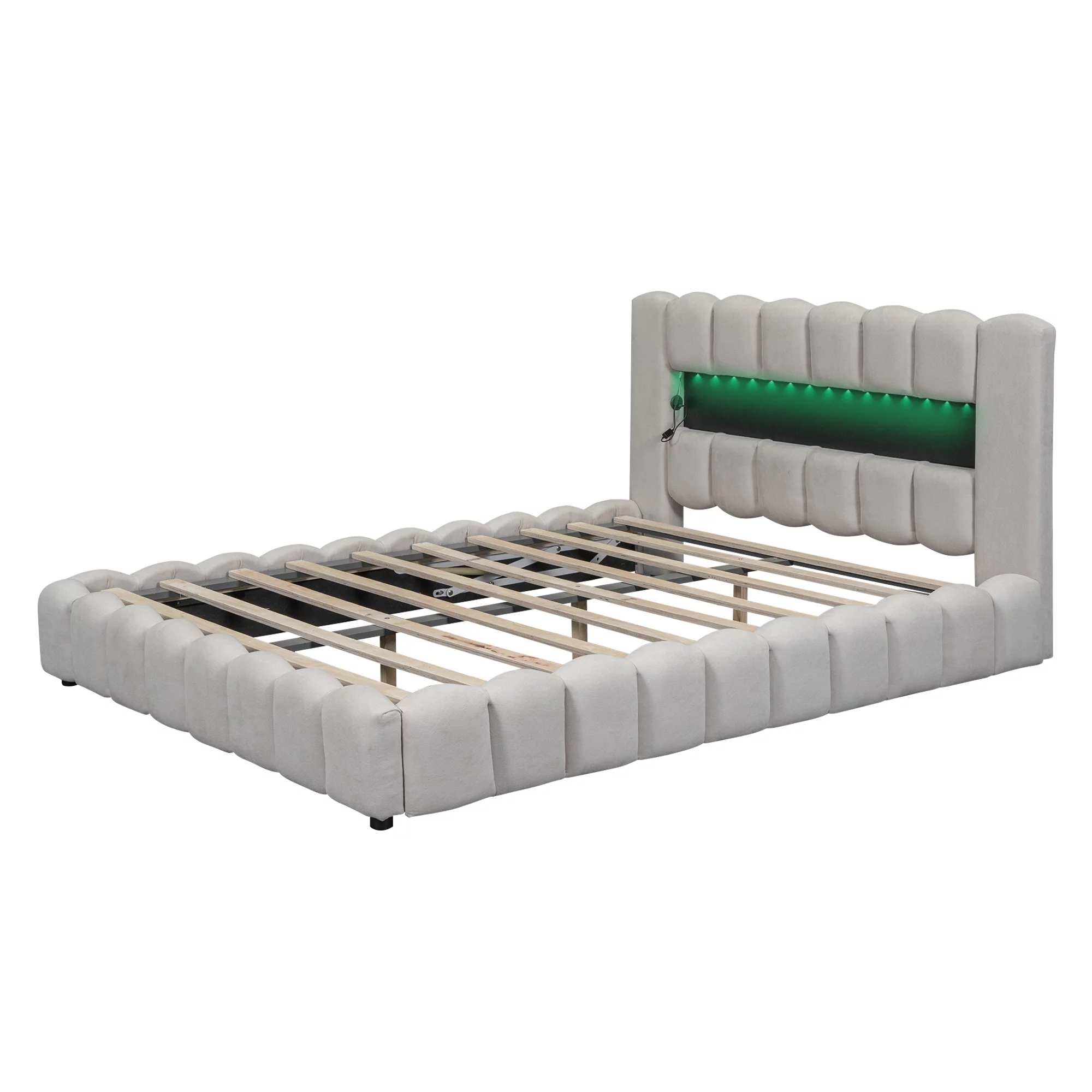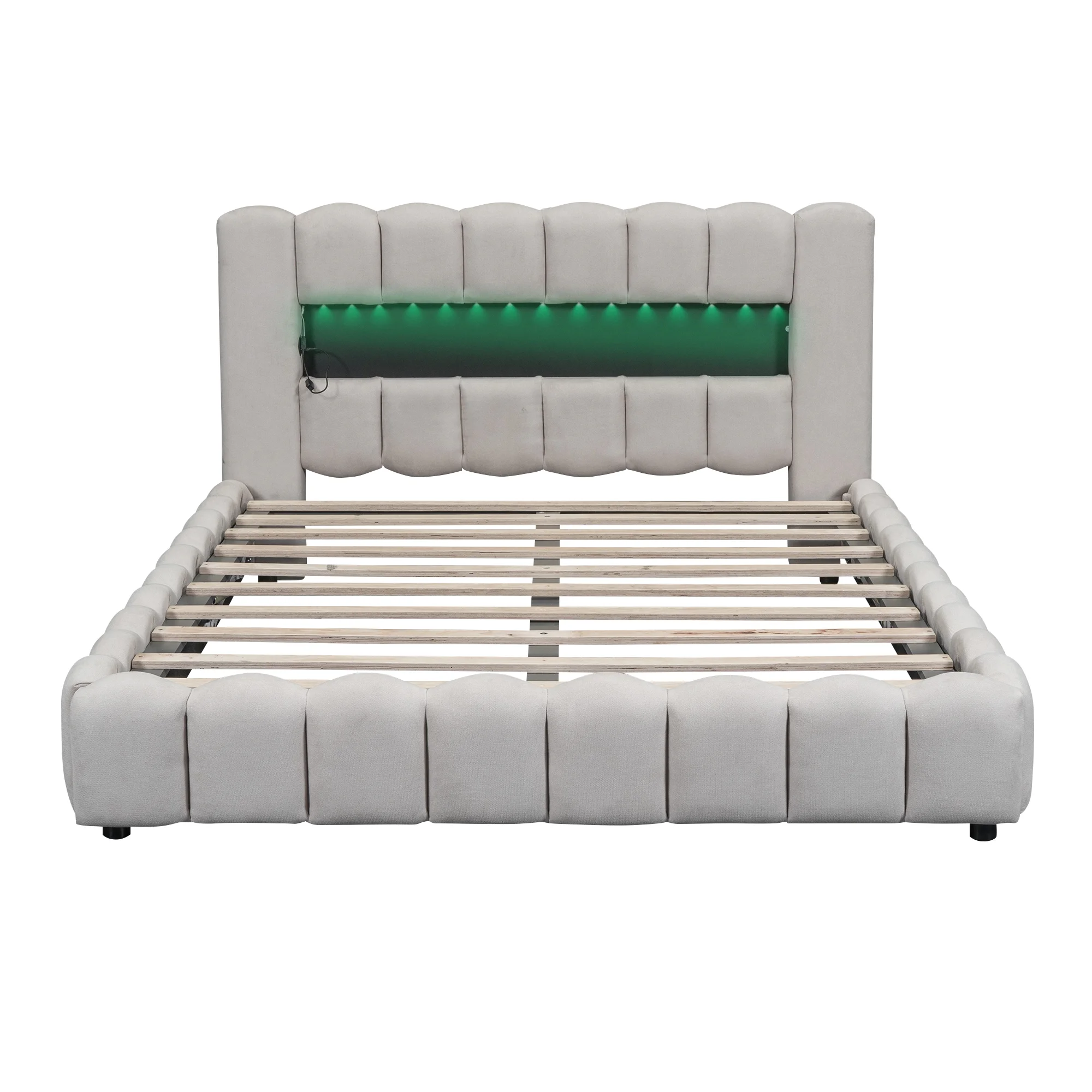 Nestfair Beige Queen Size Upholstered Platform Bed with LED Headboard and USB