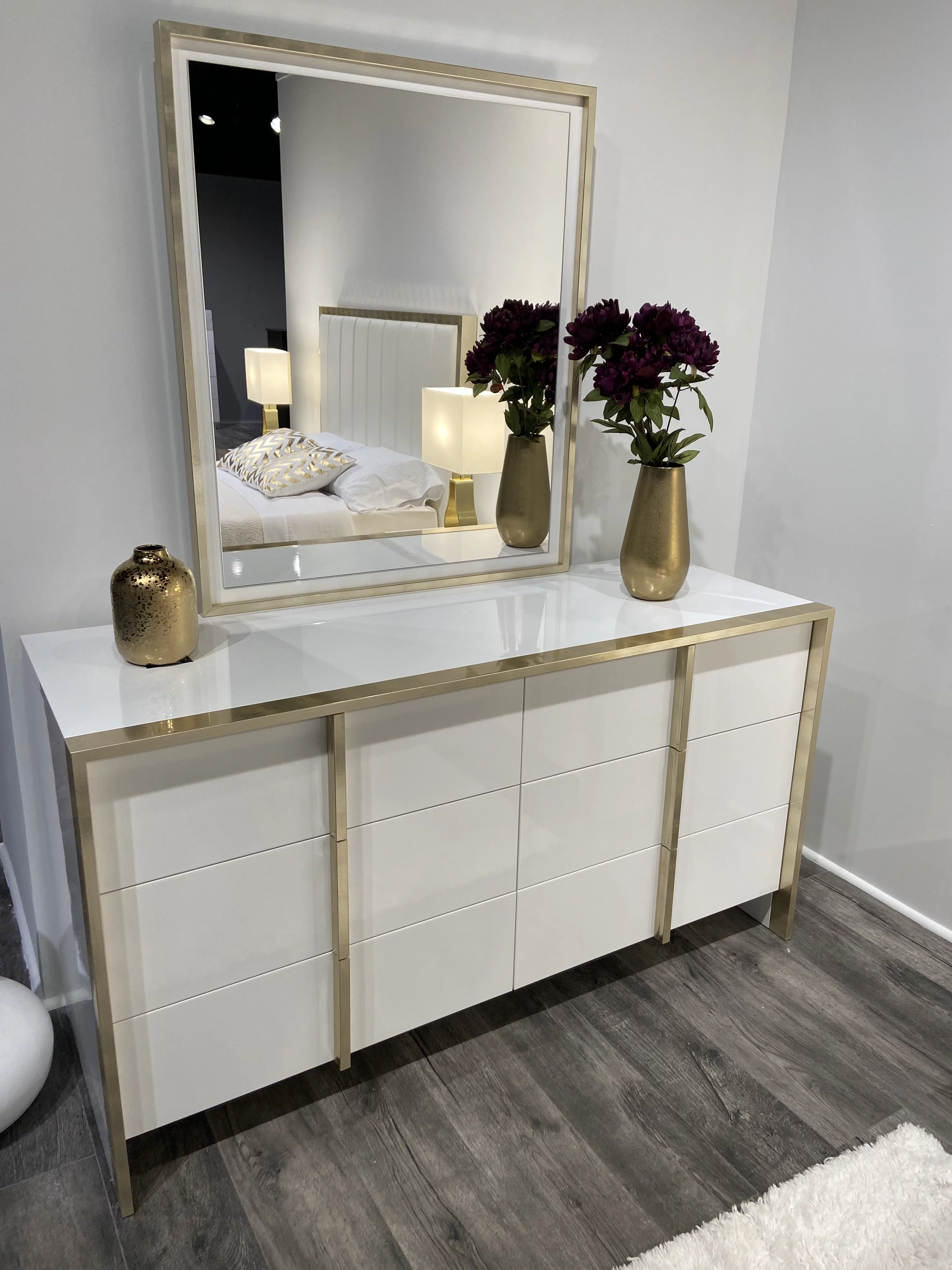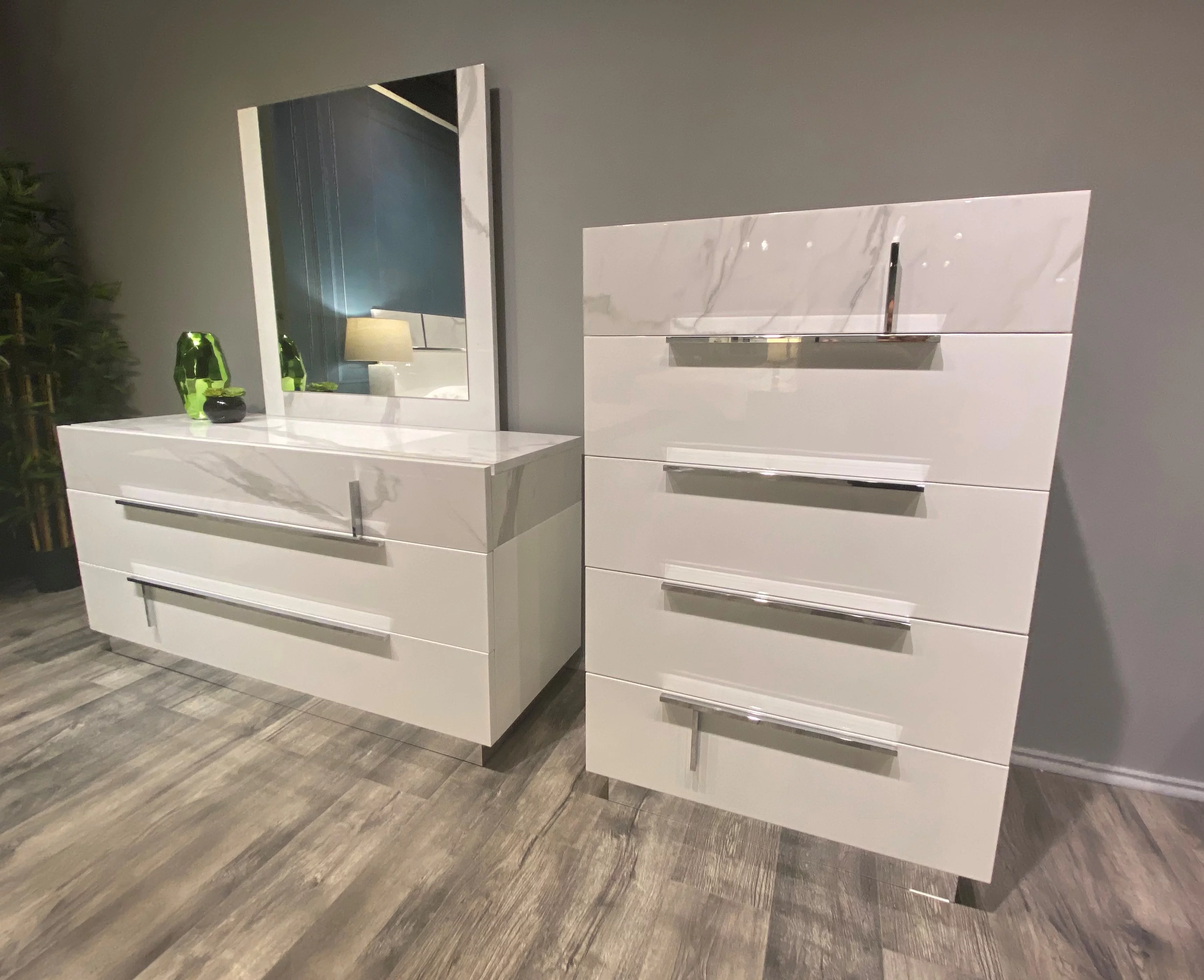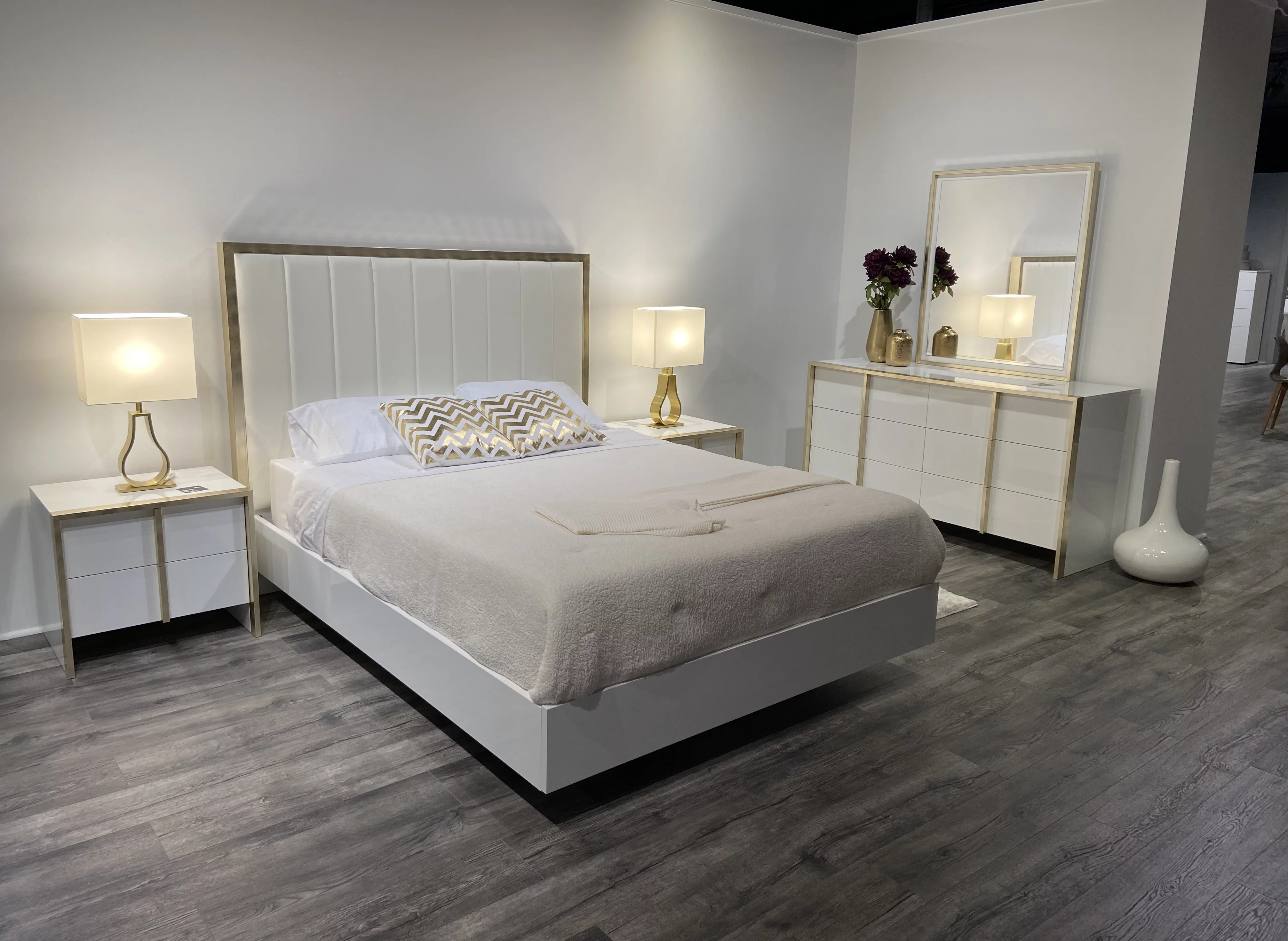 J&M Furniture Fiocco Premium Bedroom with 6 piece queen bed, cest , dresser, mirror and 2 nightstand, queen bedroom set