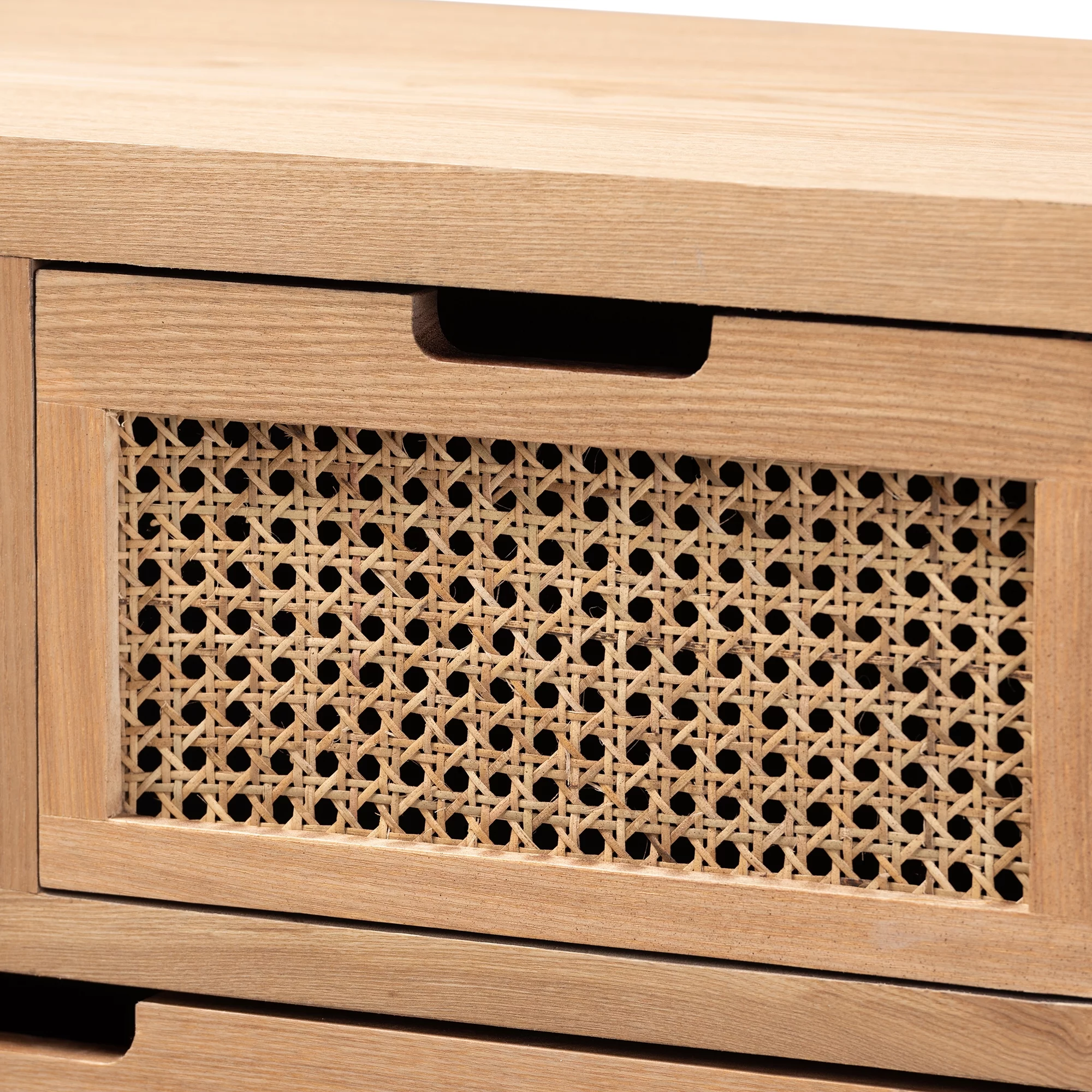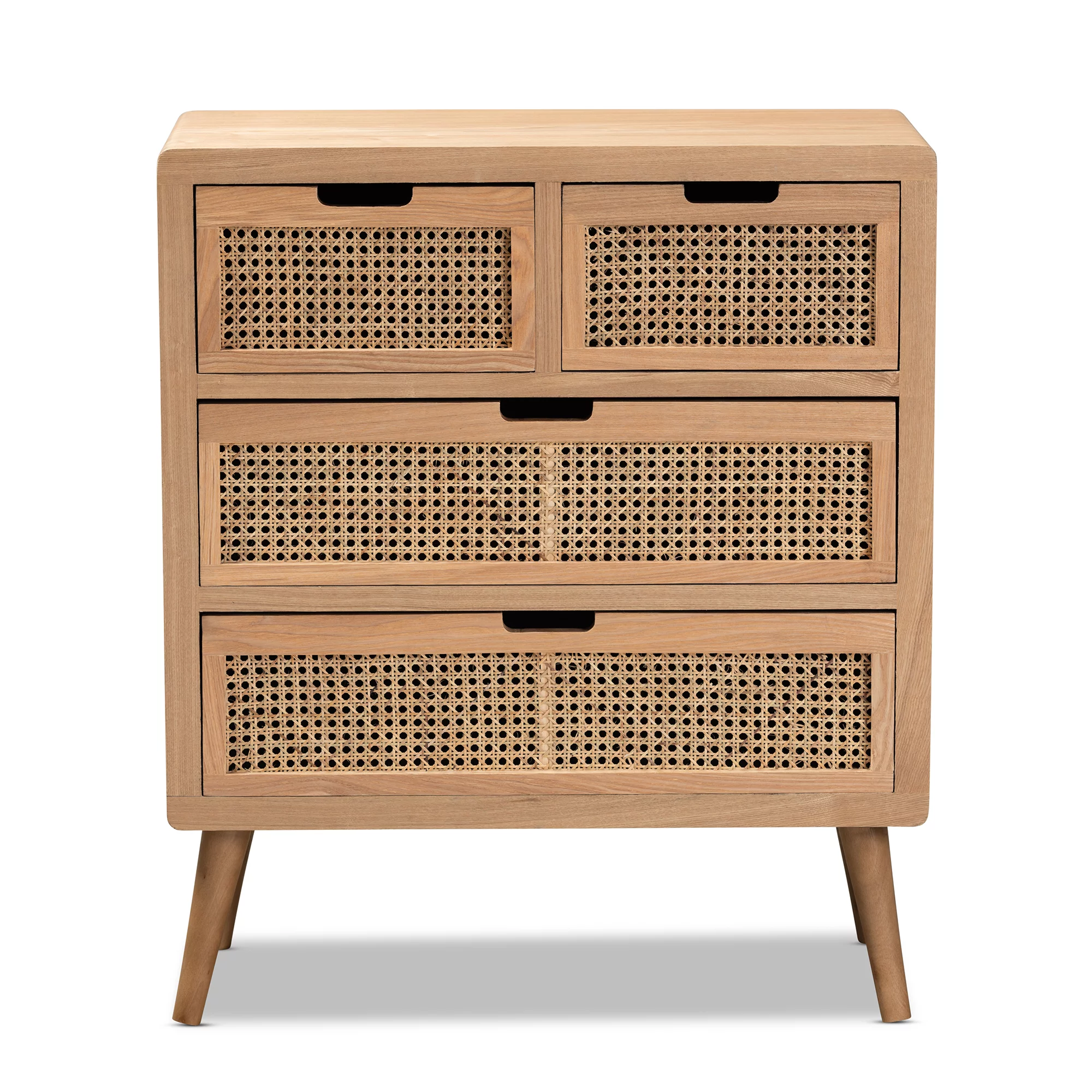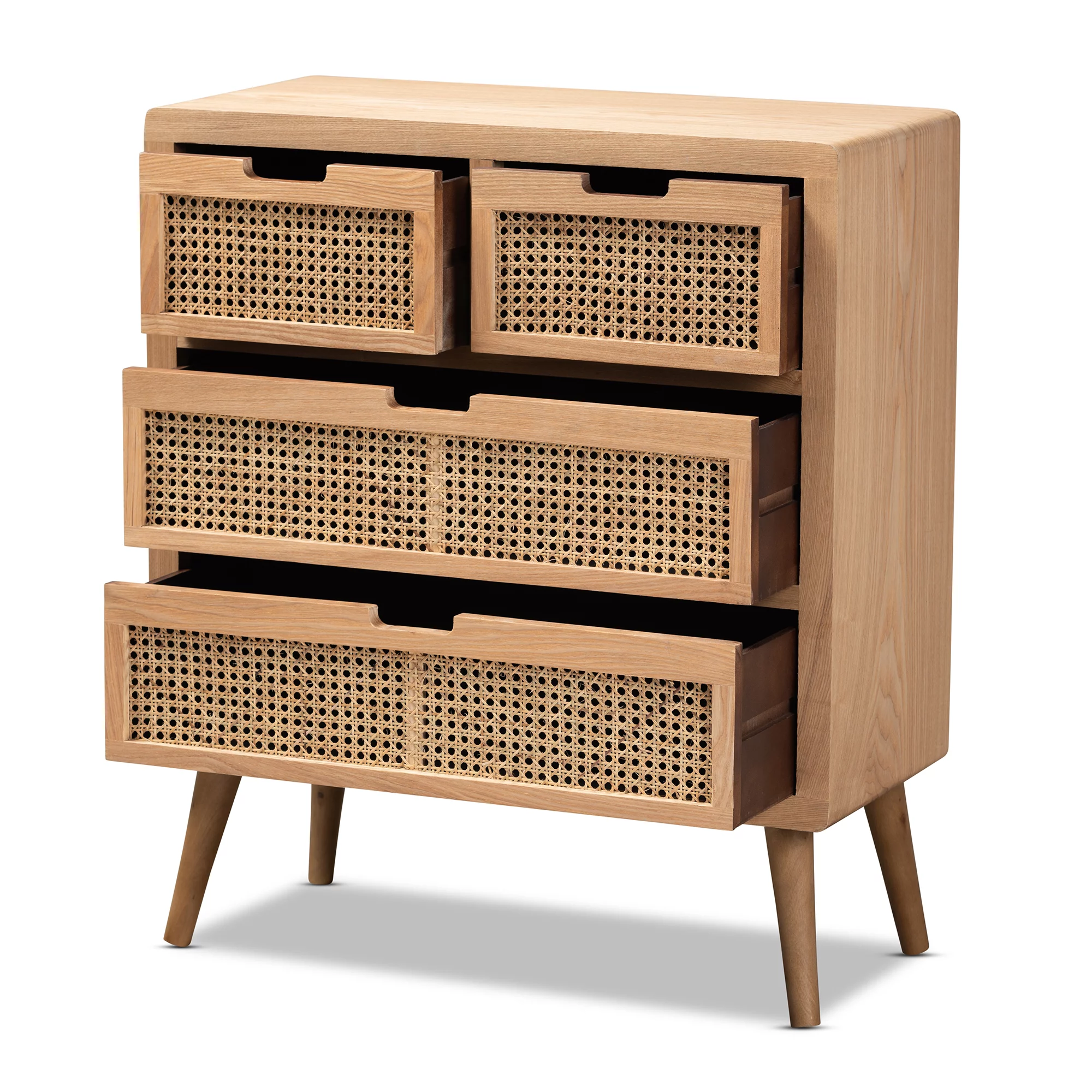 Baxton Studio Alina Mid-Century Modern Medium Oak Finished Wood and Rattan 4-Drawer Accent Chest