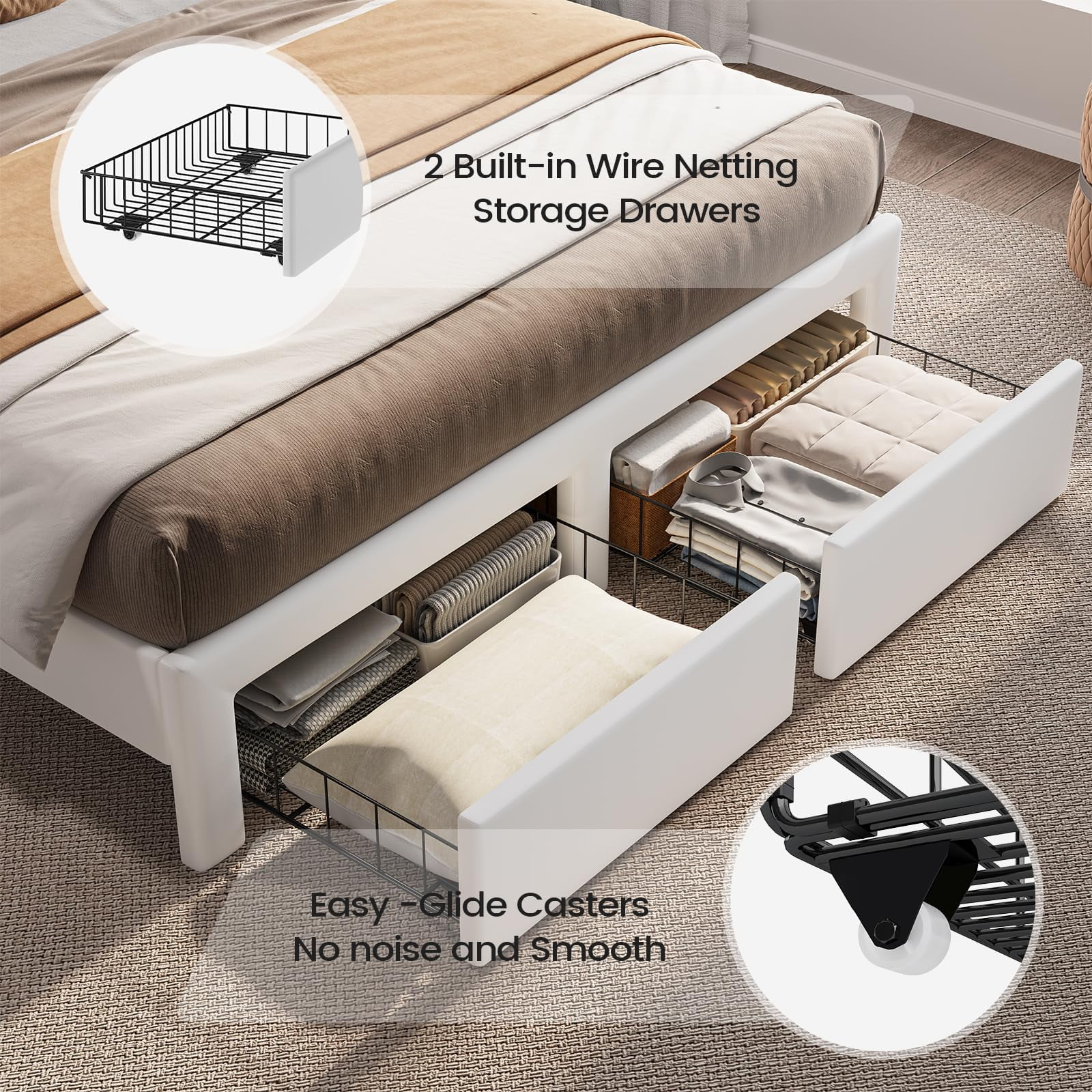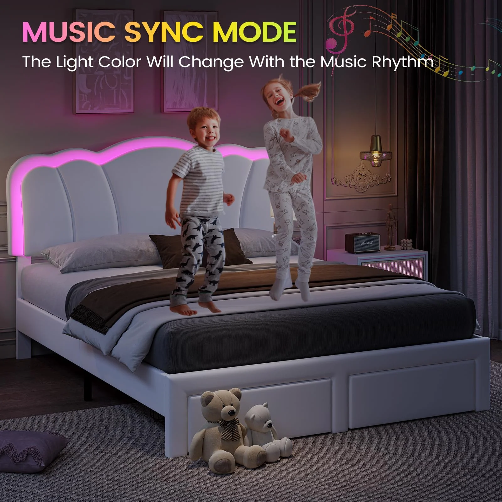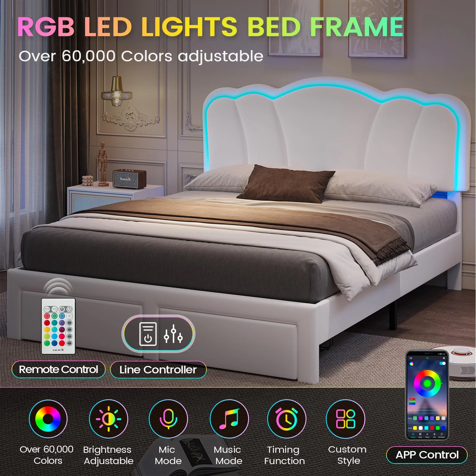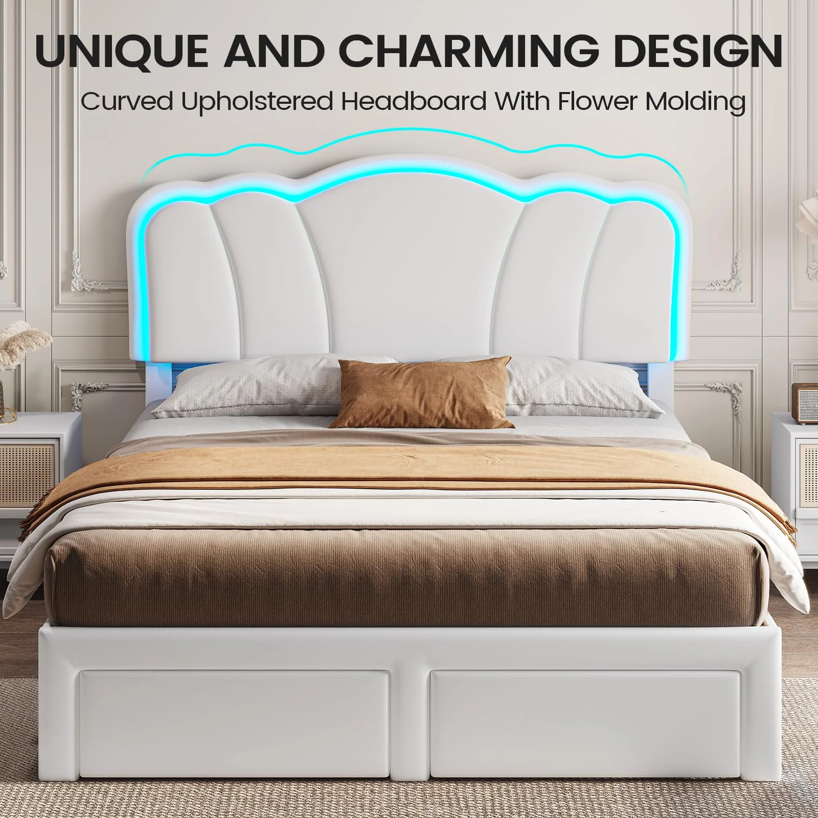 Queen Size Led Bed Frame with 2 Storage Drawers,Upholstered Platform Storage Bed with Drawers and Flower Headboard,White