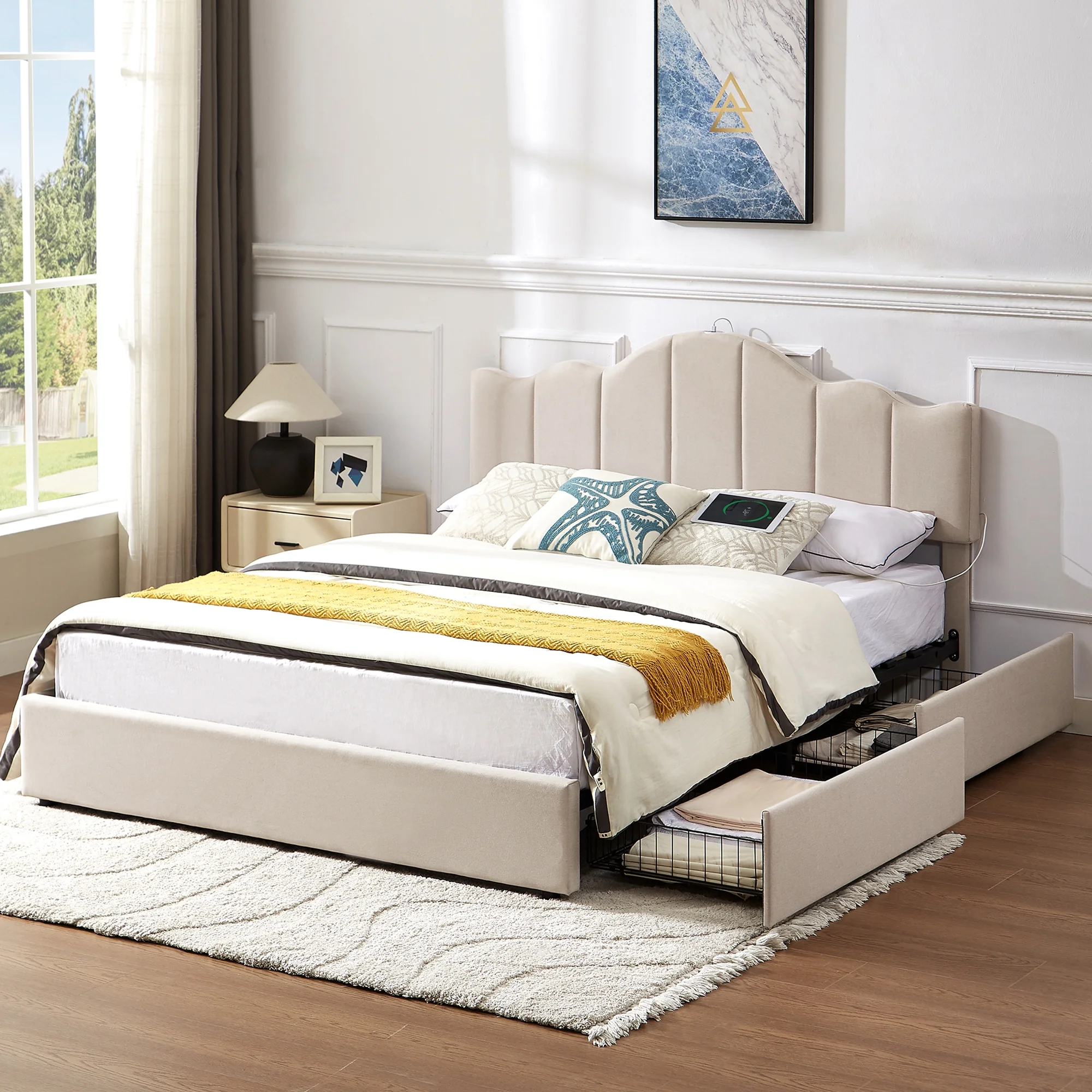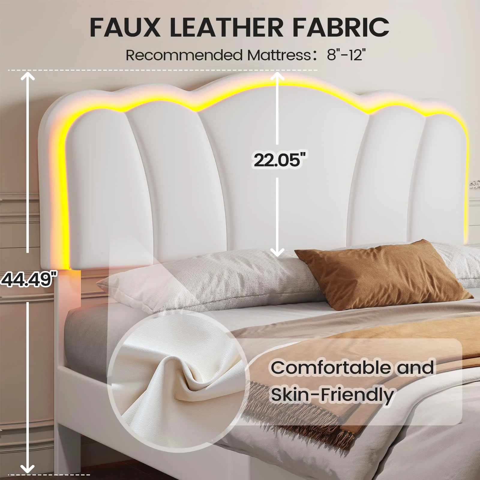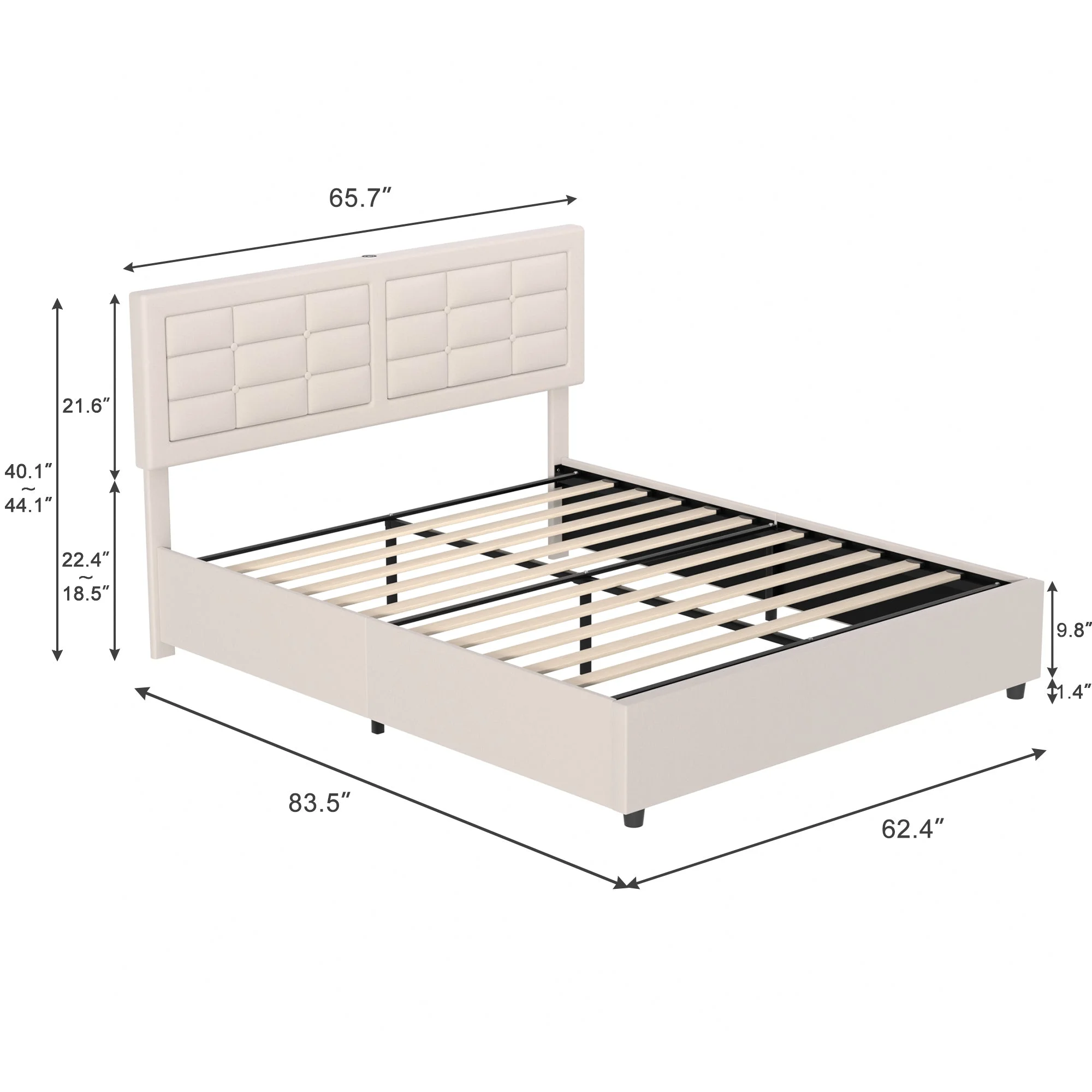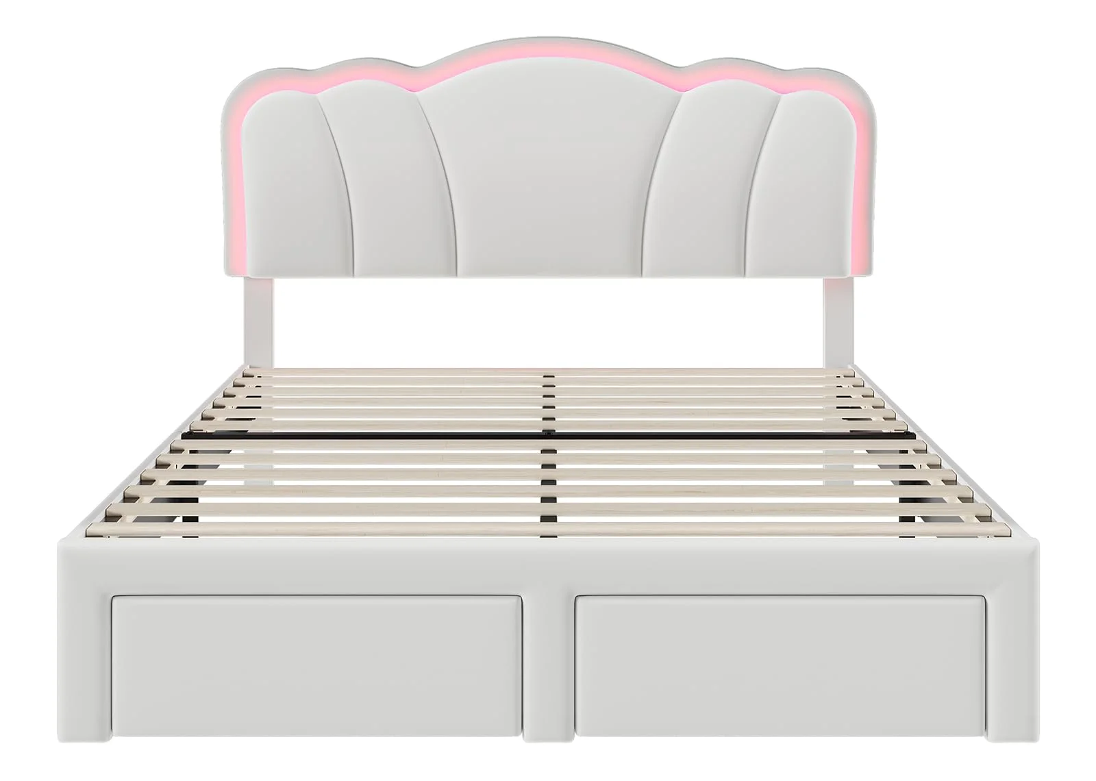 Queen Size Led Bed Frame with 2 Storage Drawers,Upholstered Platform Storage Bed with Drawers and Flower Headboard,White