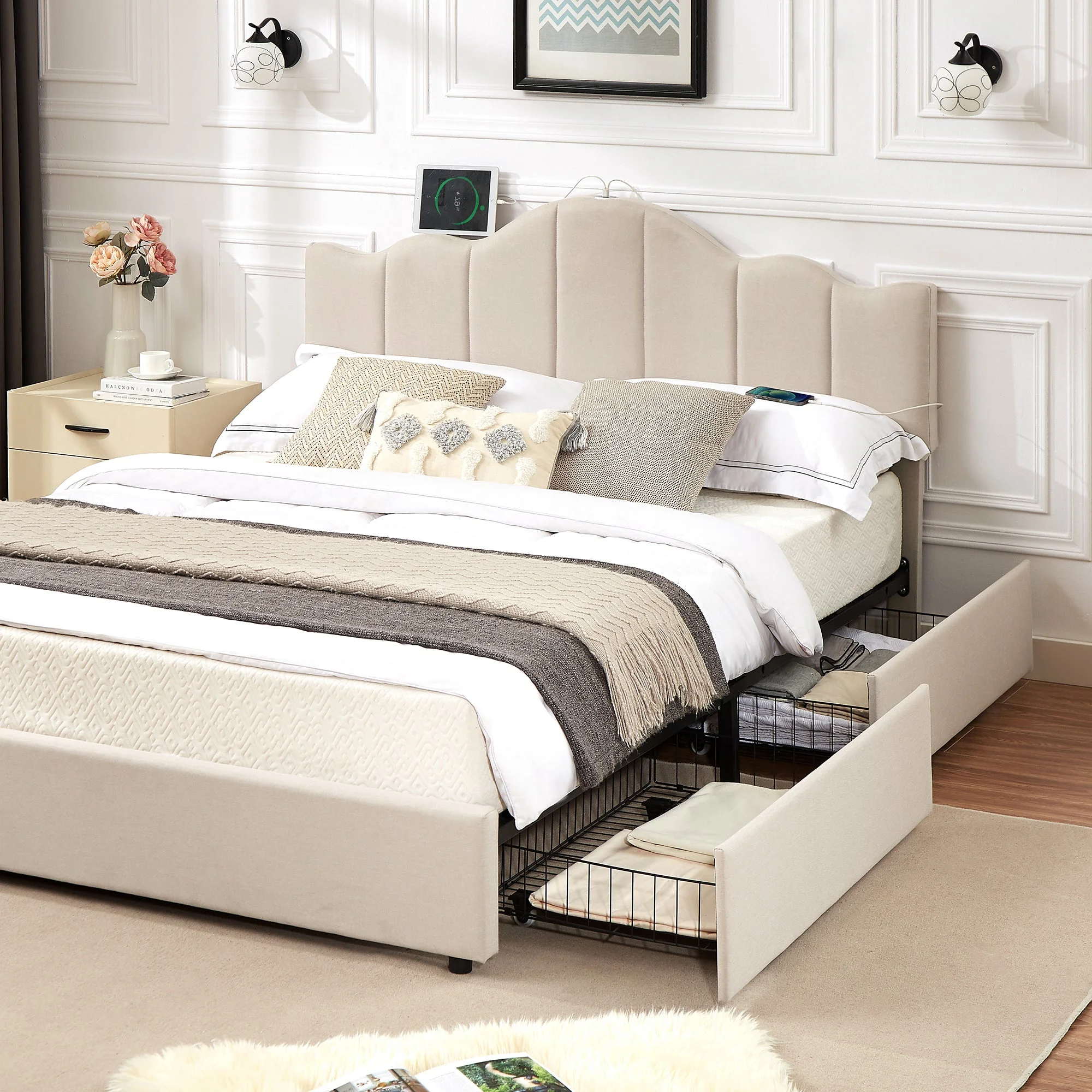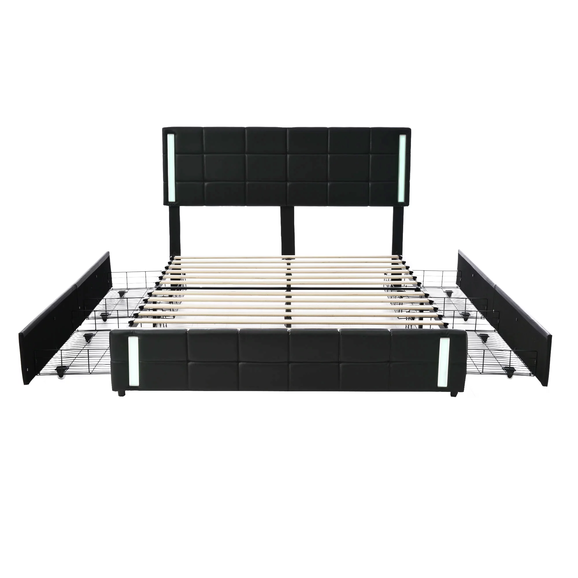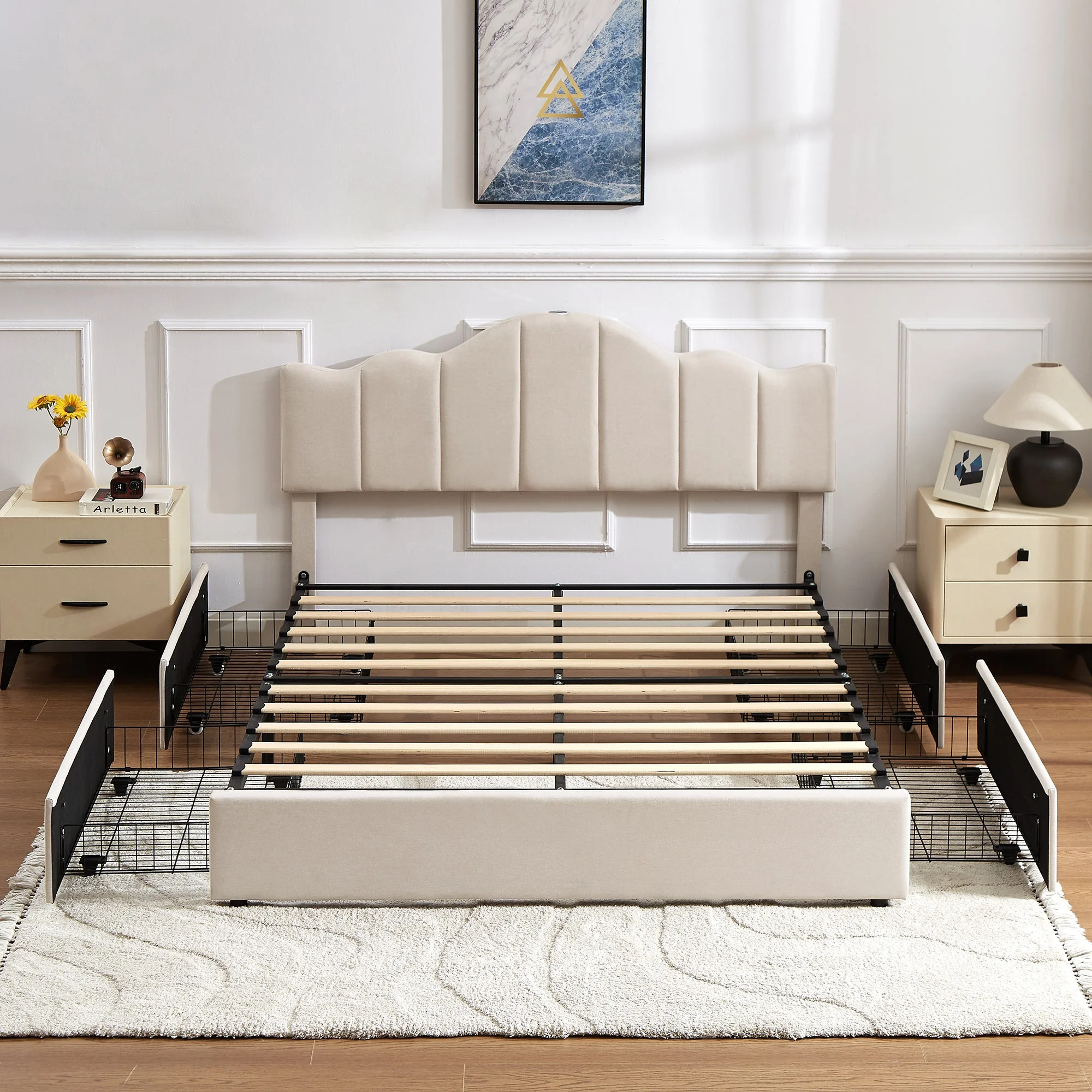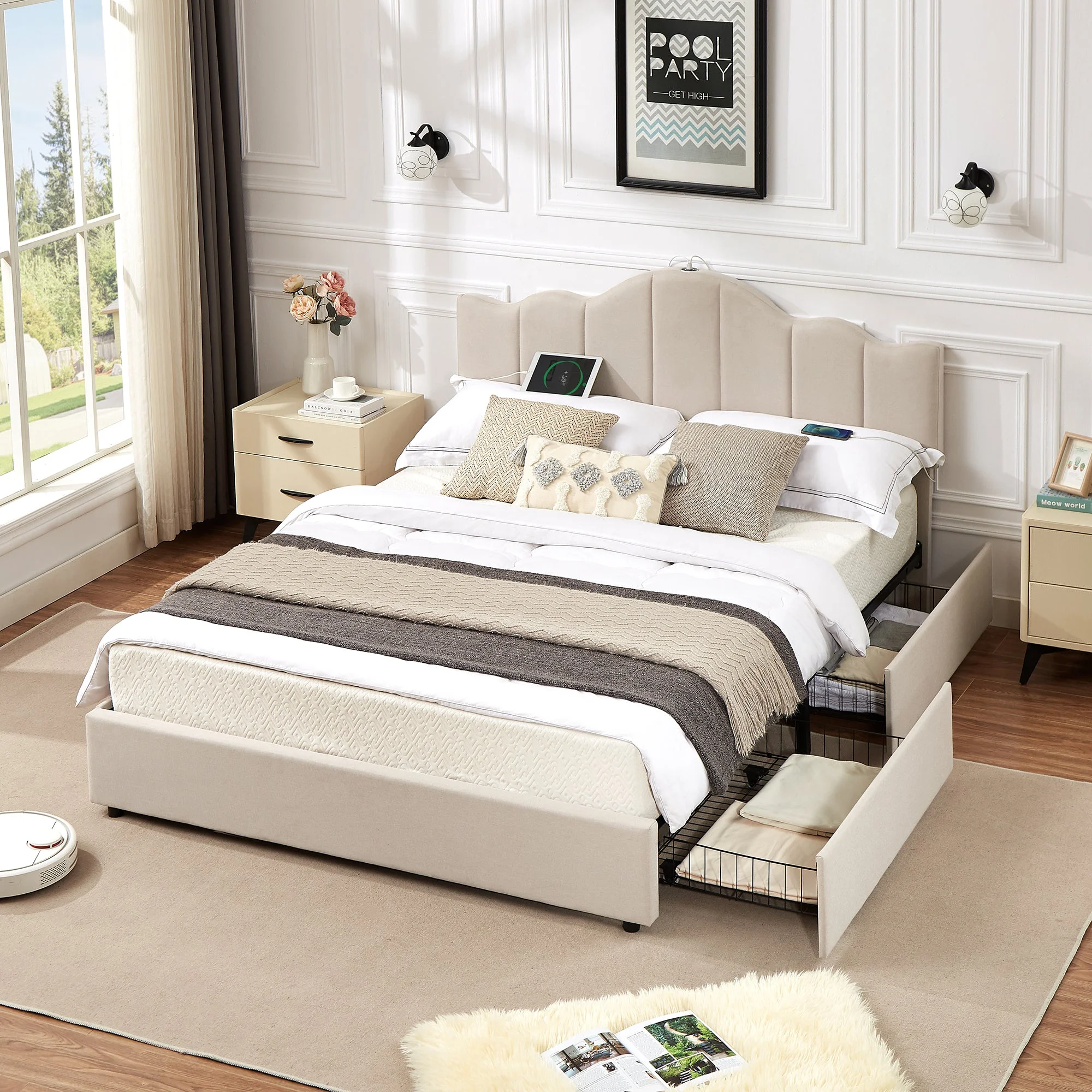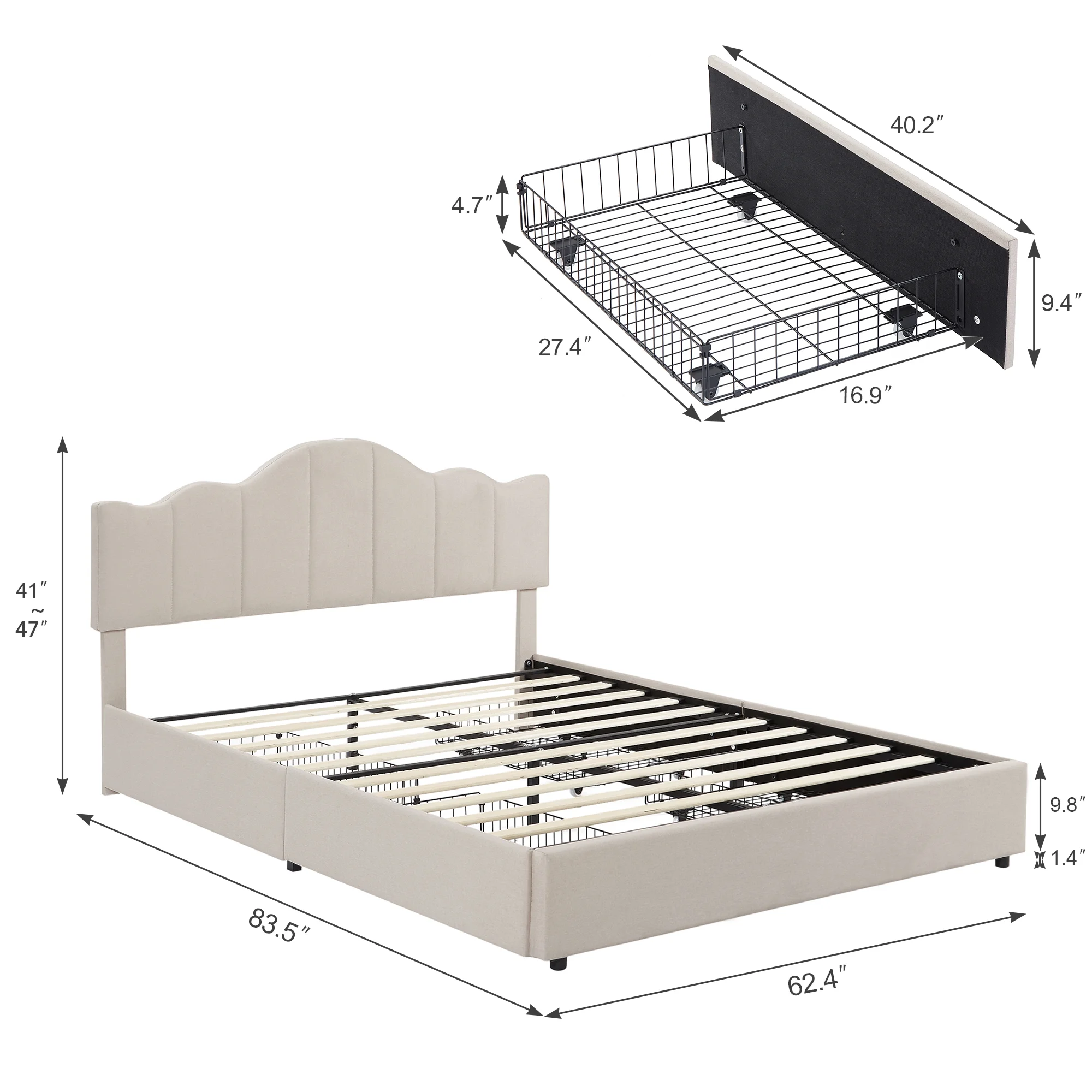 Queen Size Led Bed Frame with 2 Storage Drawers,Upholstered Platform Storage Bed with Drawers and Flower Headboard,White