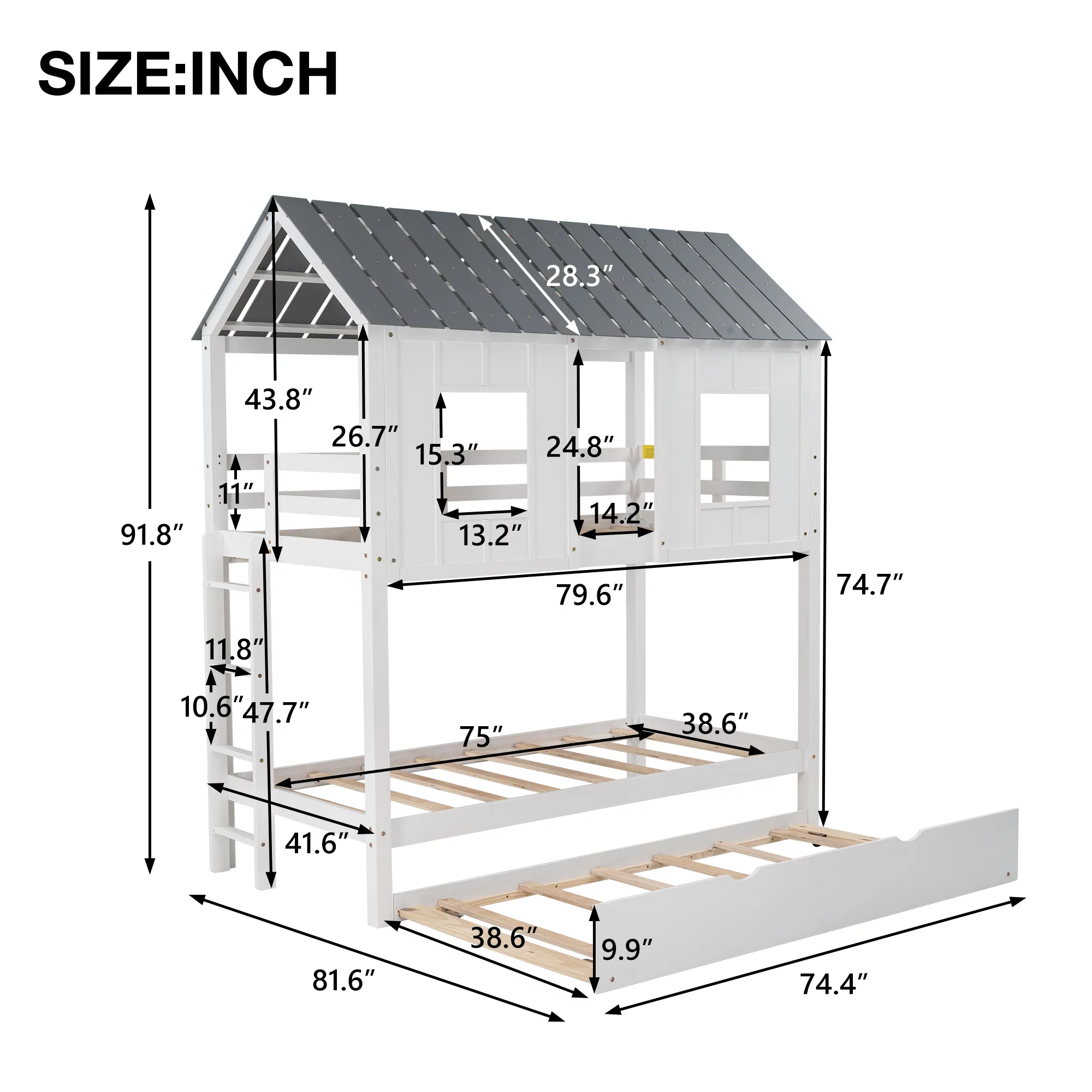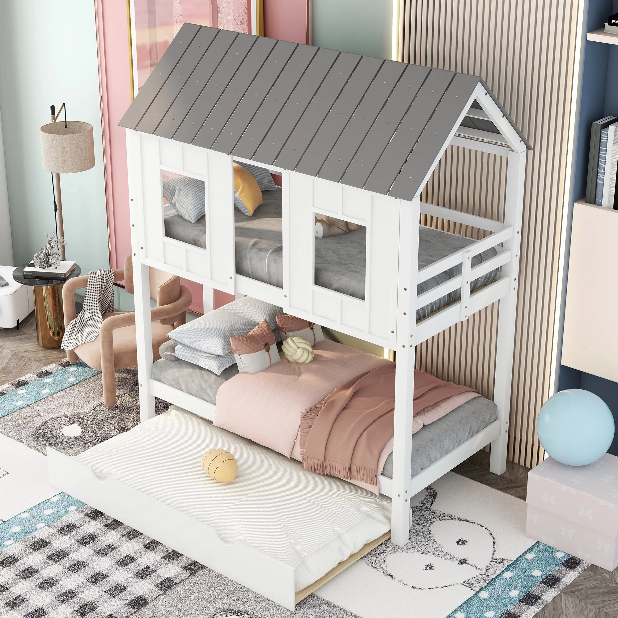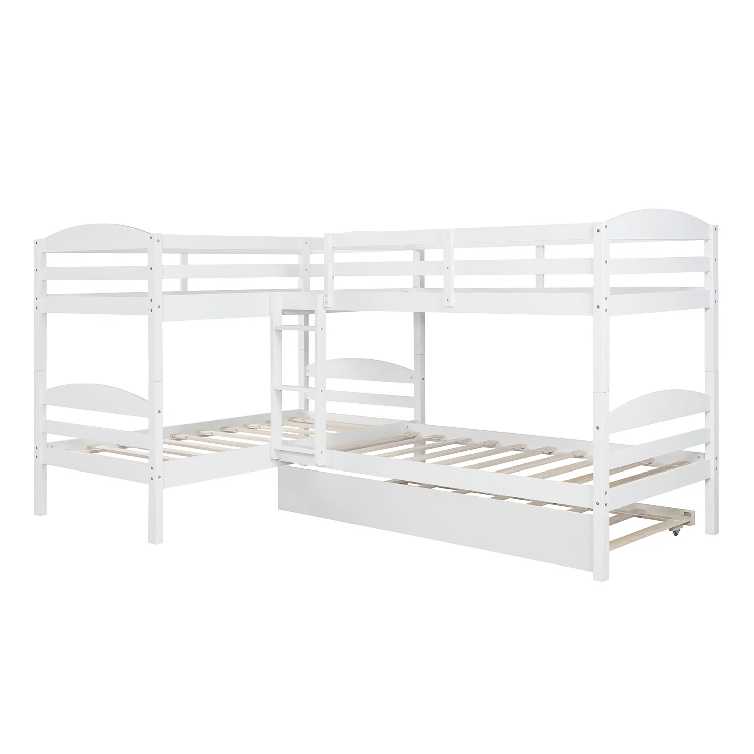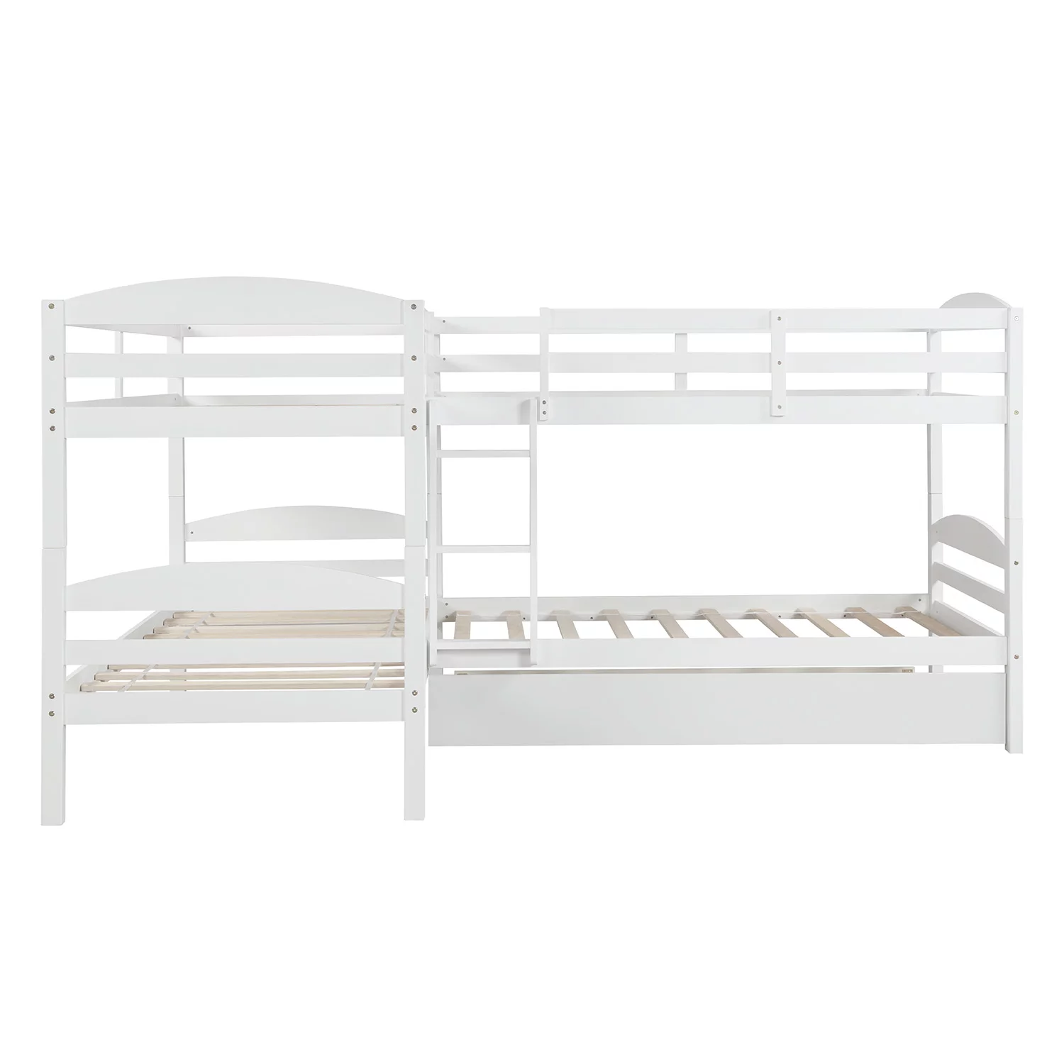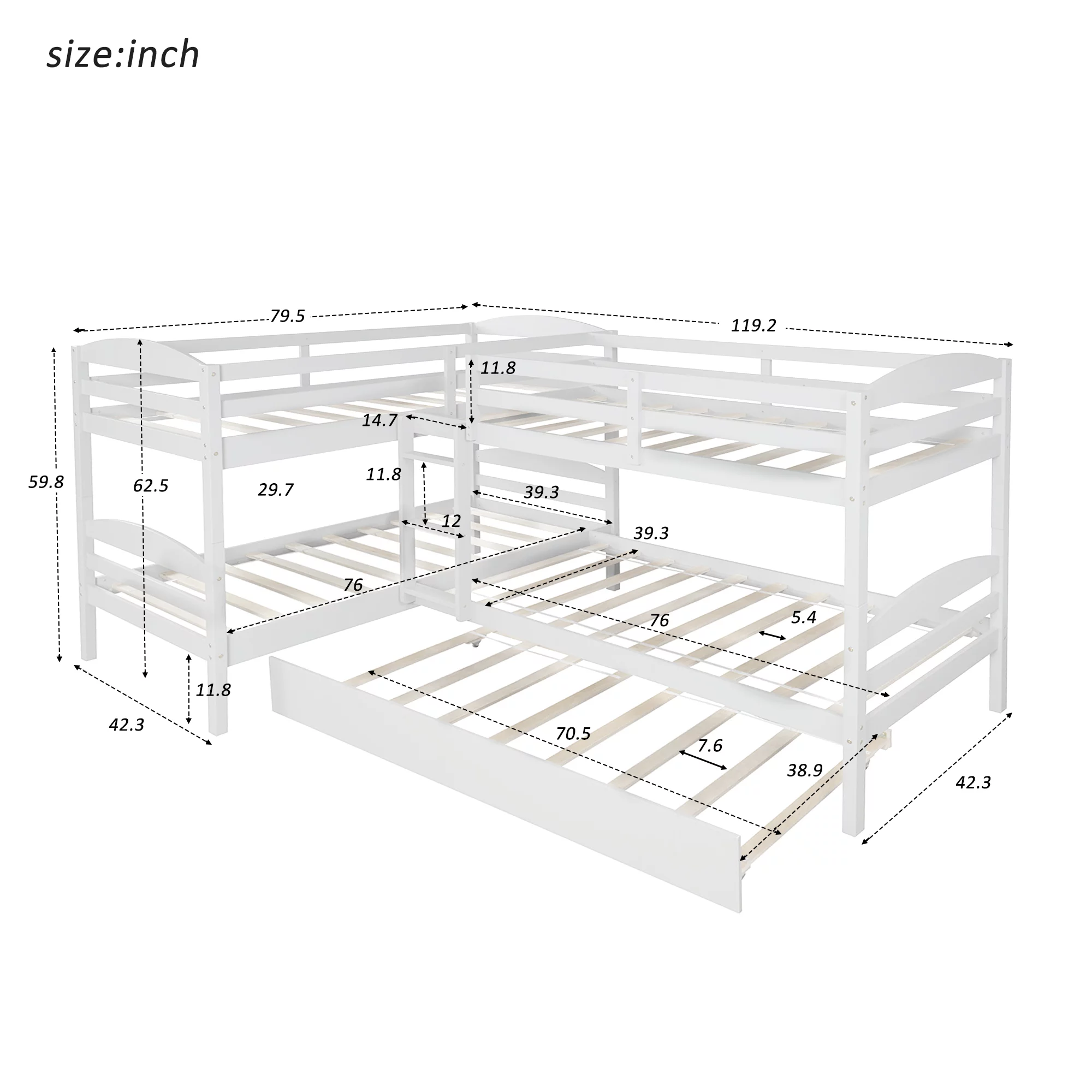 Twin L-Shaped Corner Bunk Bed and Loft Bed with Trundle Solid Wood Twin Bunk Bed Loft Bed with Guardrail, 5 Bed Bunk