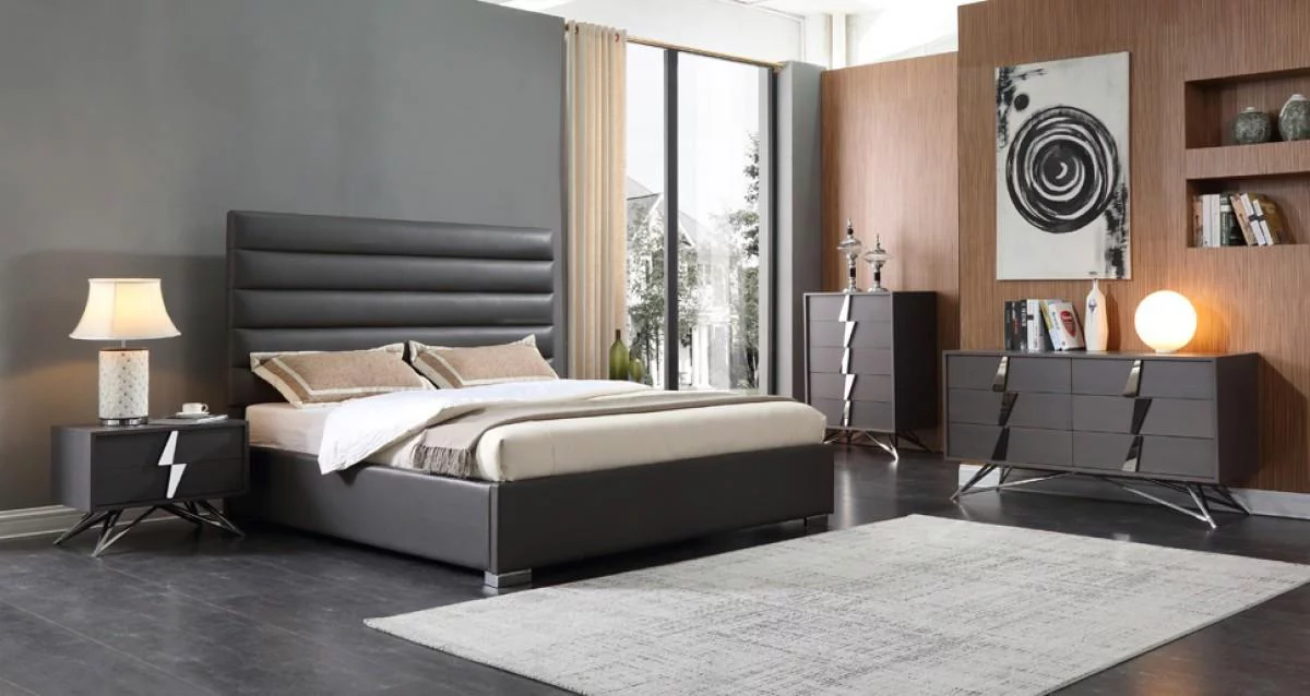 Eastern King Size Bed W Shelf LED HB Black High Gloss Lacquer Solid wood 1pc Bed Bedroom Furniture Chrome Metal Legs