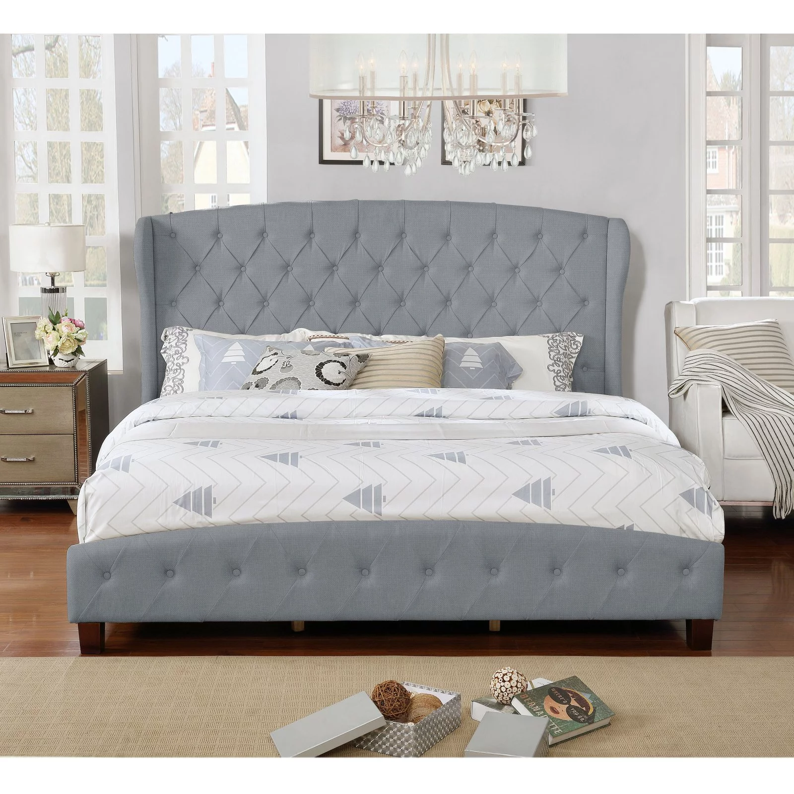 6pc Bedroom Eastern King Size Bed Set Transitional Style Dresser Mirror Nightstands Chest Wooden Furniture Grey Color