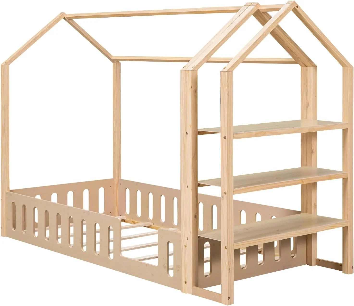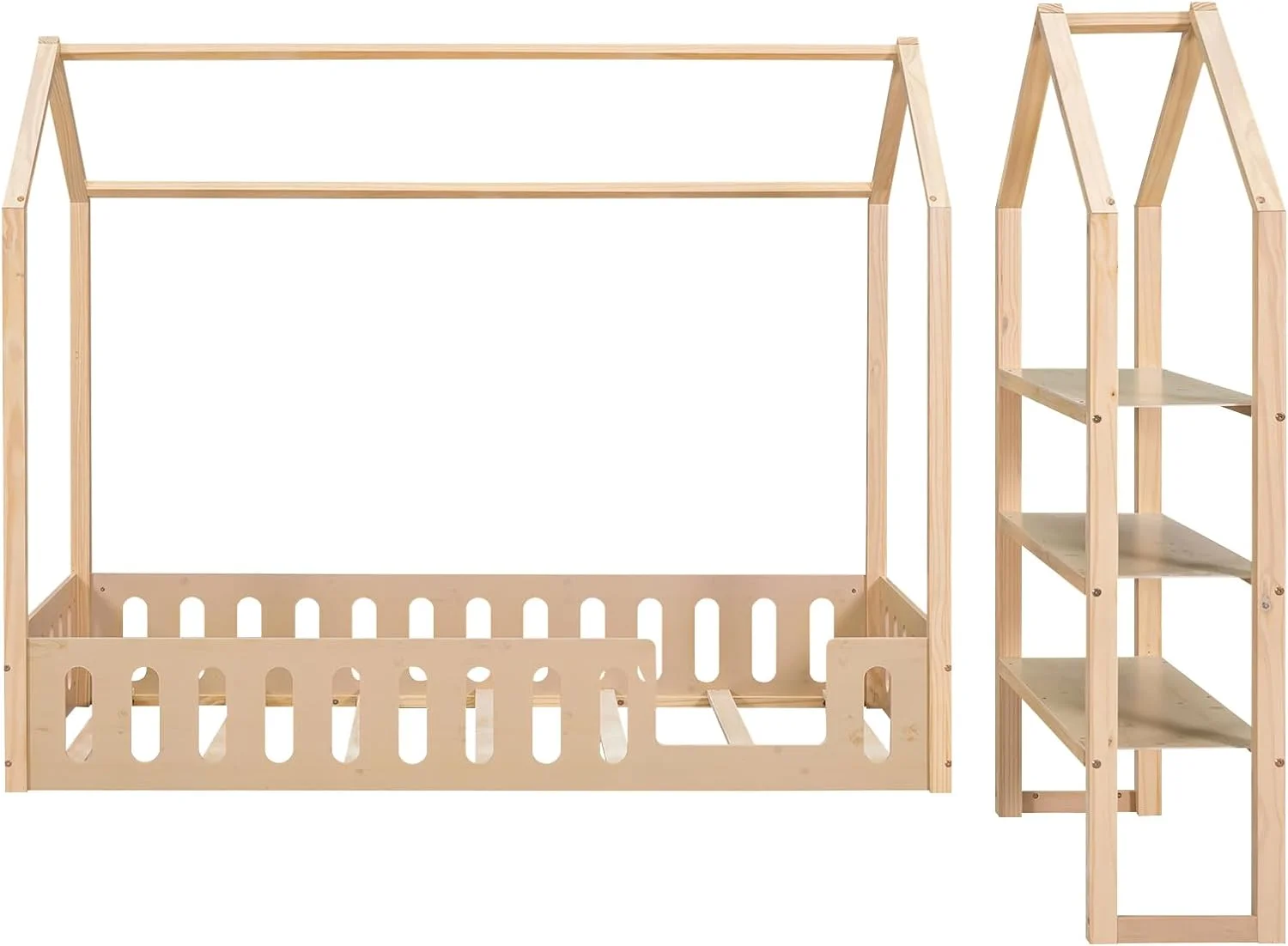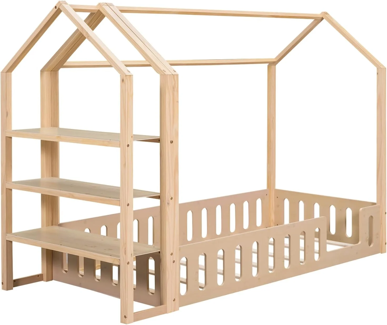 Momspeace Twin Size House-Shaped Floor Bed for Children with 2 Detachable Stands, Solid Wood, White