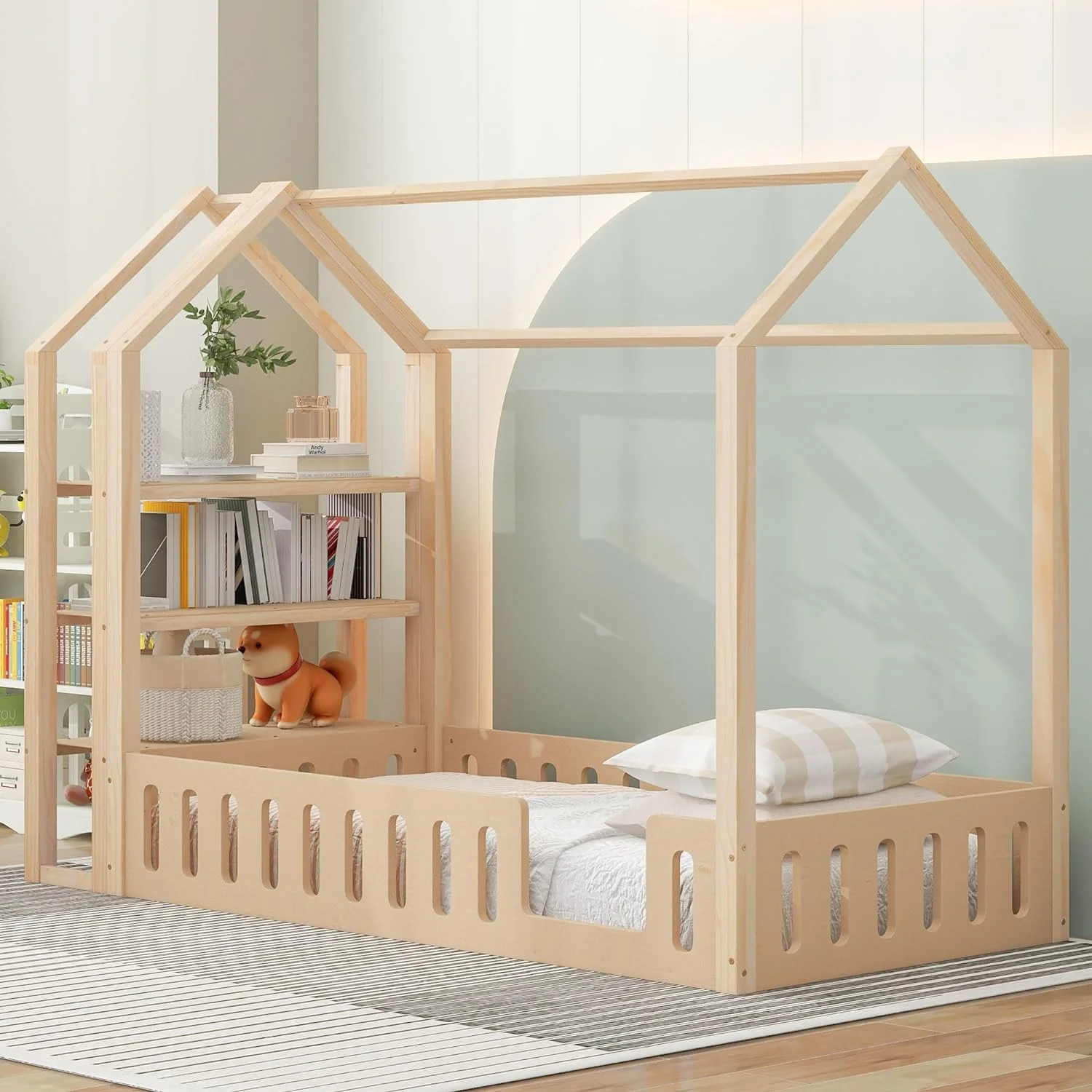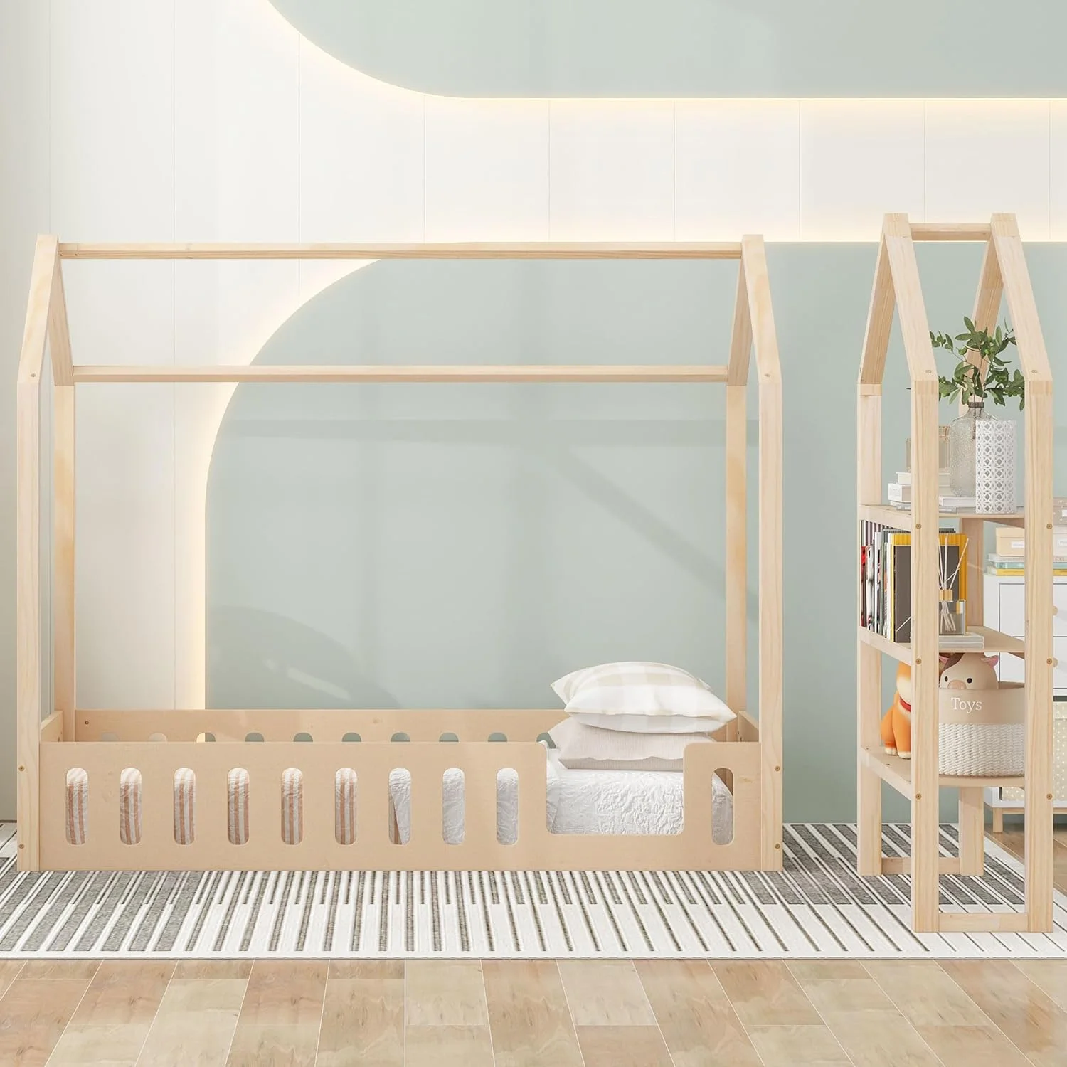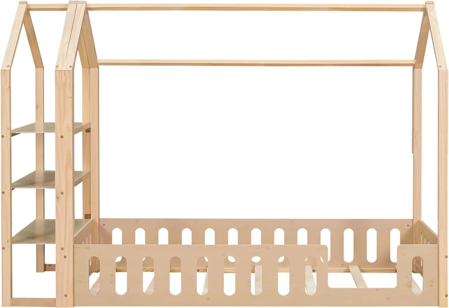 Momspeace Twin Size House-Shaped Floor Bed for Children with 2 Detachable Stands, Solid Wood, White