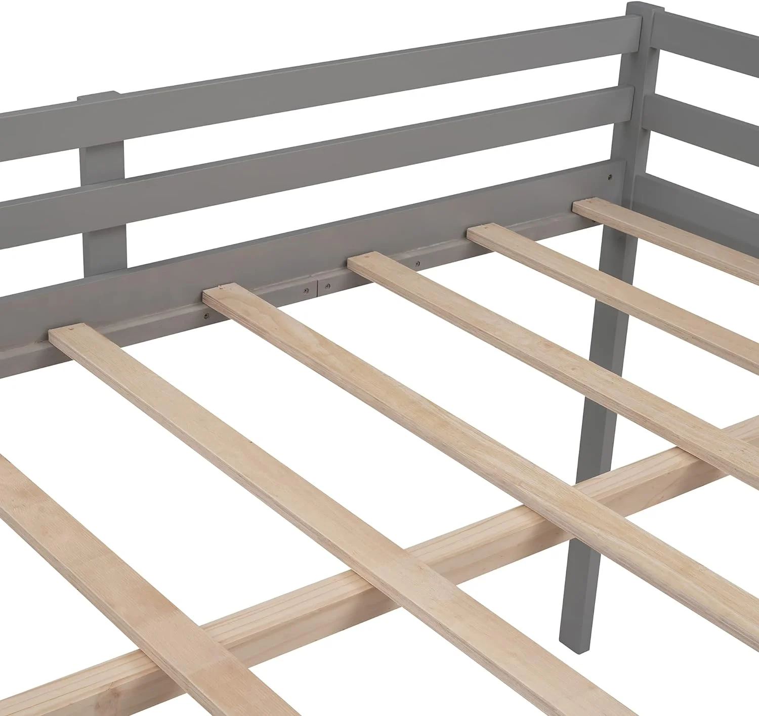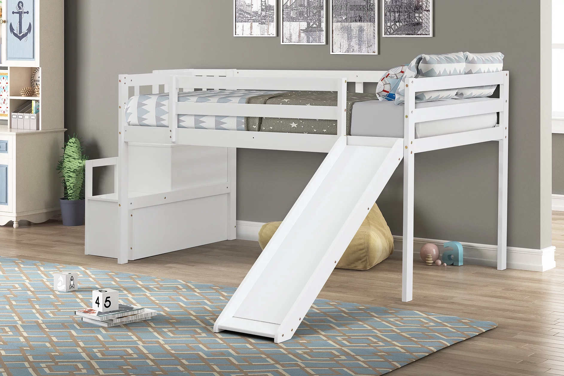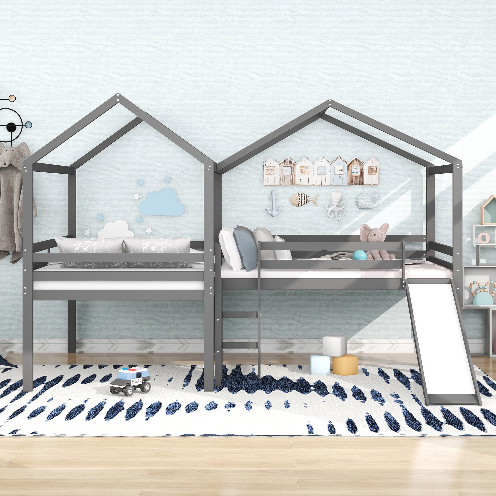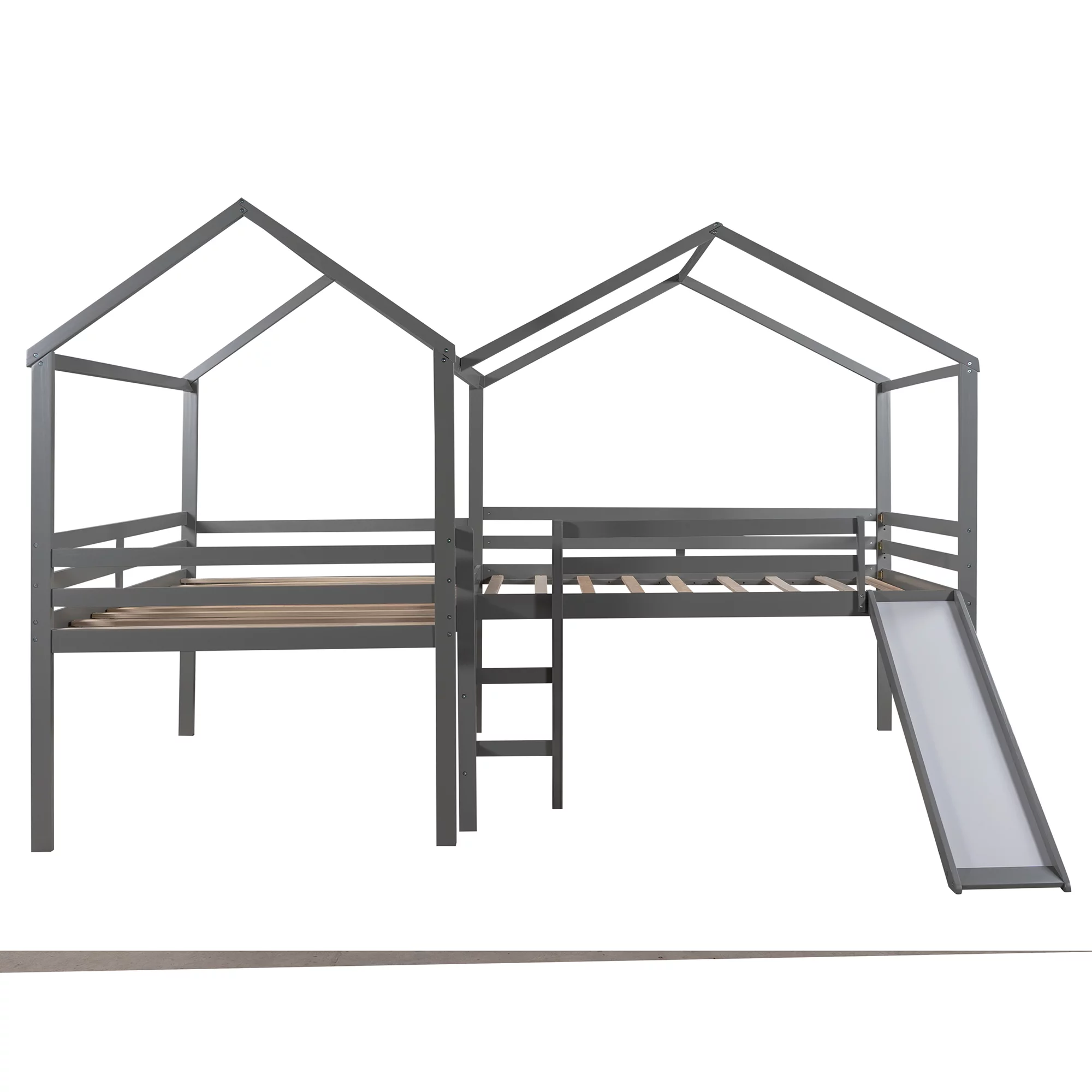 Full Size Low Loft Bed With Slide And Built-In Ladder, Full Loft Bed For Kids Boys Girls(Gray Full Loft)