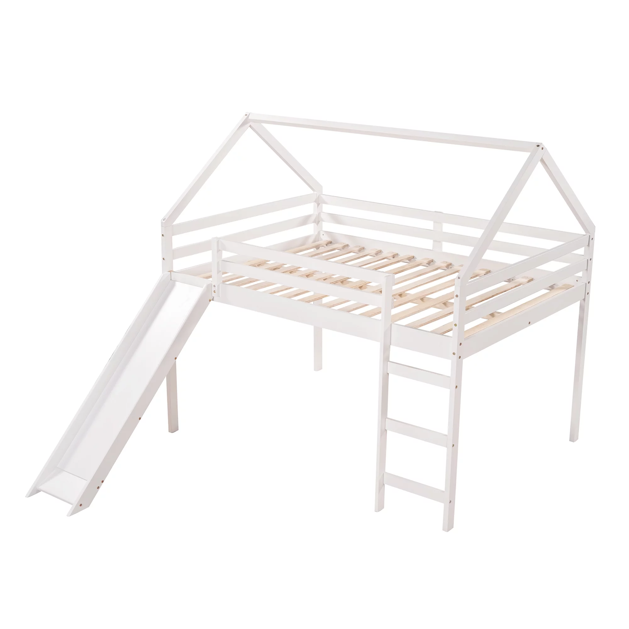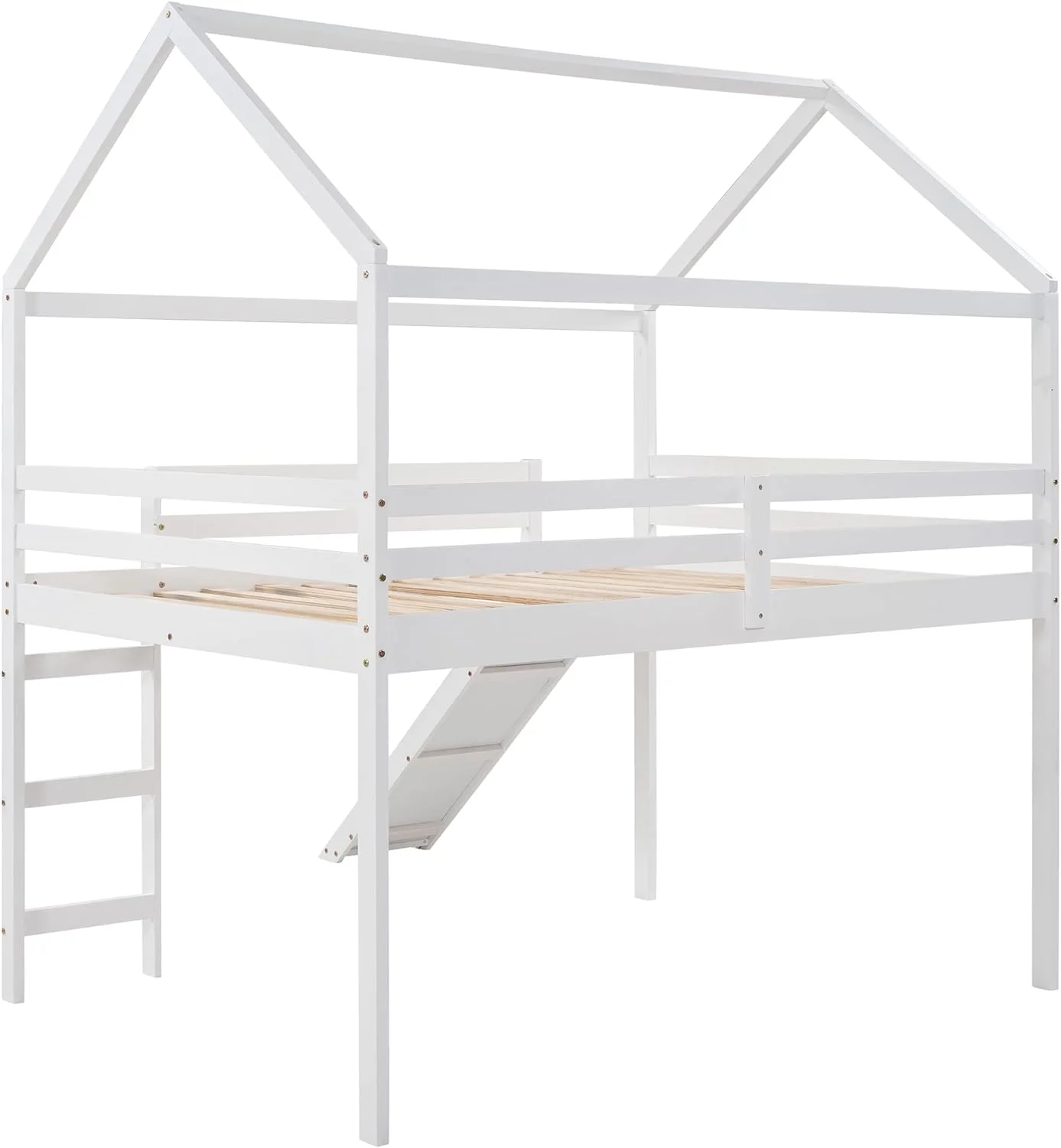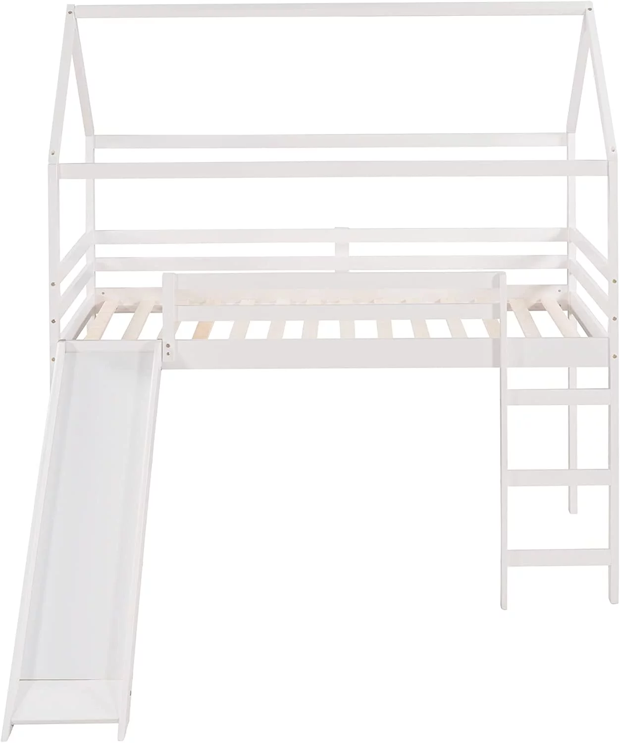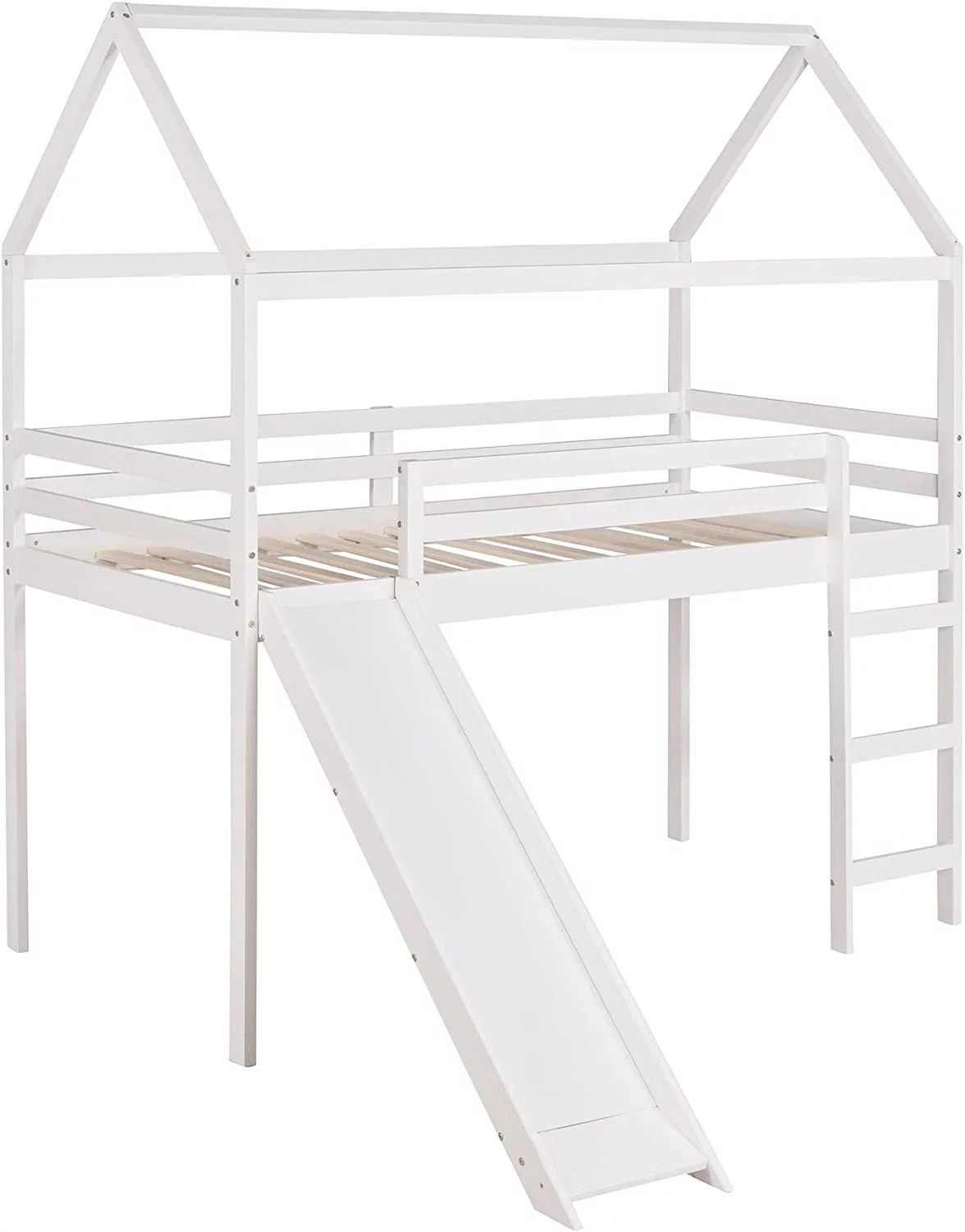 Full Size Loft Bed With Slide And Ladder, Wood House Bed Frame With Roof For Kids Boys Girls, White