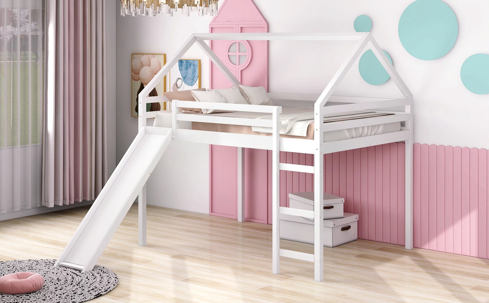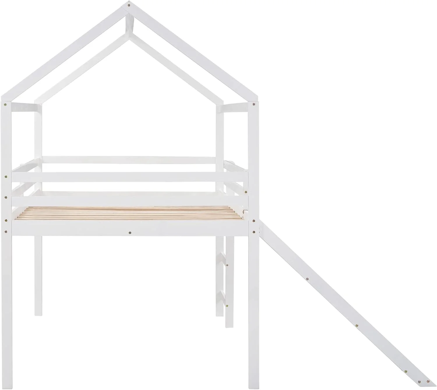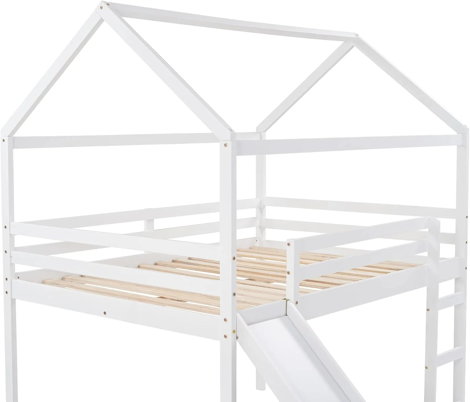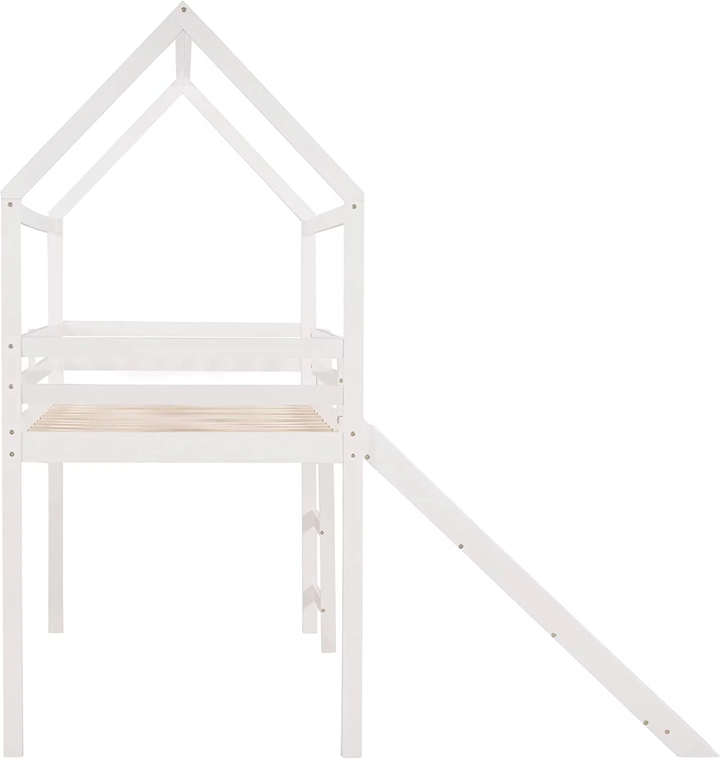 Full Size Loft Bed With Slide And Ladder, Wood House Bed Frame With Roof For Kids Boys Girls, White
