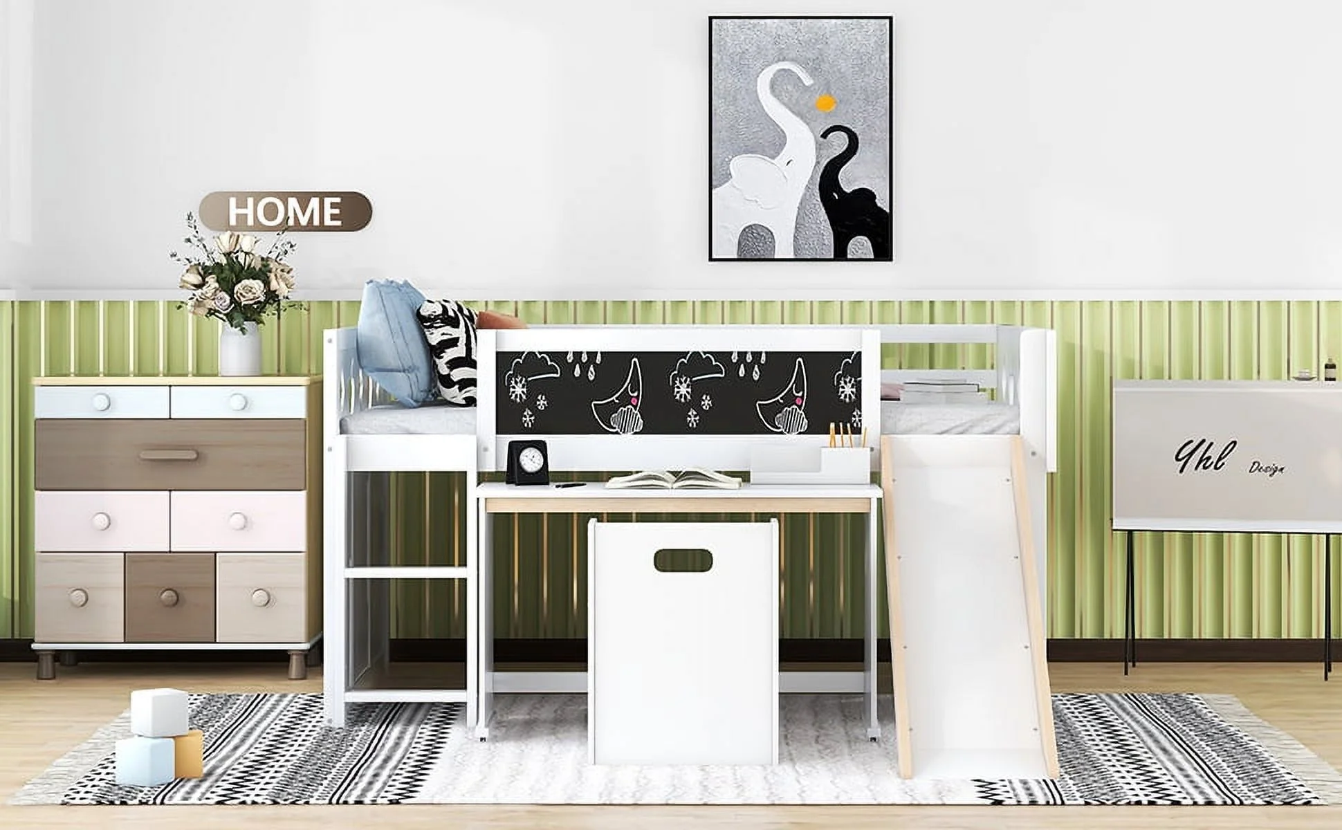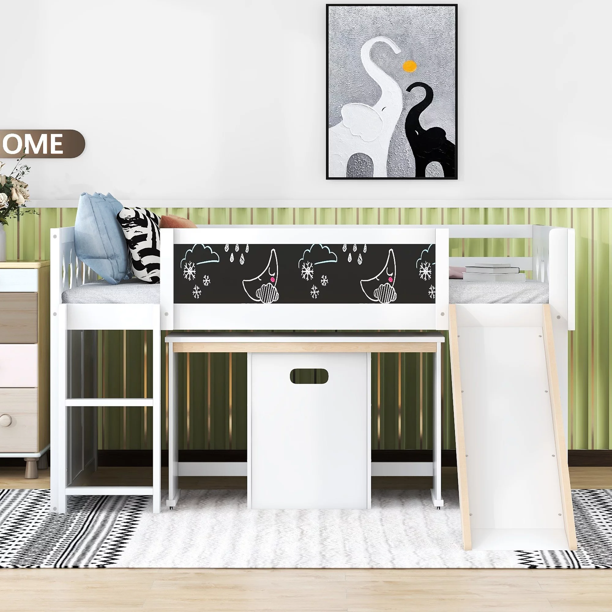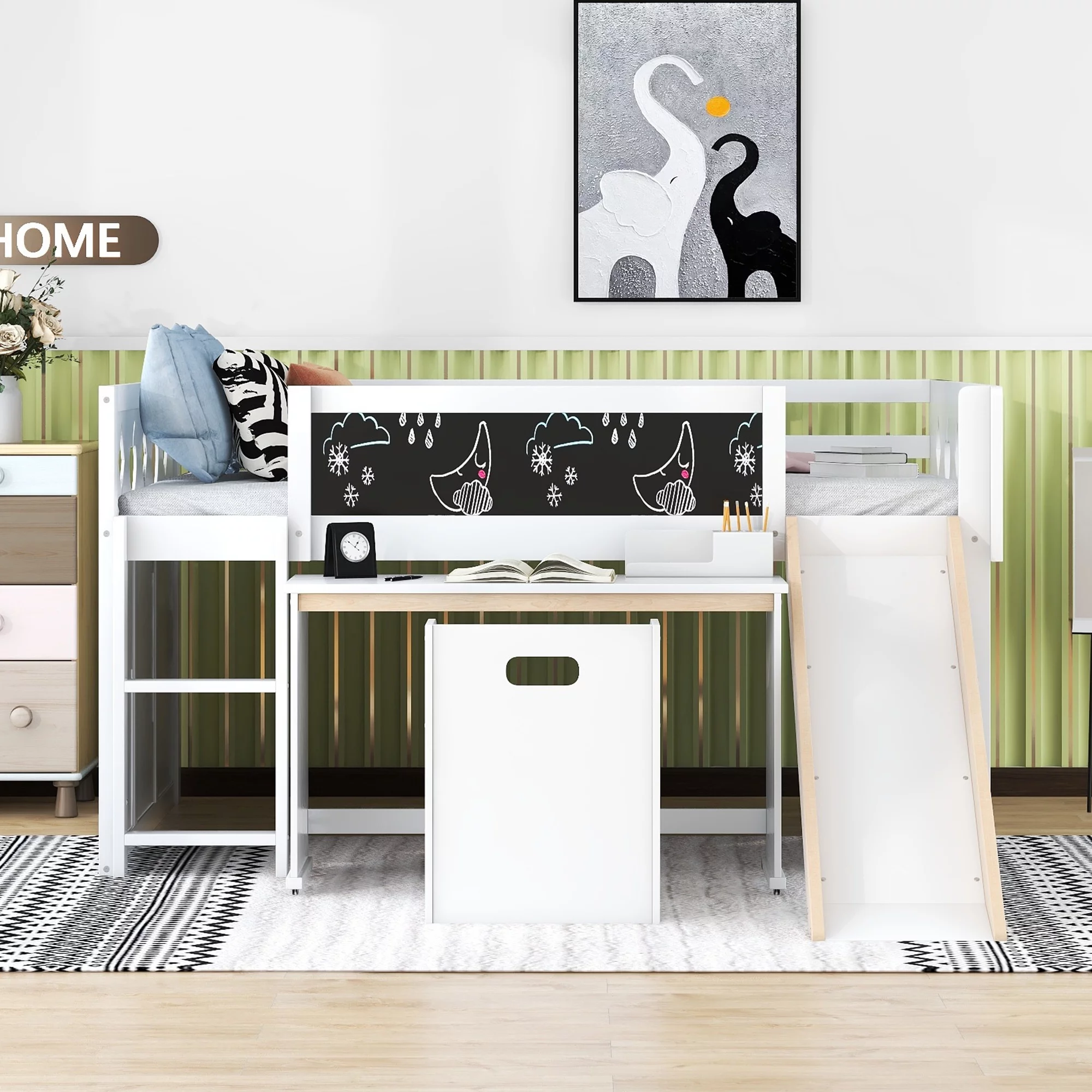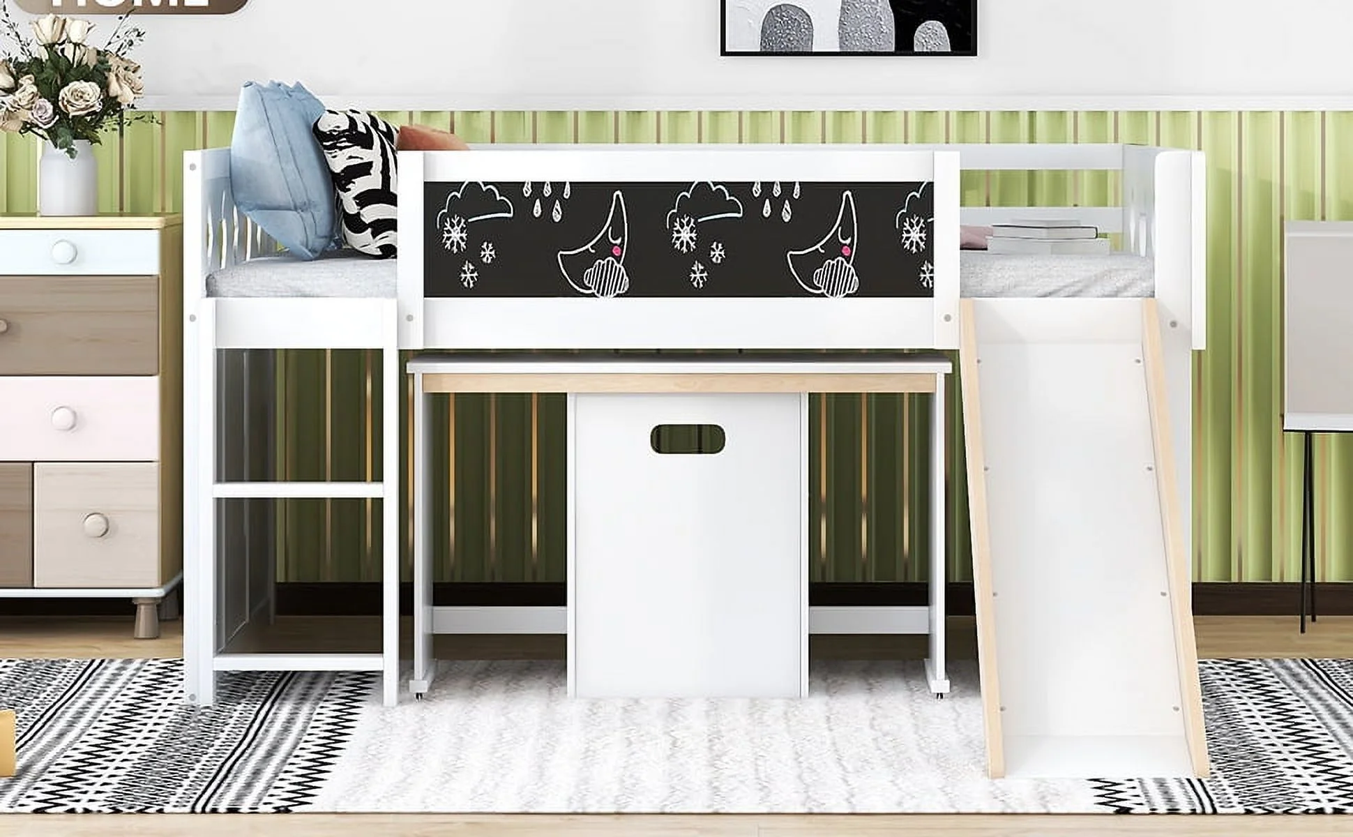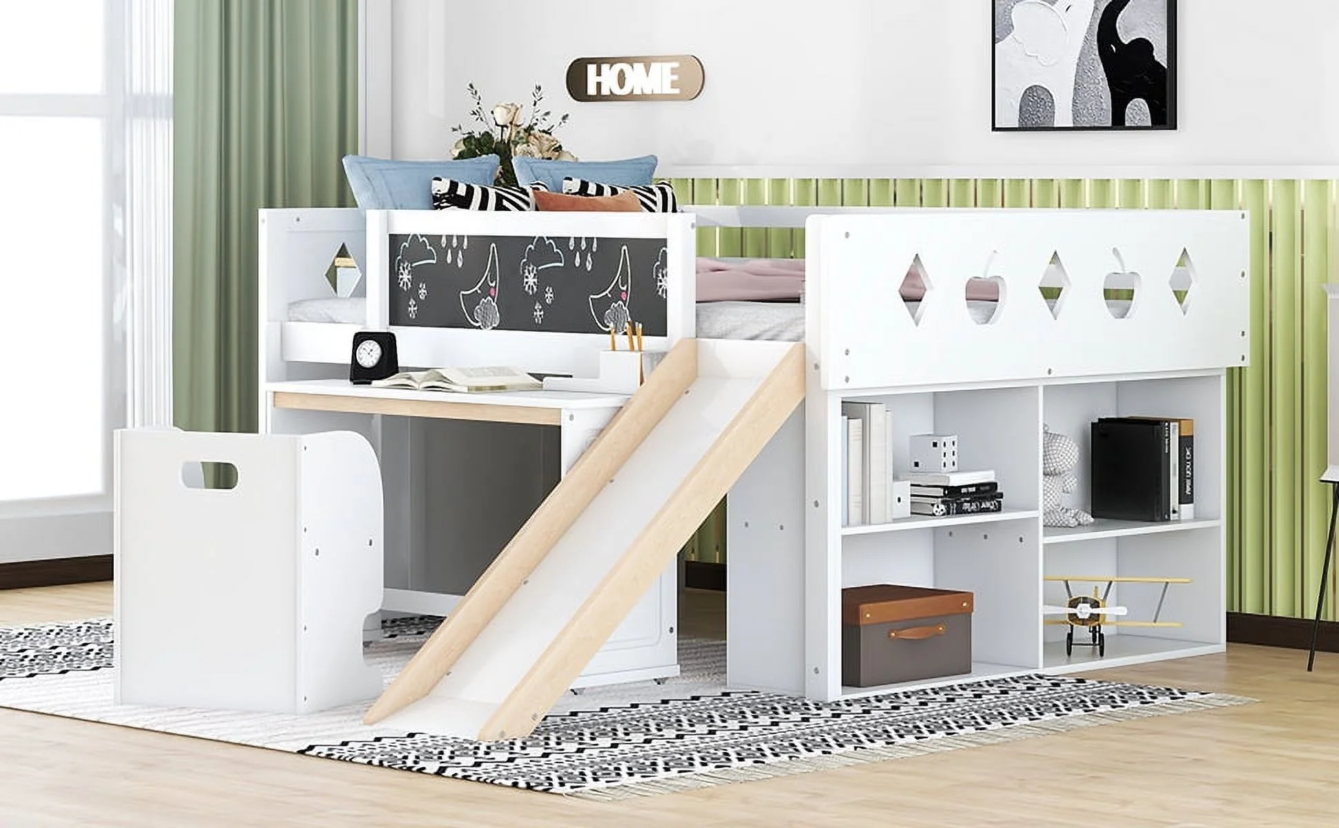 Wood Full Size Loft Bed with Slide, 4 Cabinets, Blackboard, Desk and Chair, White
