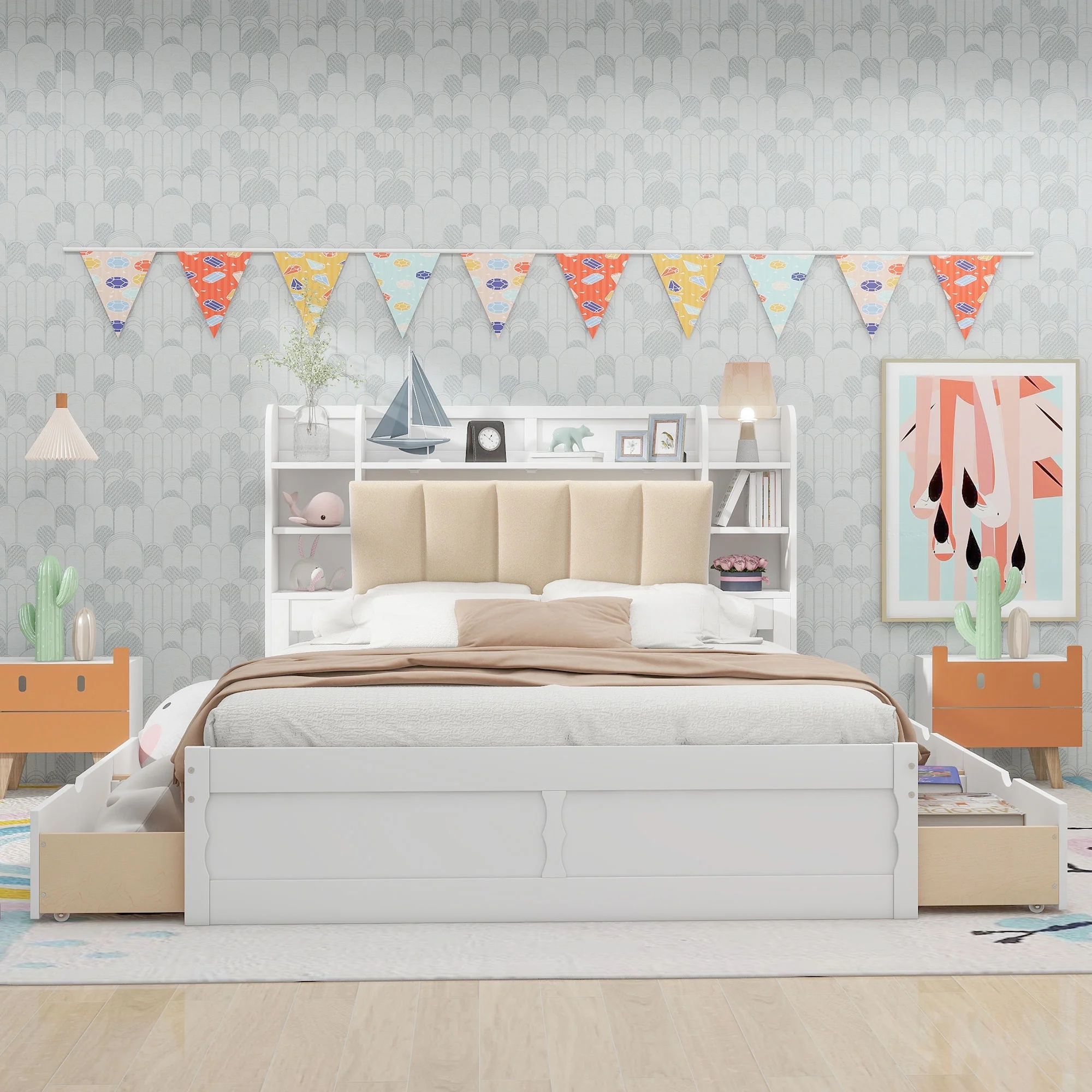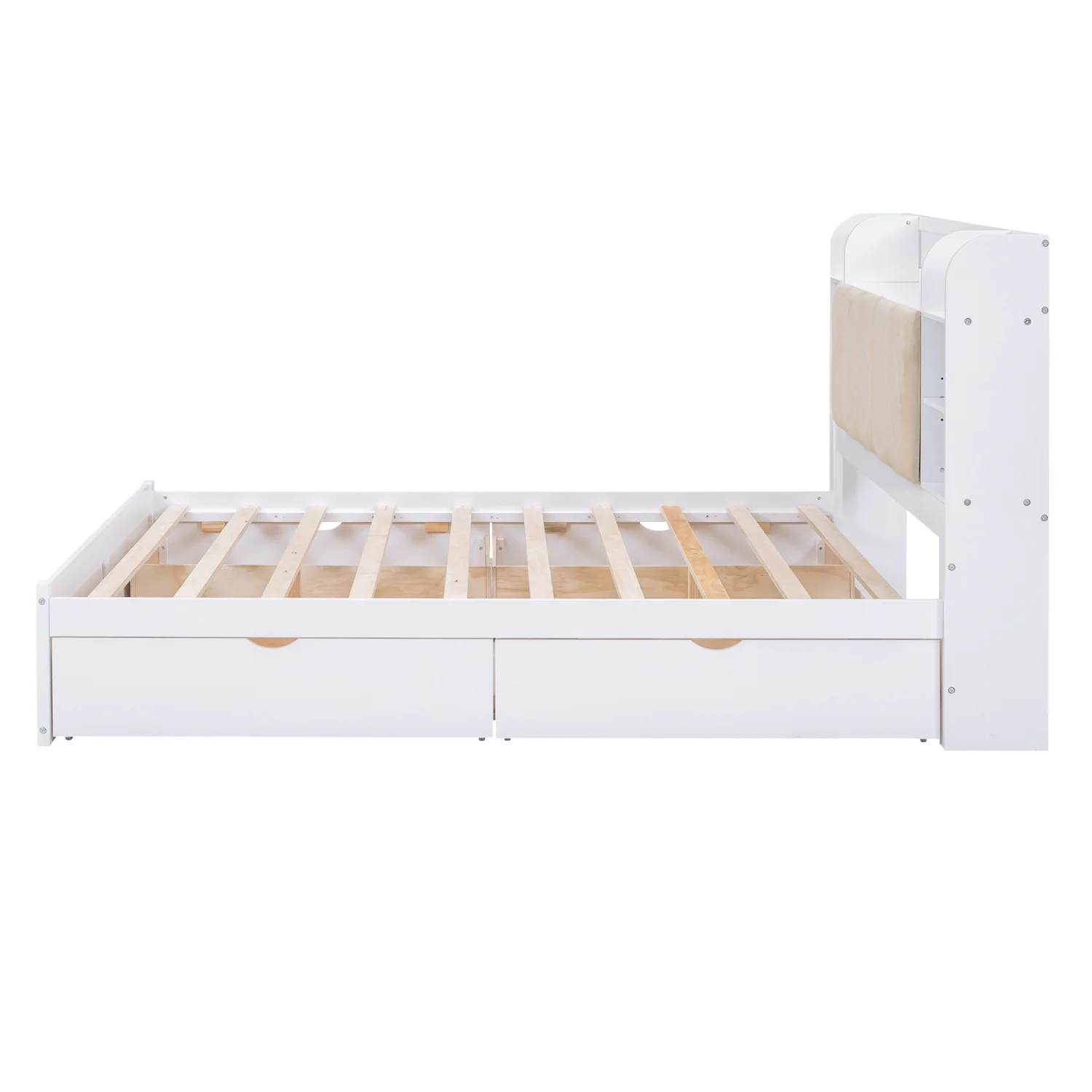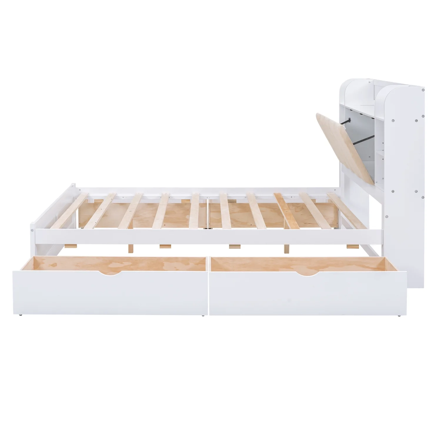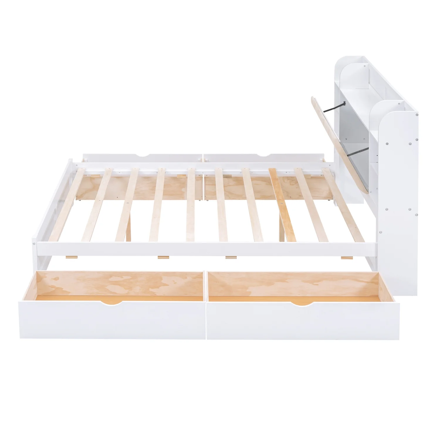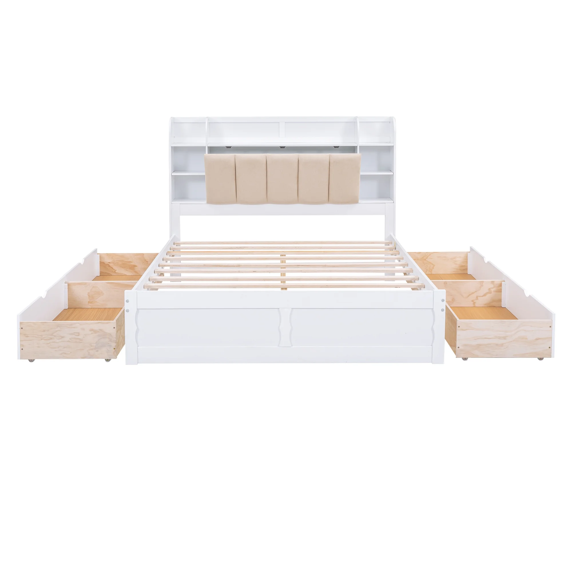 Churanty Queen Size Platform Bed with Storage Bookcase Headboard, Wood Platform Bed Frame with Shelves and 4 Drawers,White