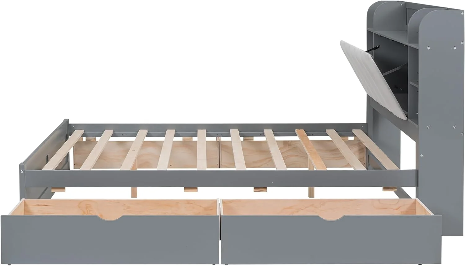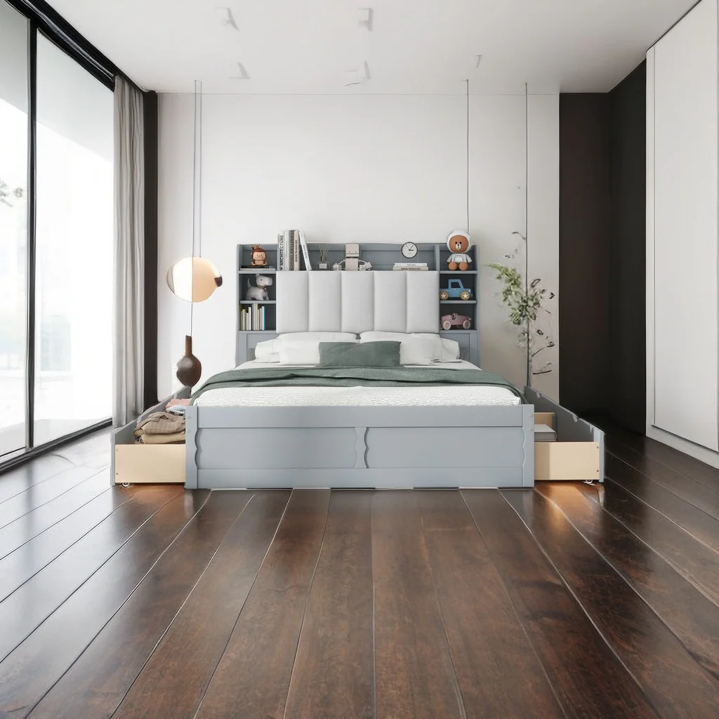 Wood Queen Size Platform Bed with Storage Bookcase Headboard, Shelves and 4 Drawers,No Box Spring Needed
