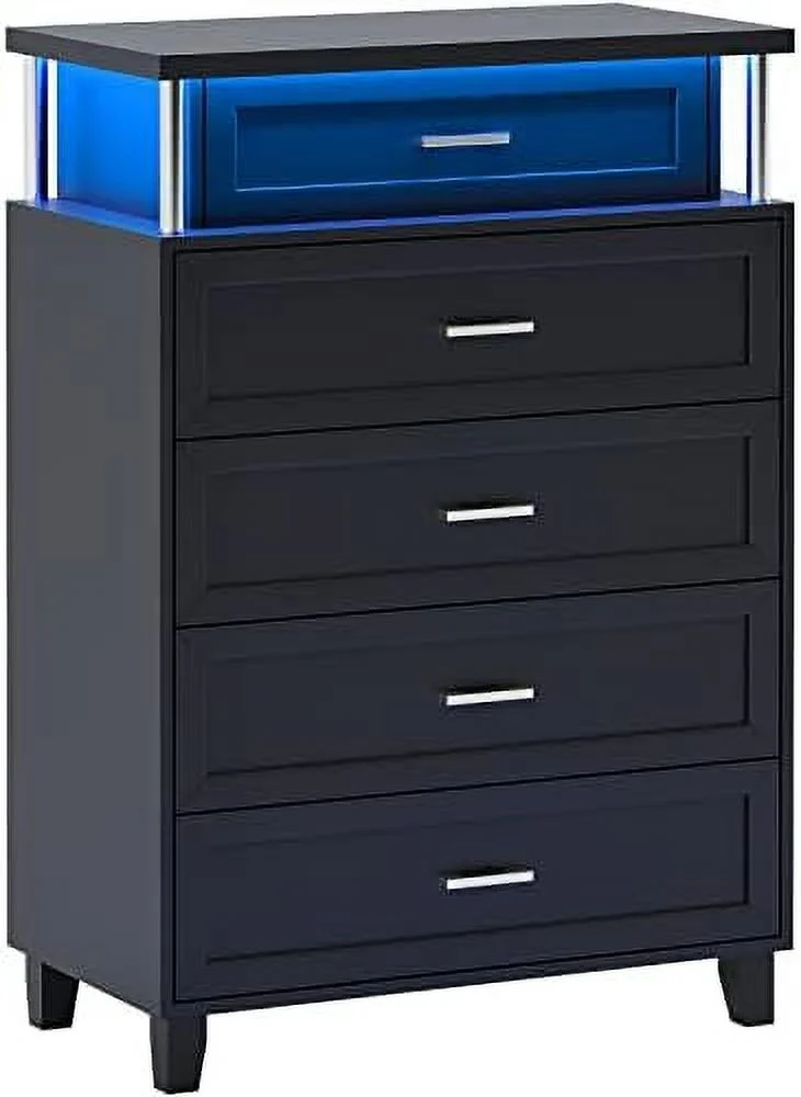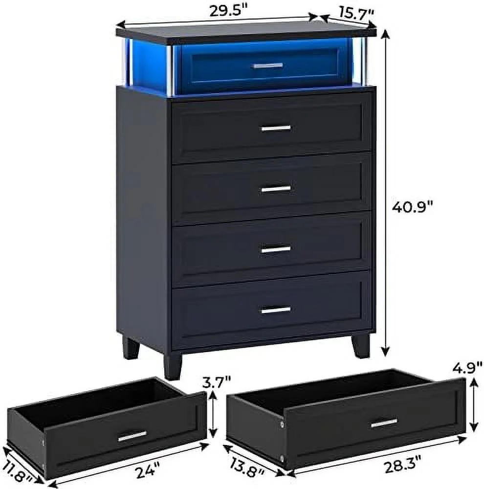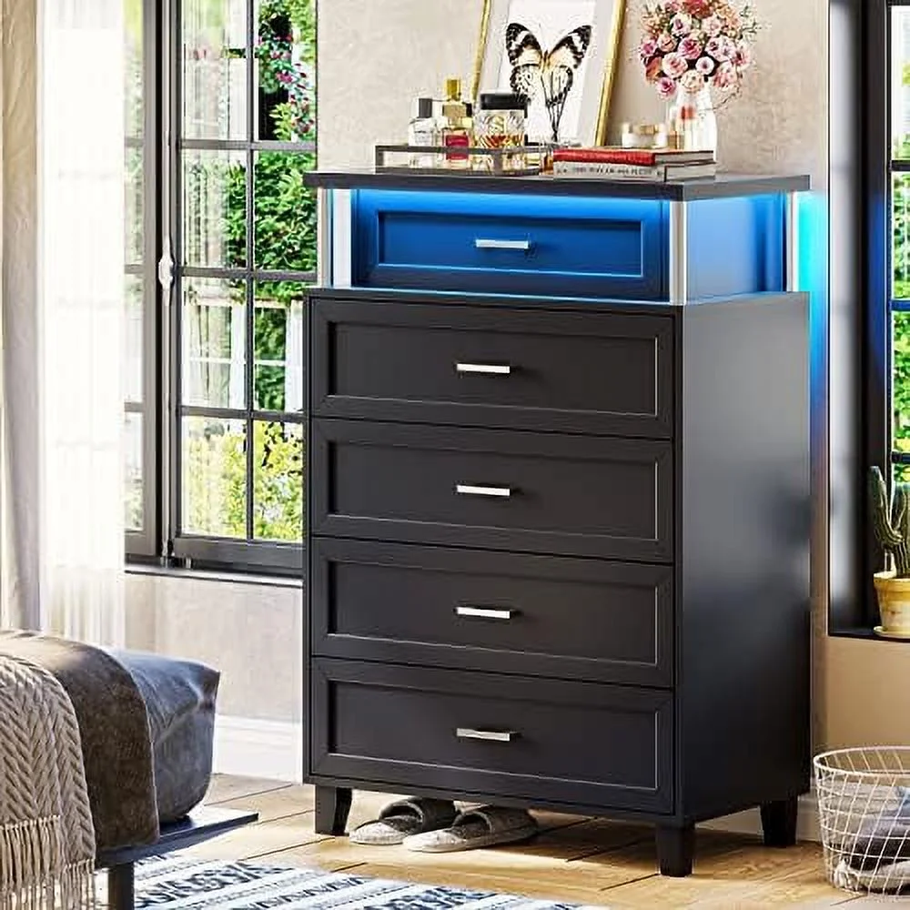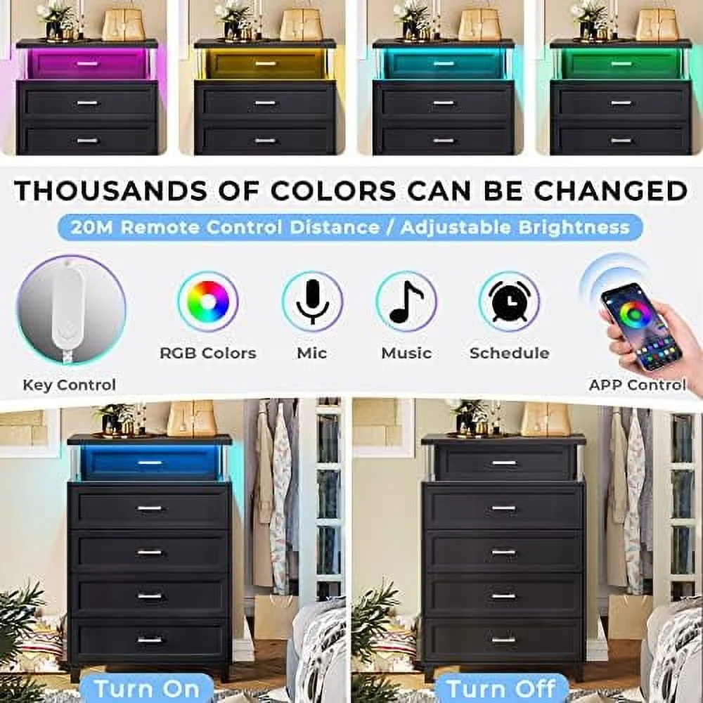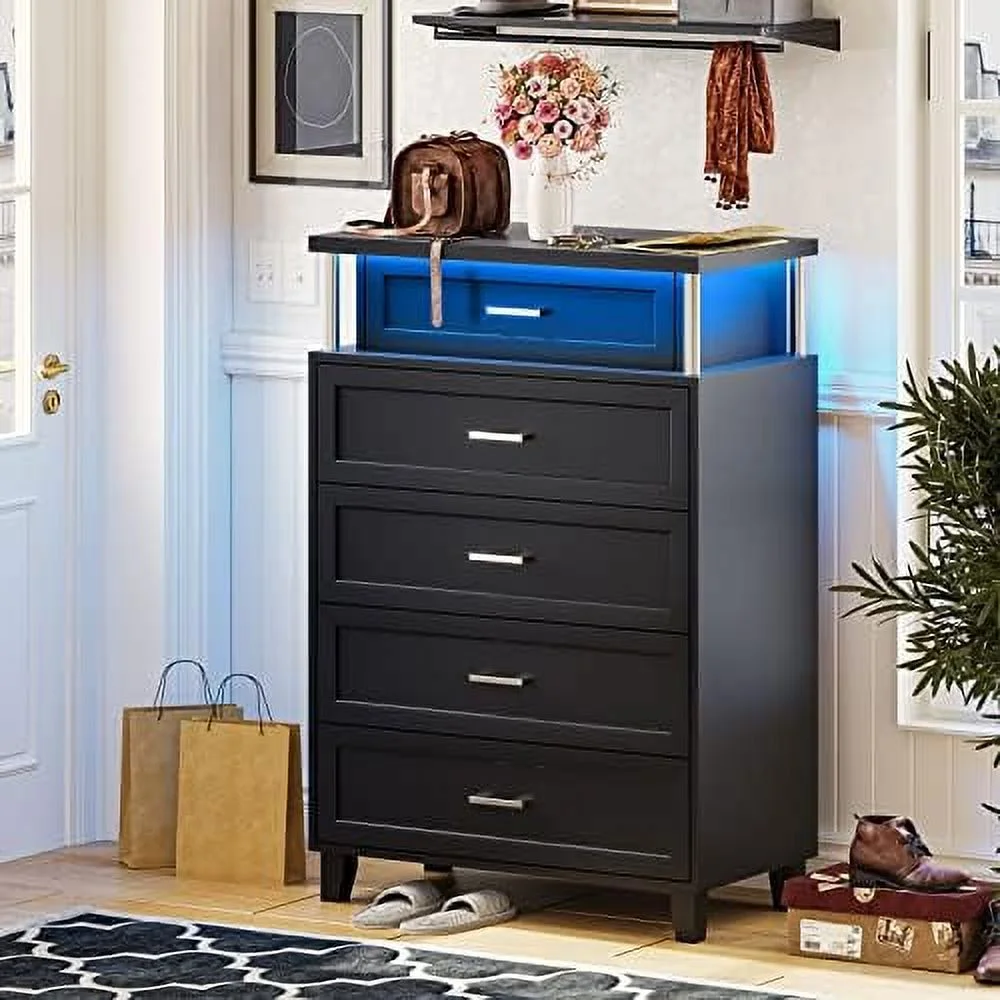 BizChair 4 Drawer Wood Top Black Cast Iron Frame Vertical Storage Dresser with Dark Gray Easy Pull Fabric Drawers