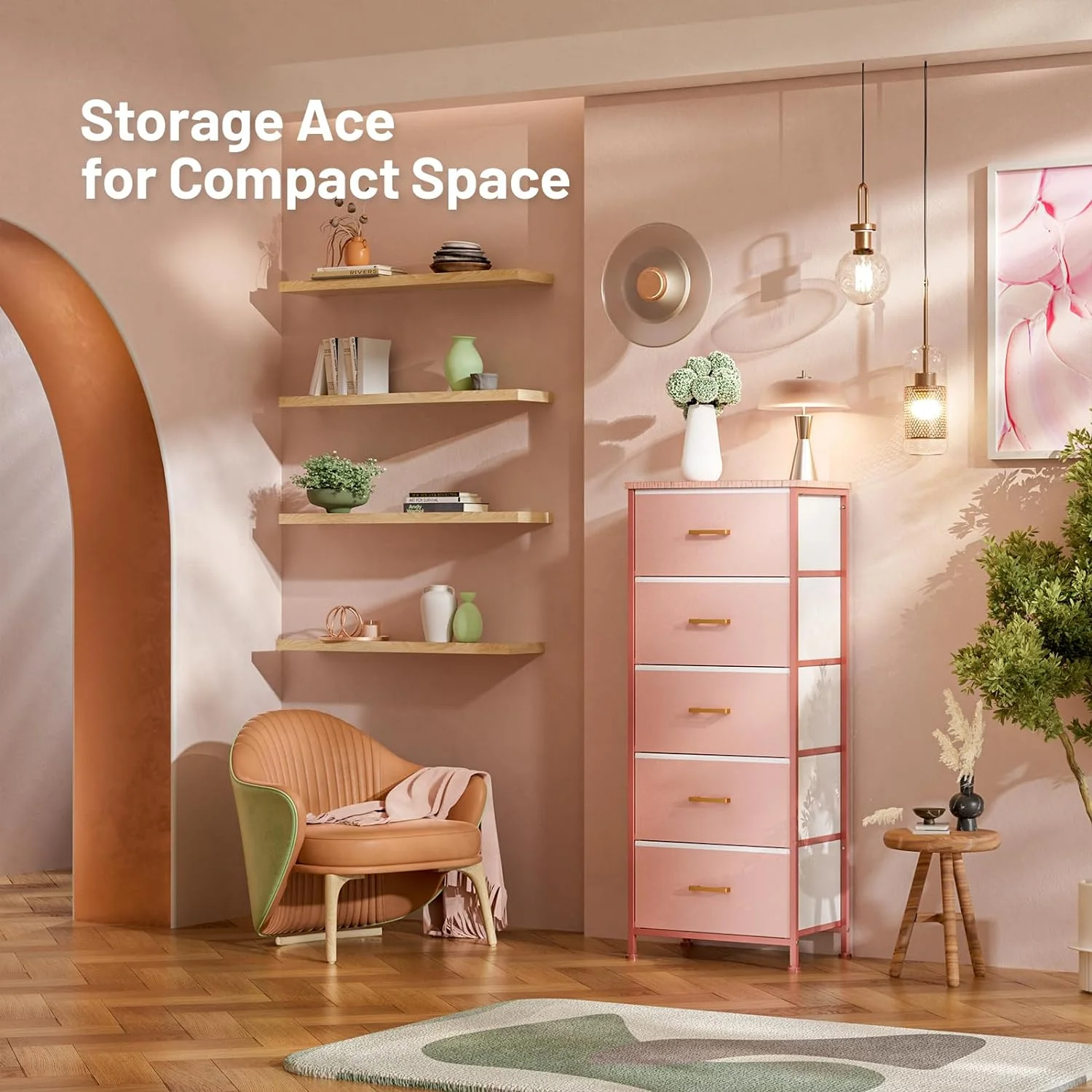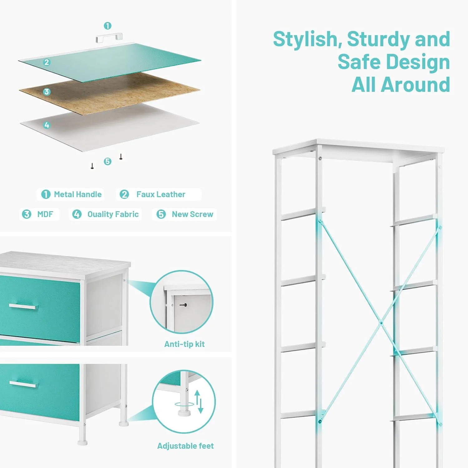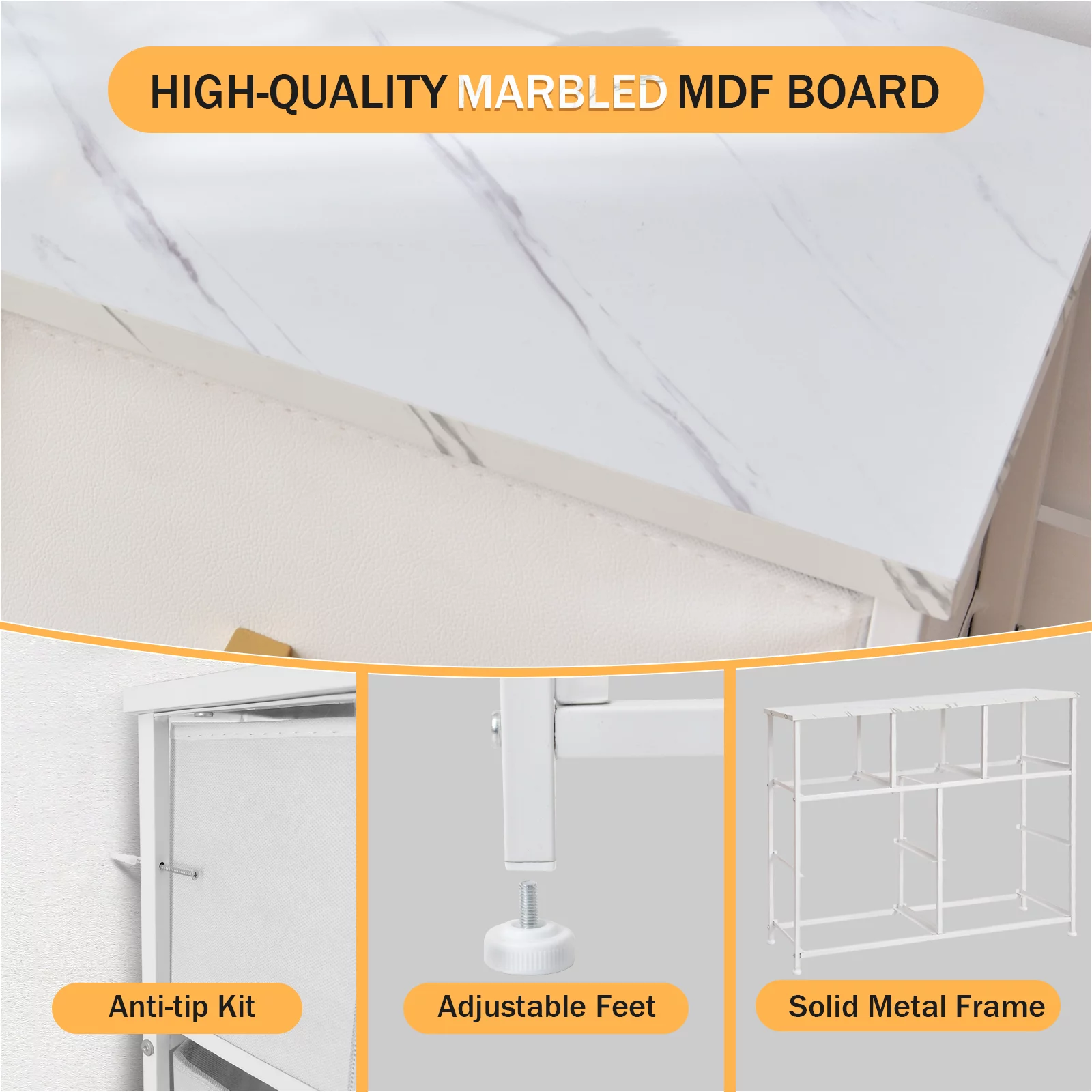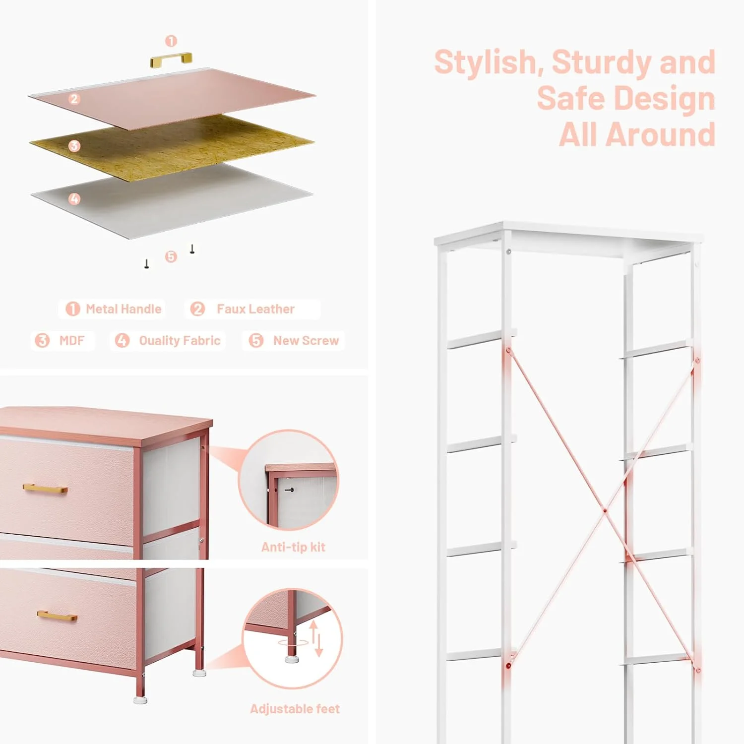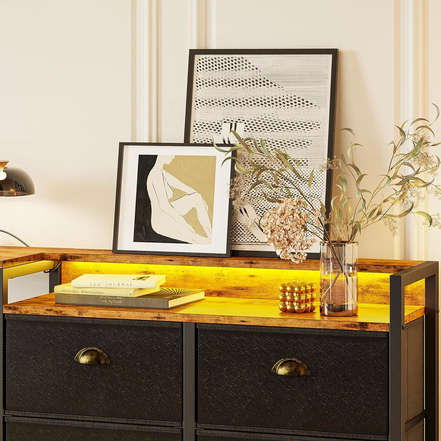 Dresser for Bedroom with 5 Drawers, Leather Finish, Wood Top, Fabric Bins