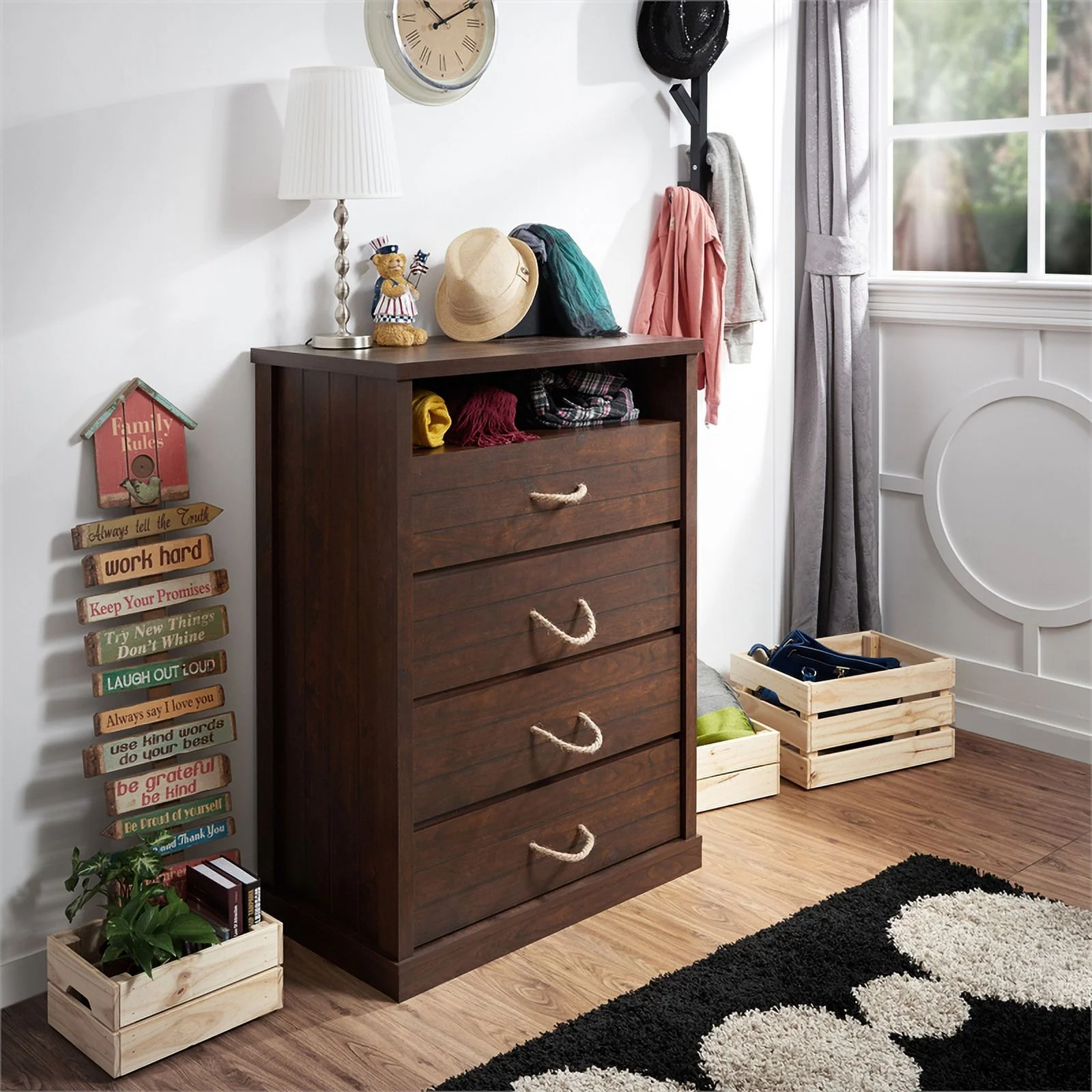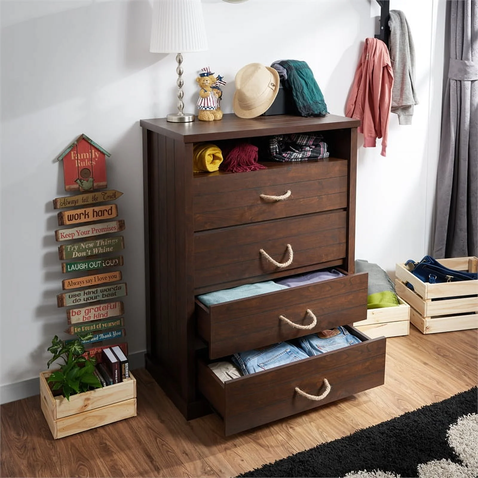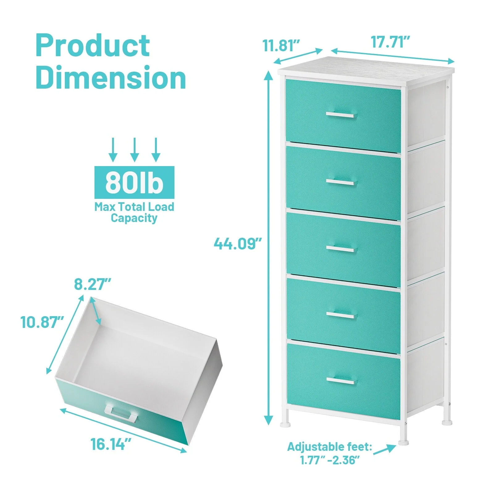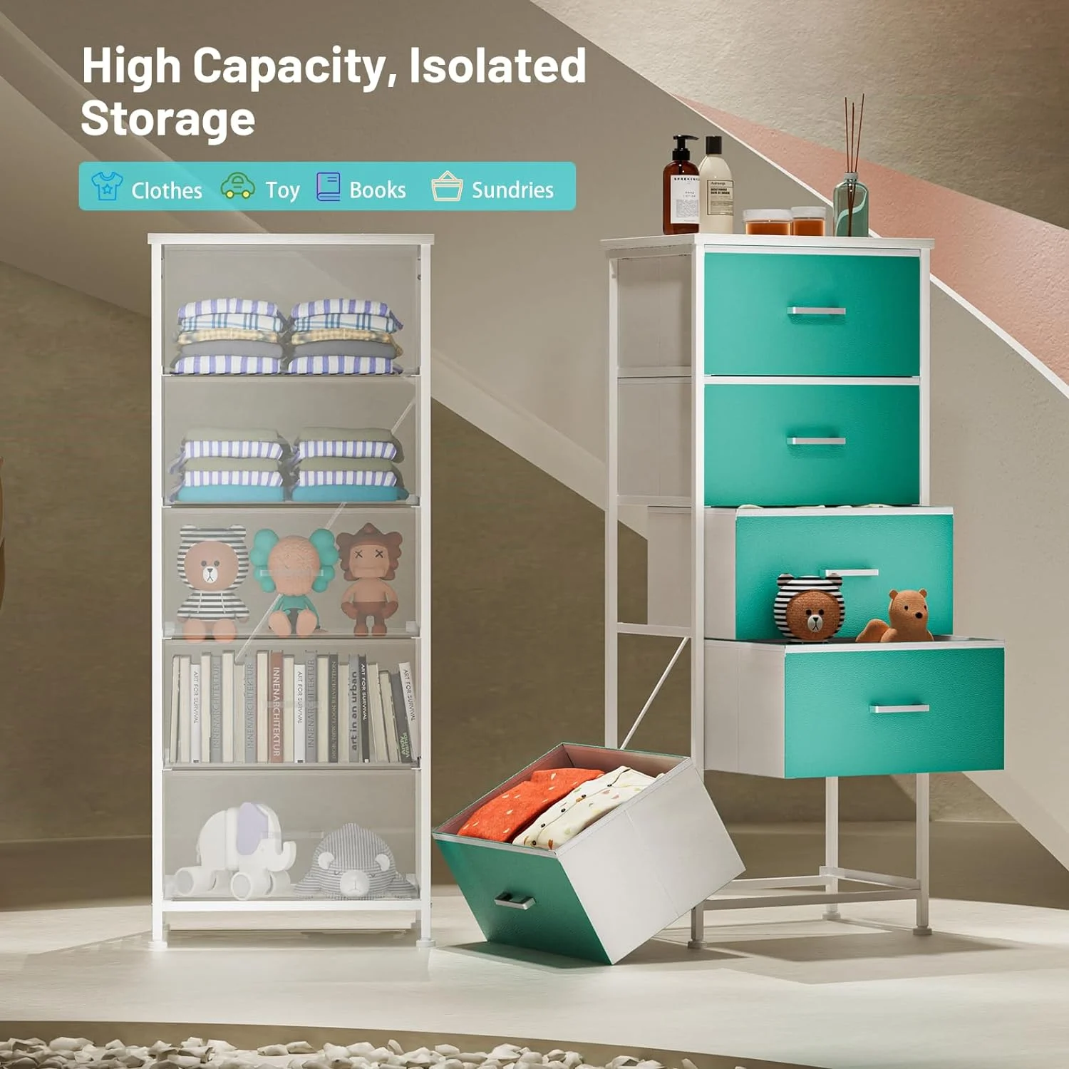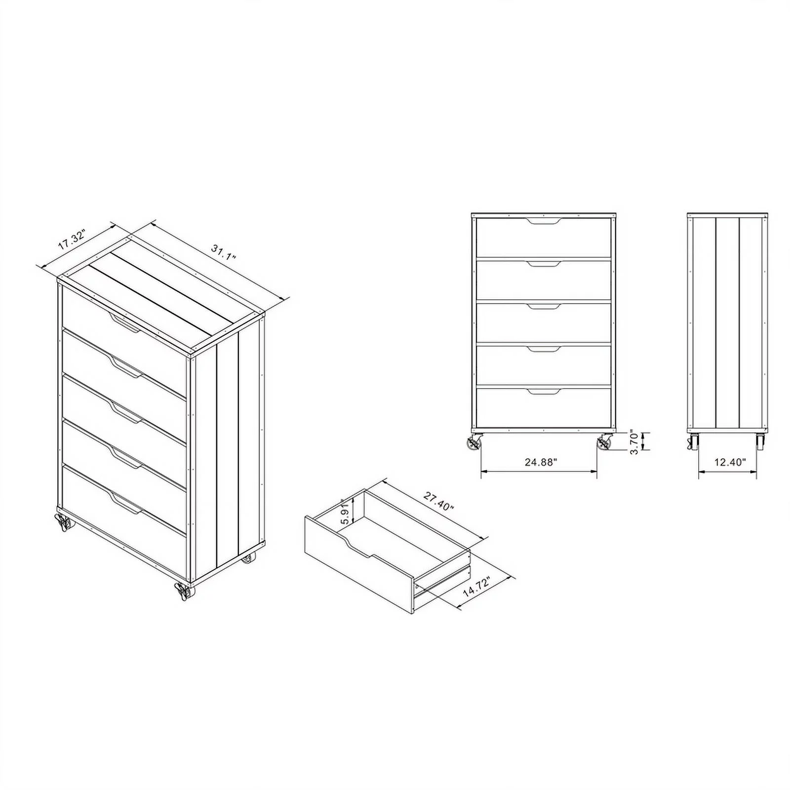 Dresser for Bedroom with 5 Drawers, Leather Finish, Wood Top, Fabric Bins