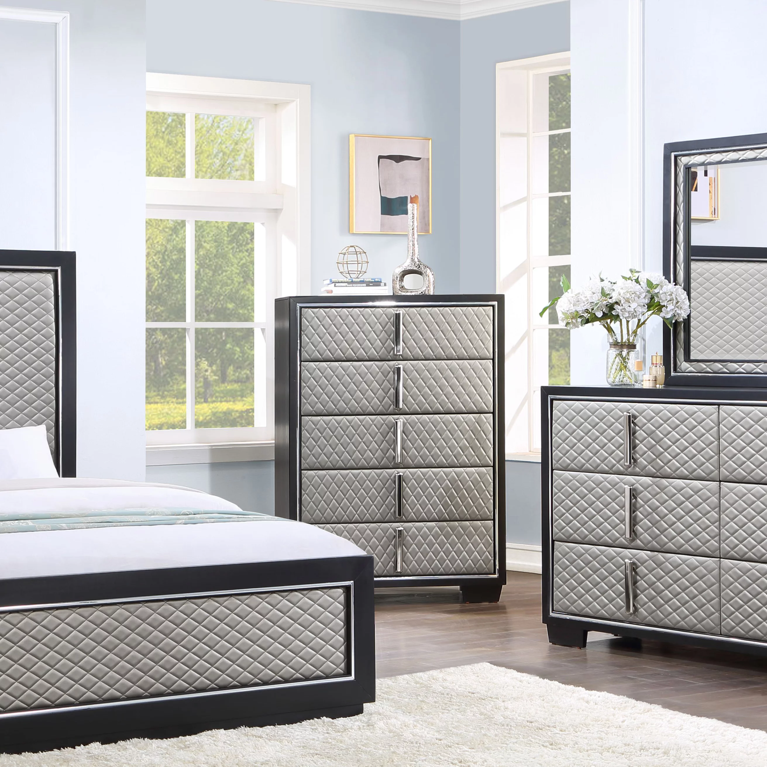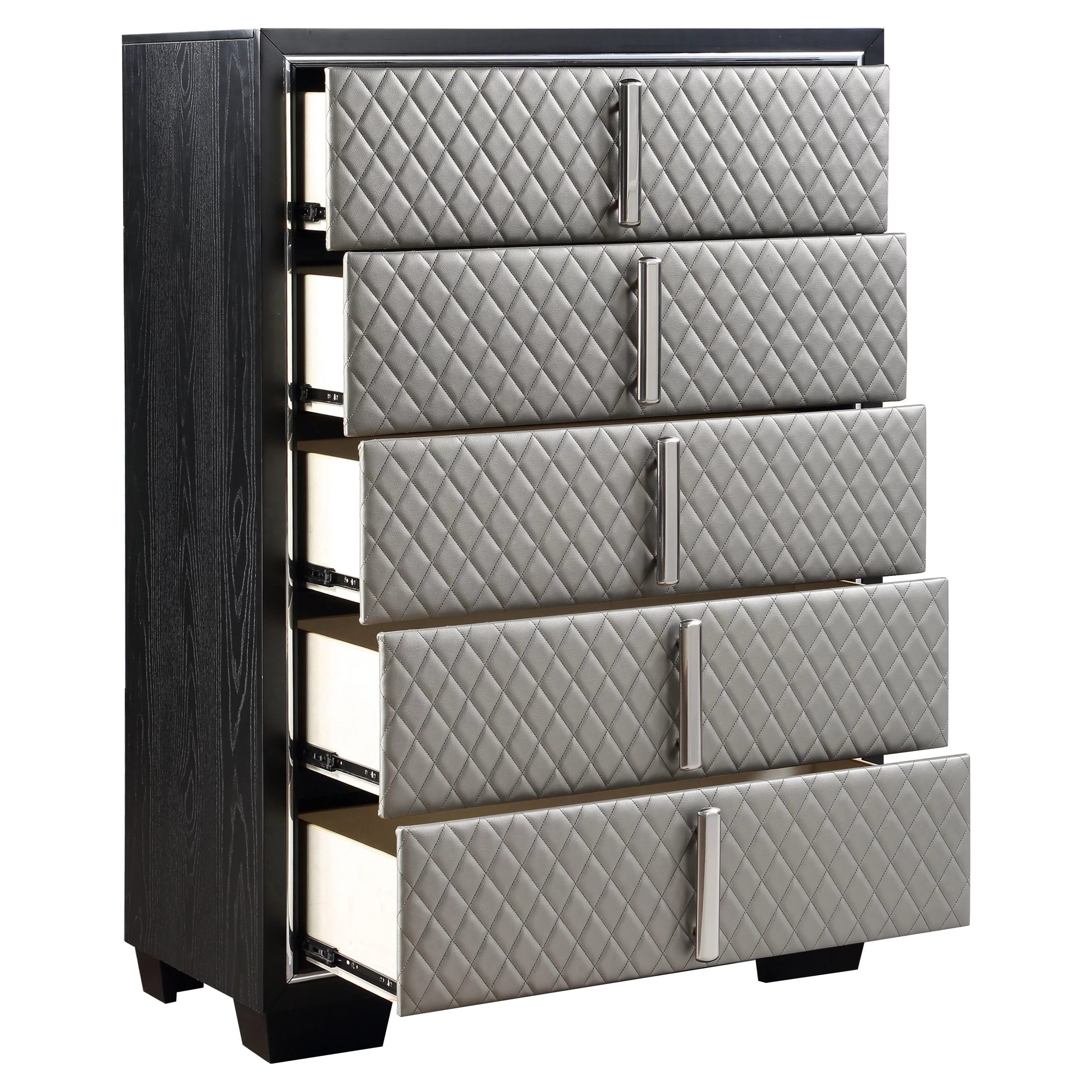 ACME Nicola 5 Drawers Wooden and Faux Leather Chest in Silver and Black