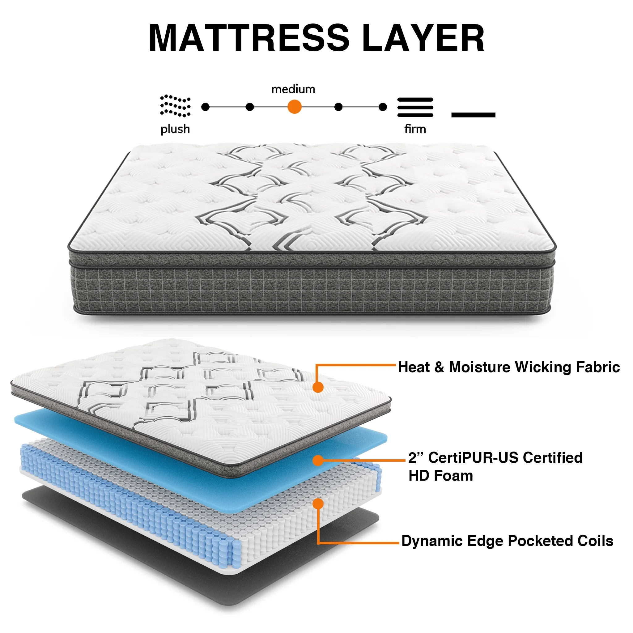Glavbiku Twin Size Hybrid Mattress in a Box,12.5" Euro-Top for Bedroom,Medium Feel,Adult